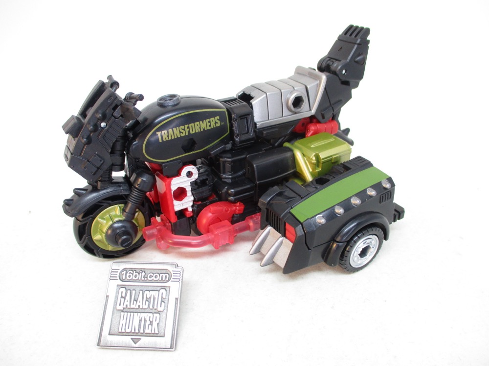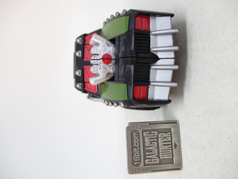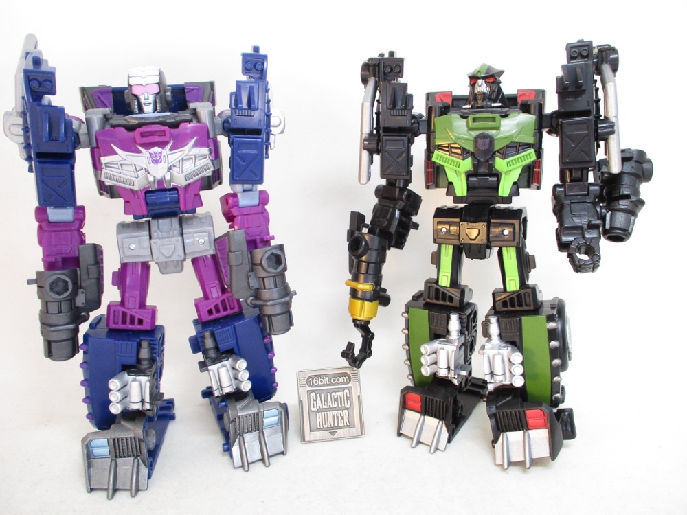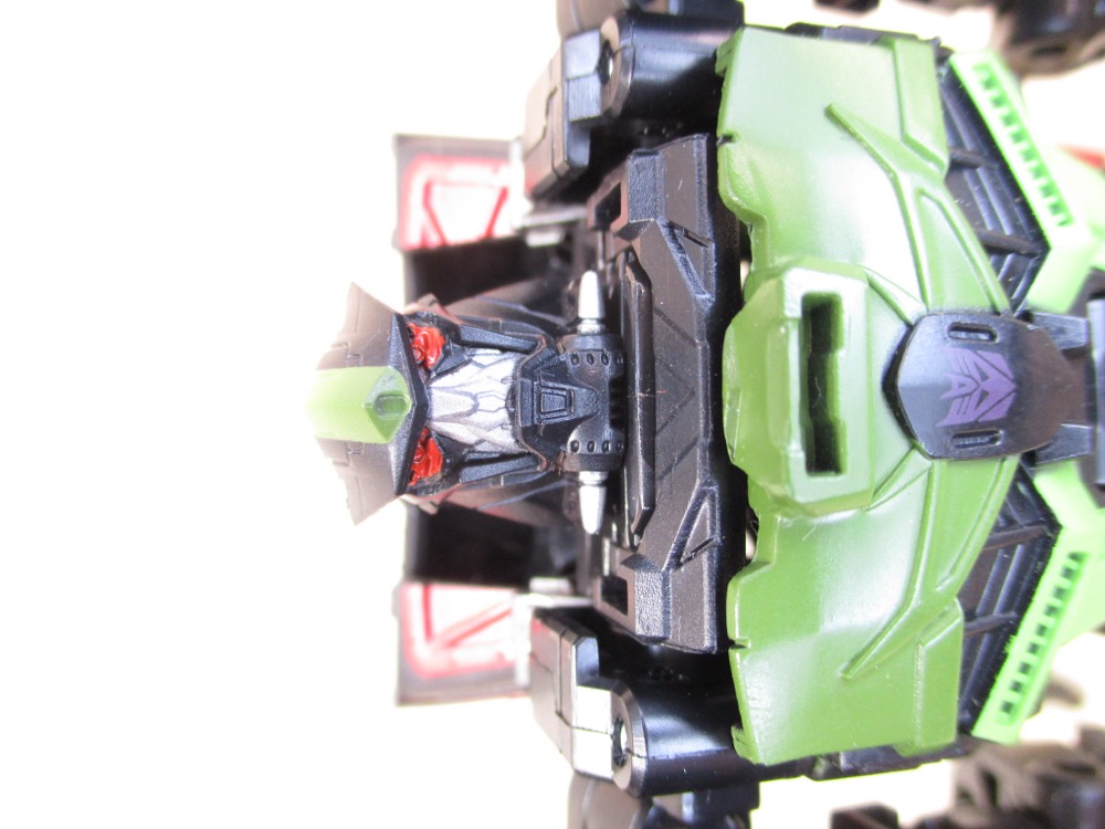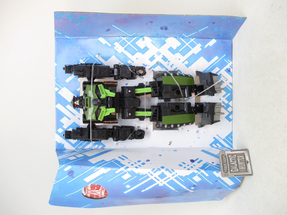 Thanks to the gimmicks, articulation is somewhat limited. The shoulders don't have a full range of movement, but you do get excellent leg movement plus rocker ankles. He can hold his blasters nicely, and there are plenty of 5mm ports to slap his stuff. The deco is sensible, better than expected with painted silver spikes and two shares of green on his person. I think they got almost everything right, as the colors give him a lot of personality. I assume because they were inspired by the aforementioned Revenge toy, but he has a Decepticon logo on his chest and not a Star Seeker/Star Raider one. It would be nice if he was marked as a part of the team, or not marked at all given his origins as a gun-for-hire. Maybe the character found a Decepticon chest plate at some point and said "eh, good enough?"