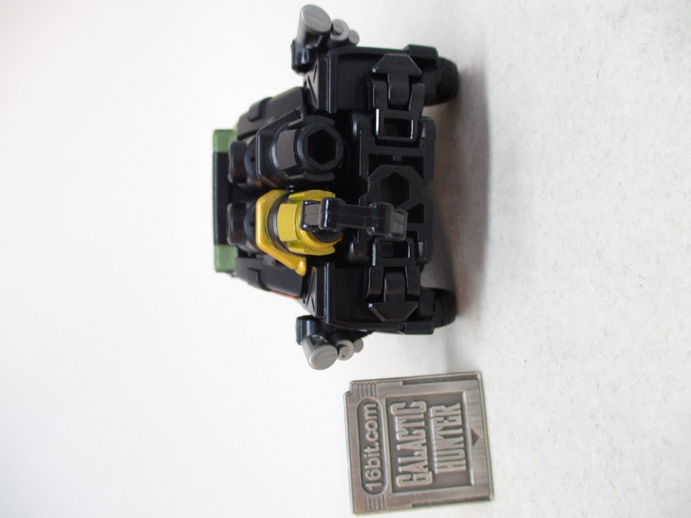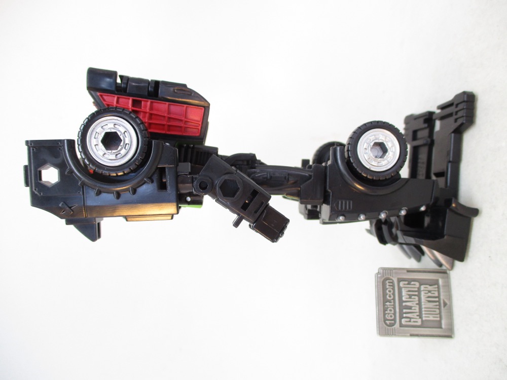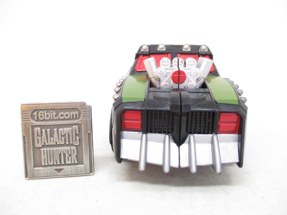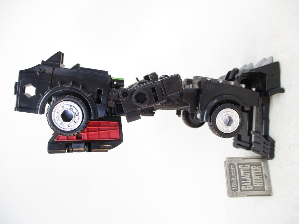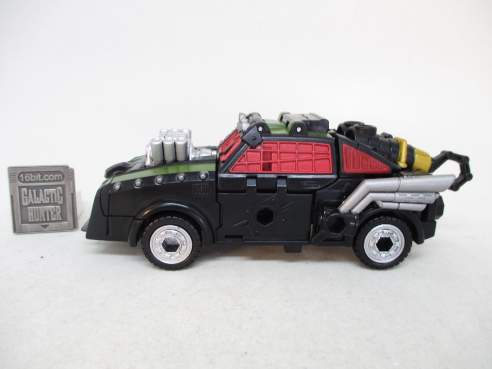 The car is pretty much perfect. Most of Lockdown's incarnations are some sort of black par with red windows, green paint, and silver spikes. It's sort of punk rock, it's a little Frankenstein's Monster, and it's a muscle car that you don't want to corner you in an alley. It's got a good heft to it, and you can load it up with all of his gear - everything fits in place, and I love the added gold on the thruster that recalls the original toy's mismatched arms. I wish it fit together more easily, because it's such a great car mode that I'd like to see it more often. As it is, it may stay in robot mode for a very long time after I finish writing this review. The hook is a nice bonus, so he can tow other cars.