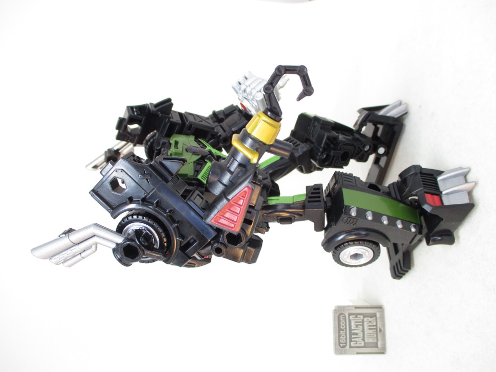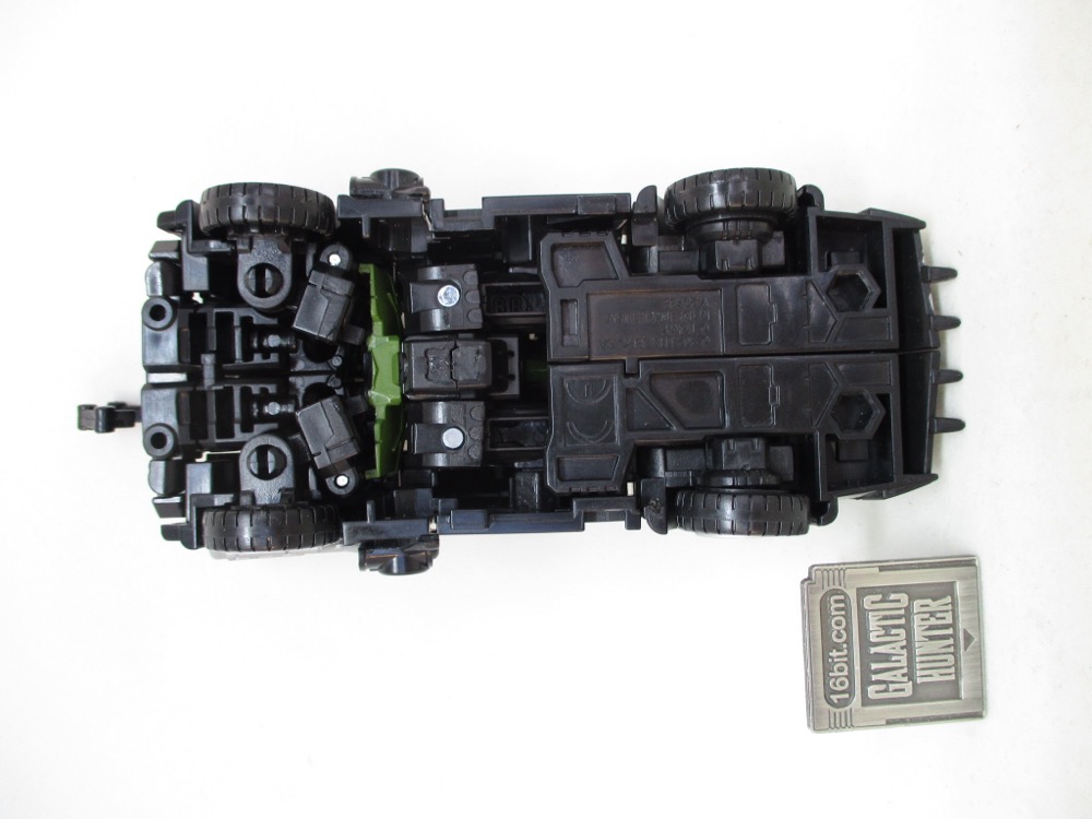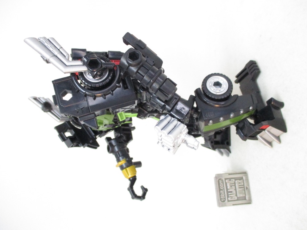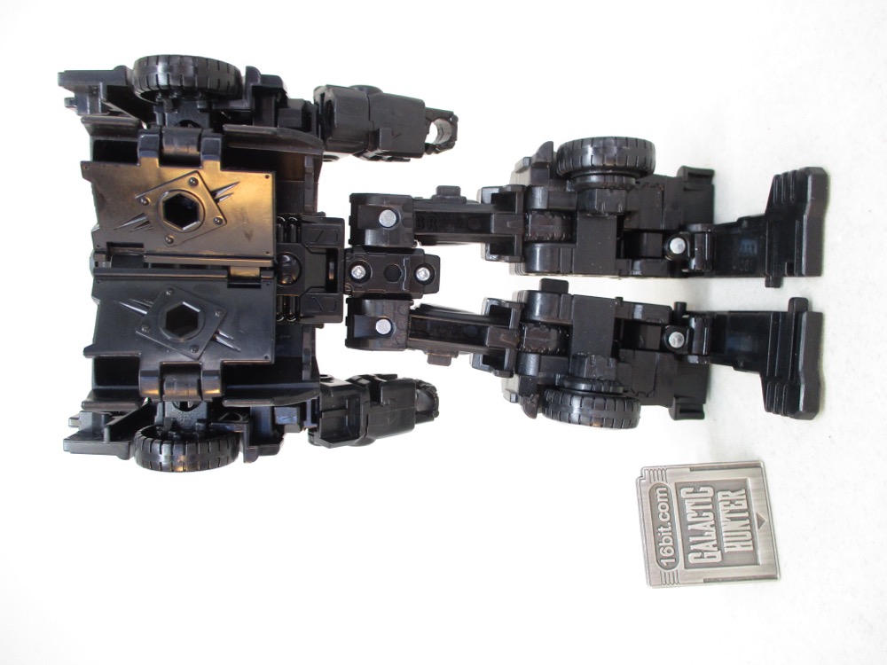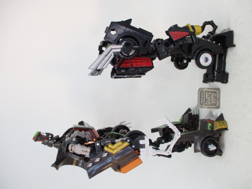 The car is pretty much perfect. Most of Lockdown's incarnations are some sort of black par with red windows, green paint, and silver spikes. It's sort of punk rock, it's a little Frankenstein's Monster, and it's a muscle car that you don't want to corner you in an alley. It's got a good heft to it, and you can load it up with all of his gear - everything fits in place, and I love the added gold on the thruster that recalls the original toy's mismatched arms. I wish it fit together more easily, because it's such a great car mode that I'd like to see it more often. As it is, it may stay in robot mode for a very long time after I finish writing this review. The hook is a nice bonus, so he can tow other cars.