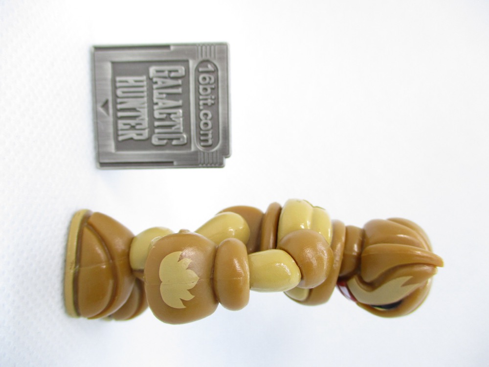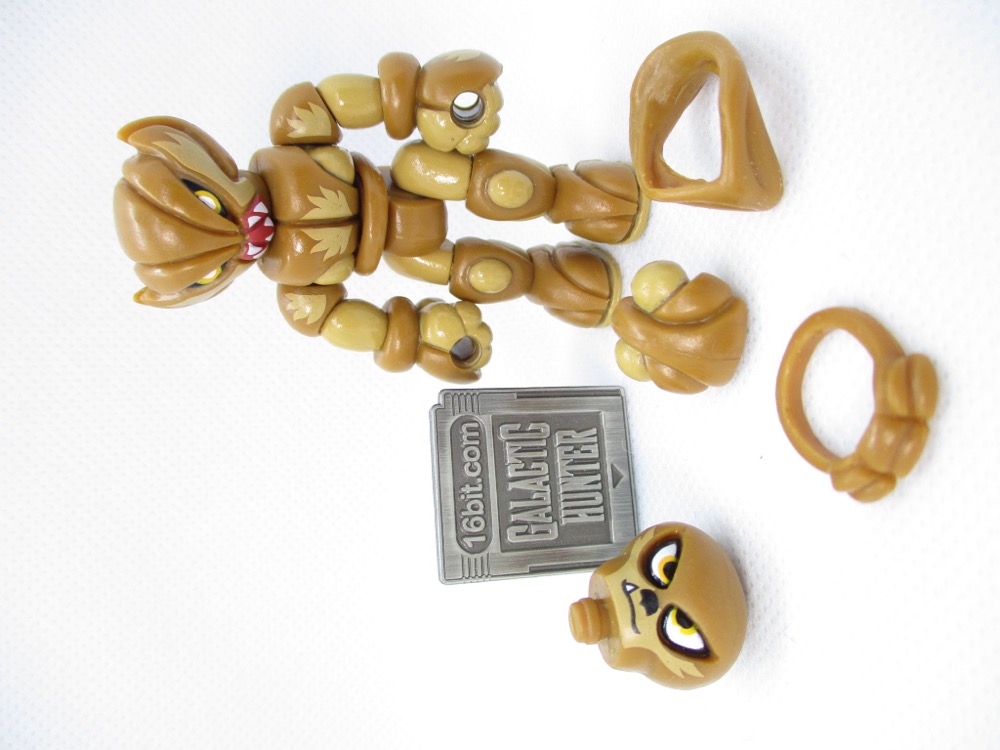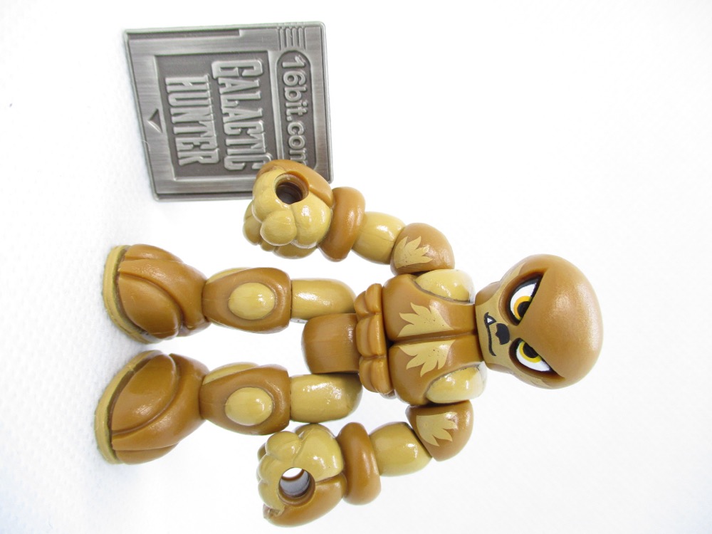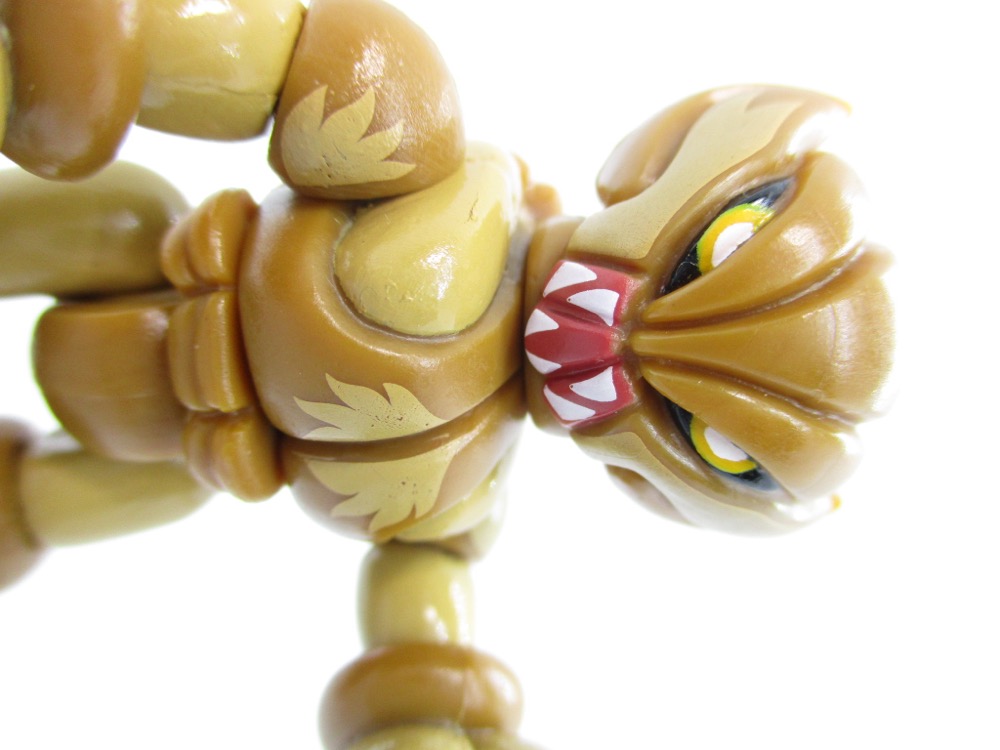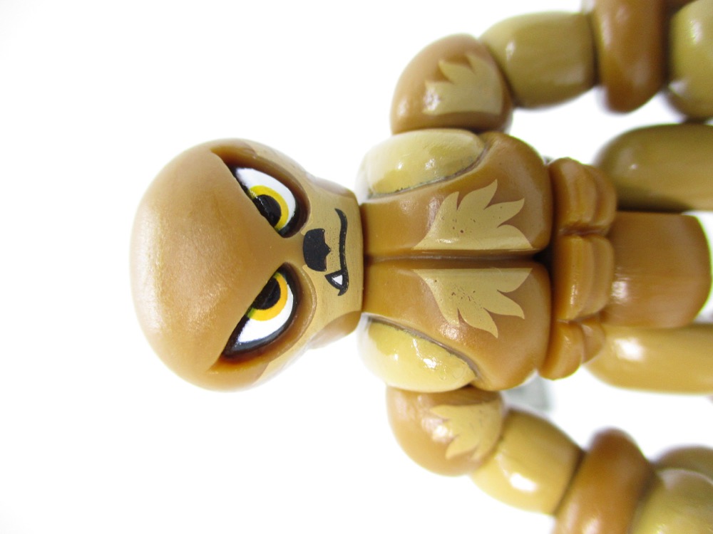 You can reconfigure the toy in a lot of neat ways - there's a collar of sorts, a belt, a torso you can flip around to change his build, a backpack, and of course, an alternate head. And it's great. I really hate myself for not clocking it sooner - I looked at the figure in the bag for years but never really examined the bulb head. It's adorable. It's still bulb-shaped, but the paint does all the heavy lifting. The black outline around the cute white and orange eyes would be fine on their own, but the added tiny black nose and a slightly smile with a stalagmite of a fang, surrounded by a patch of light fur, might remind you of an Ewok or a Wookiee. There's not a lot of painted definition on the sides of the head, but that makes sense given how much we got on the chest and arms. Paint isn't free, and at $12 this figure was probably butting up against the deco budget and the family Doughty grocery bills. It's worth noting his knees, thighs, fingers, soles, and calf muscles are also painted. Nobody skimped here.