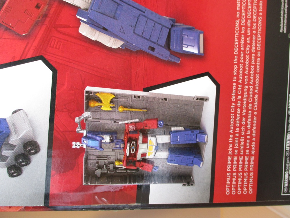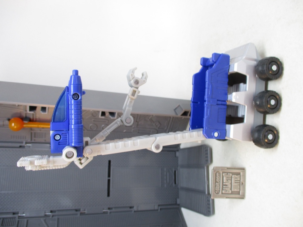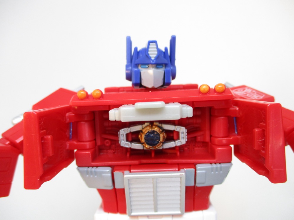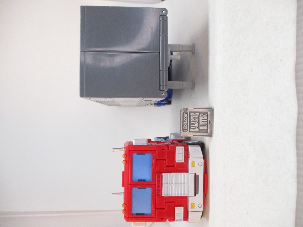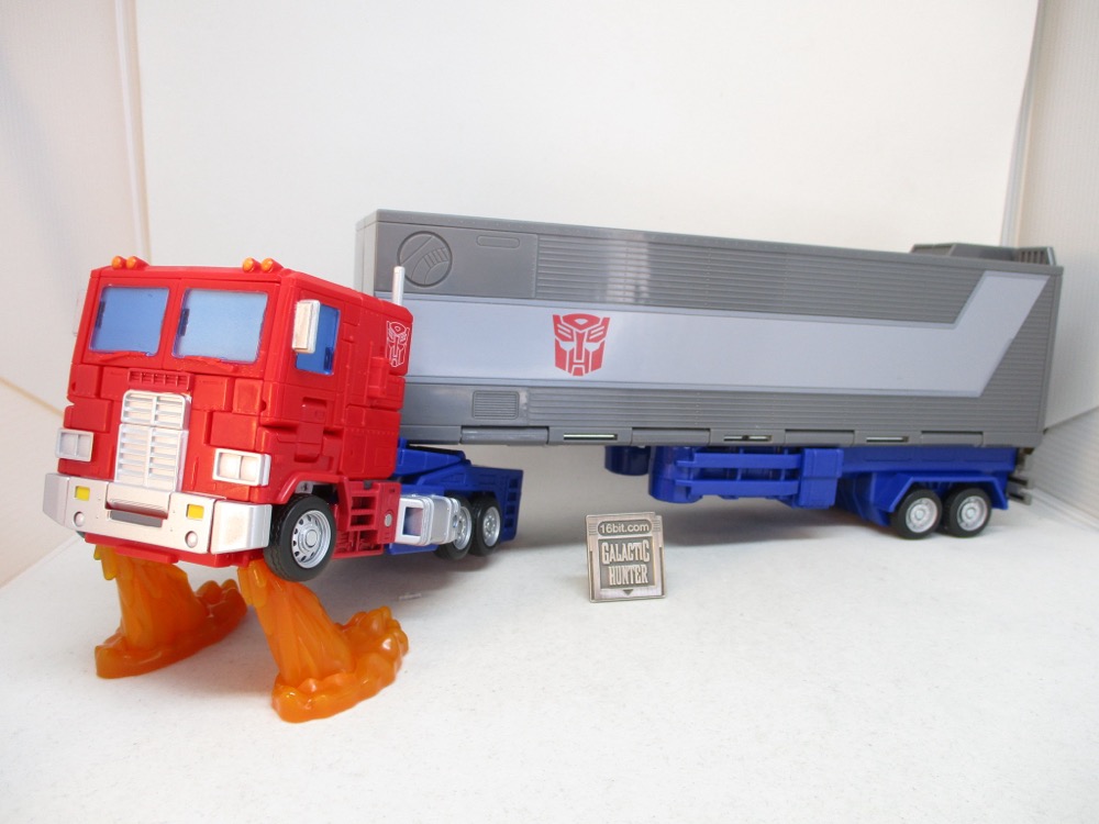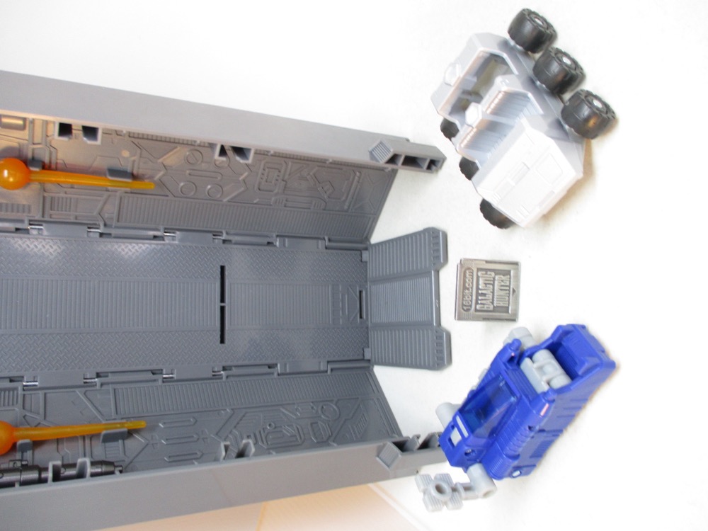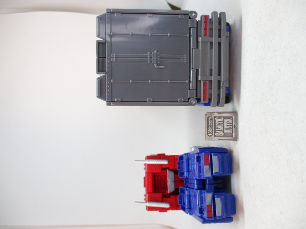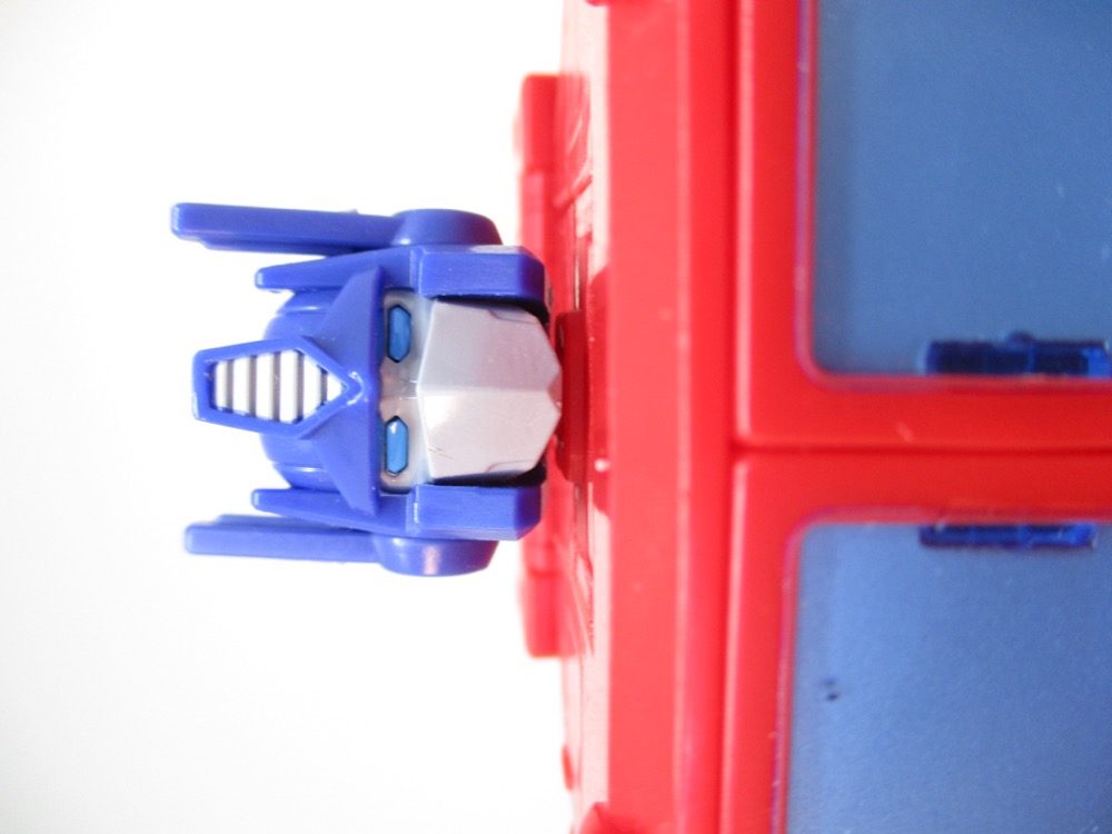 The truck is very much like other flat-nosed red trucks - the blue section is a bit thicker for all the leg folding, but it looks like most Optimus toys. The wheels turn, it's red, there's at least one Autobot symbol on it, it's pretty good. The brake light parts were switched during assembly on most if not all units, but it's not exactly a big deal and there's a fix. The truck itself doesn't do much but carry the trailer, which is more or less what you want here. There is, however, a new feature.