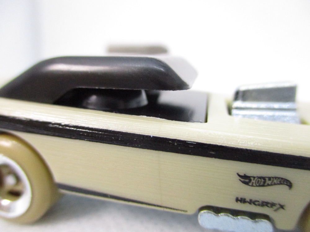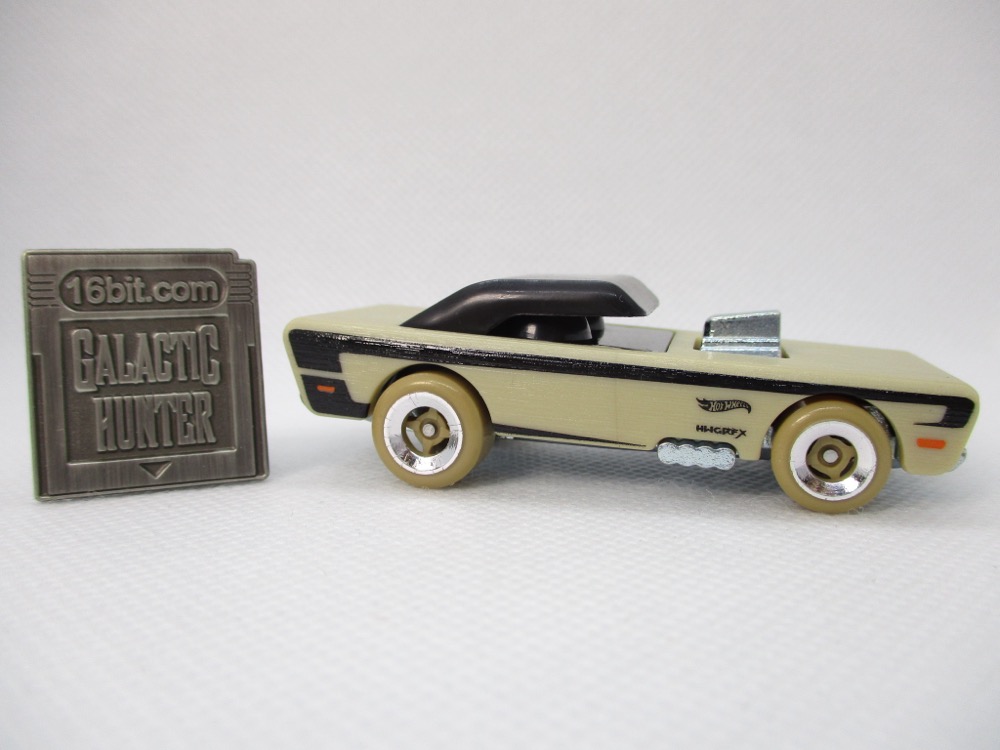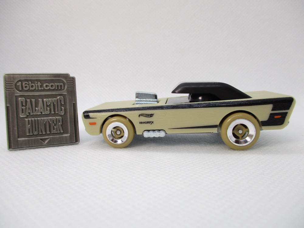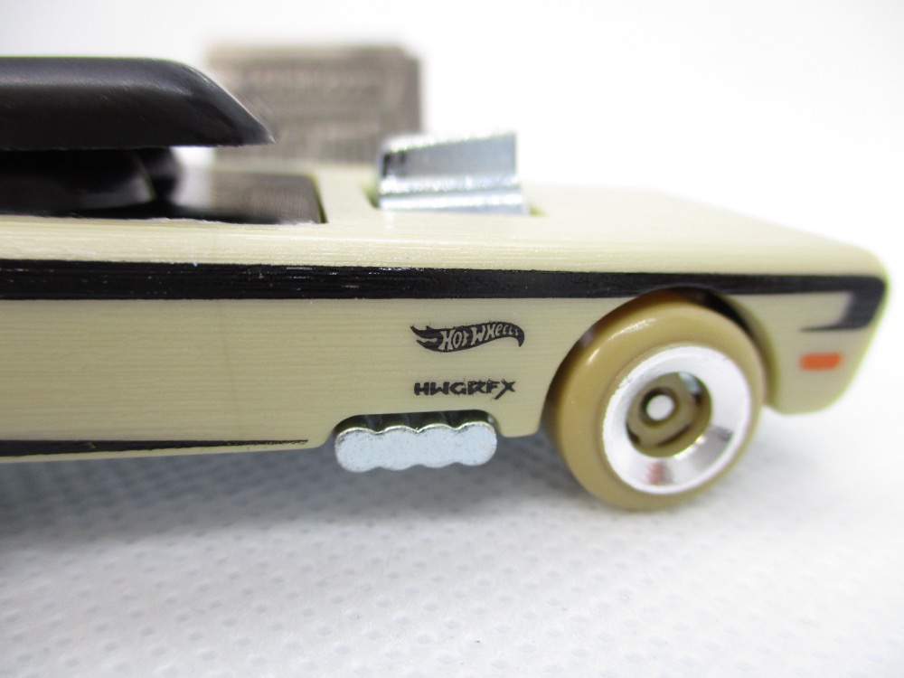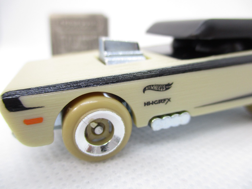 More versions are reportedly on the way, including a taxi, so why should you buy this brown base wood version? Well, it looks like wood - it's like a muscle car, but in a pinewood derby flavor, minus the pine, or the wood. The roof is black, the sides have a little bit o paint and "HWGRFX" on it as well as orange reflectors. There are no headlights, there are no steering wheels, it's very much a riff on the kind of thing a kid('s dad) might carve to win a racing competition, complete with tan wheels with silver trim.