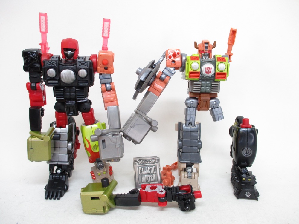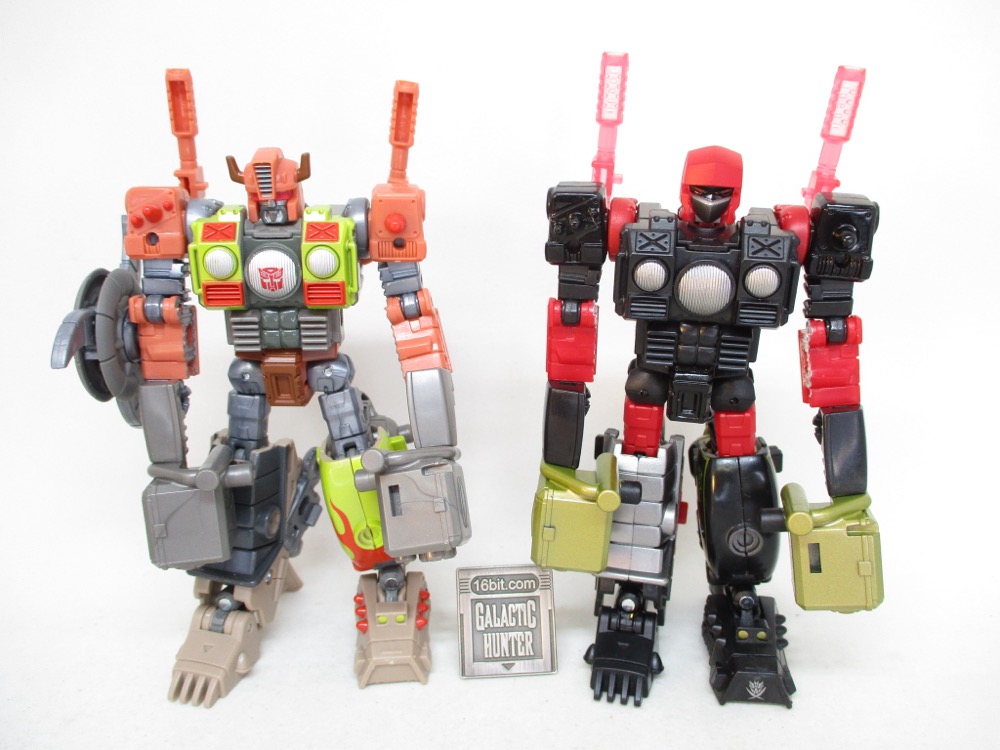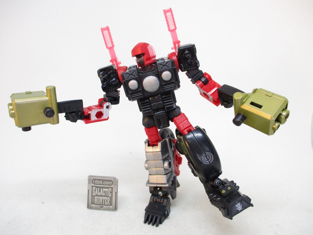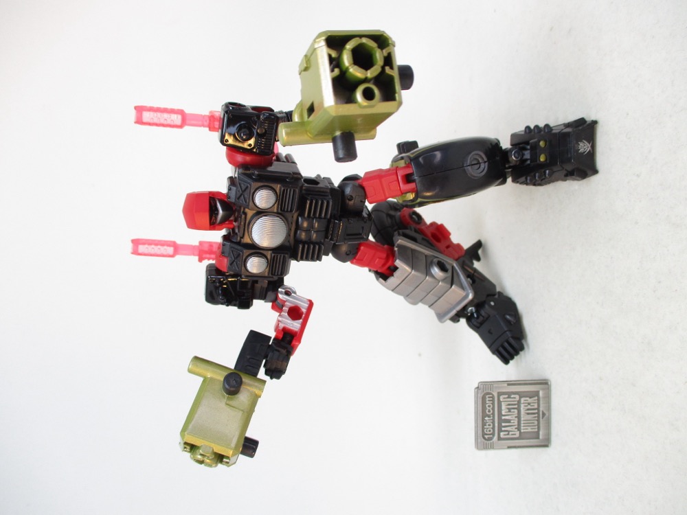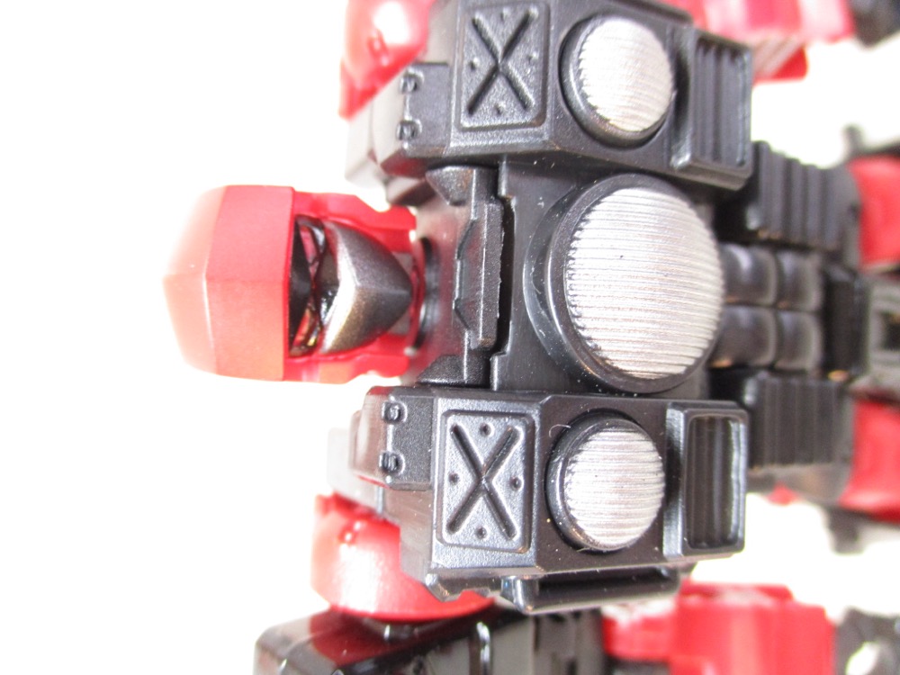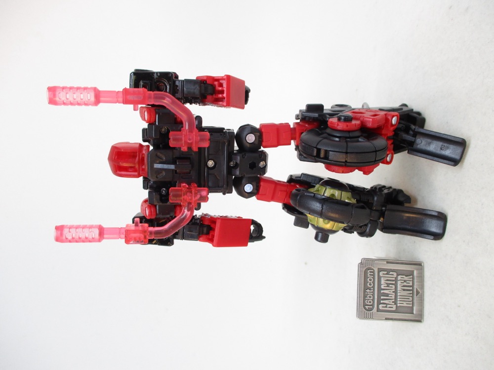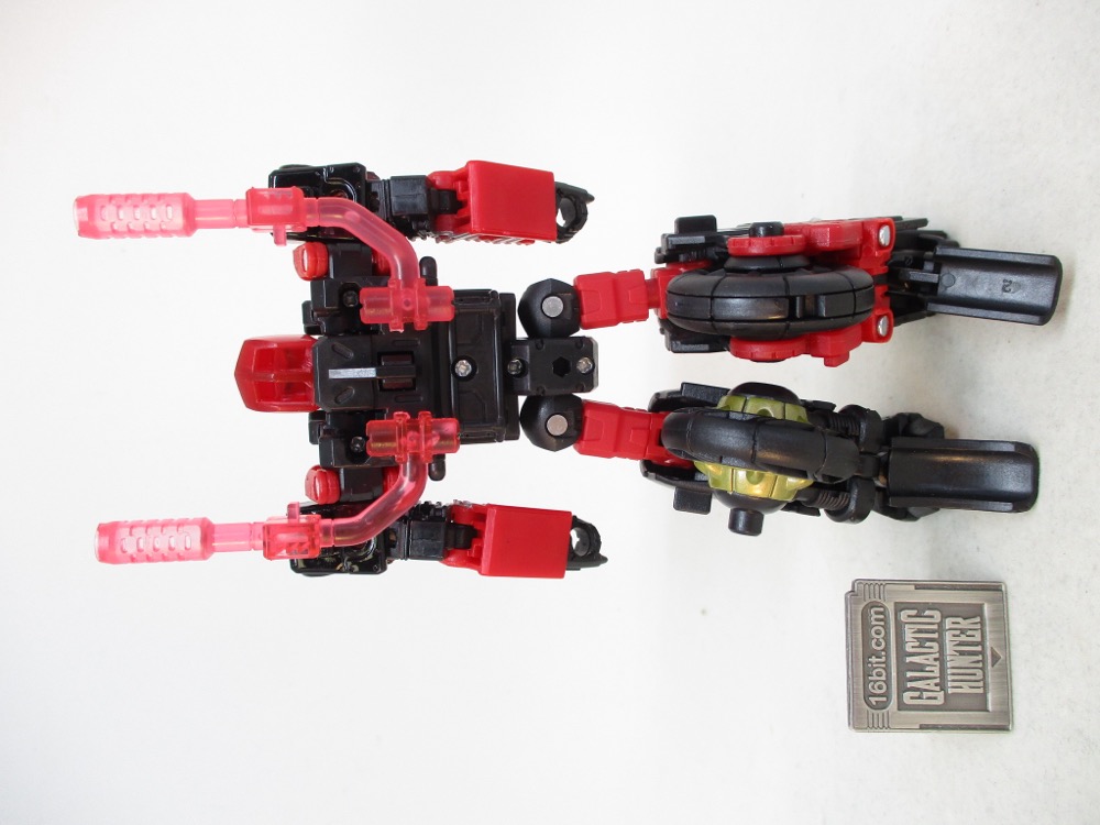 What's impressive about Road Pig is that it takes Crashbar - a spiky, flame-painted multicolor motorcycle - and makes it look like a sleek robot by painting everything black. Well, not everything - the head is cast in clear red and painted, and the thighs and forearms are molded in red. His knee/seat, lights, and gas cap are silver while his saddle bag blasters are gold. This results in a toy that does a great job capturing the spirit of the original, down to the ninja mask. Sure, we don't get a clear windshield, but I doubt you're going to miss it.