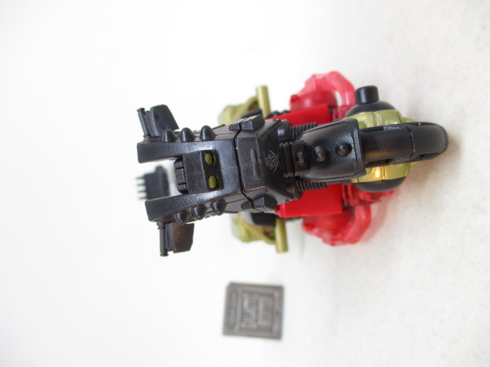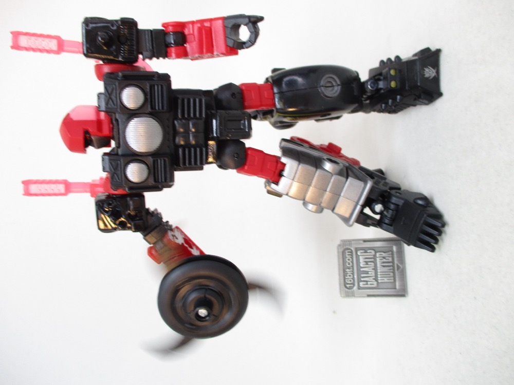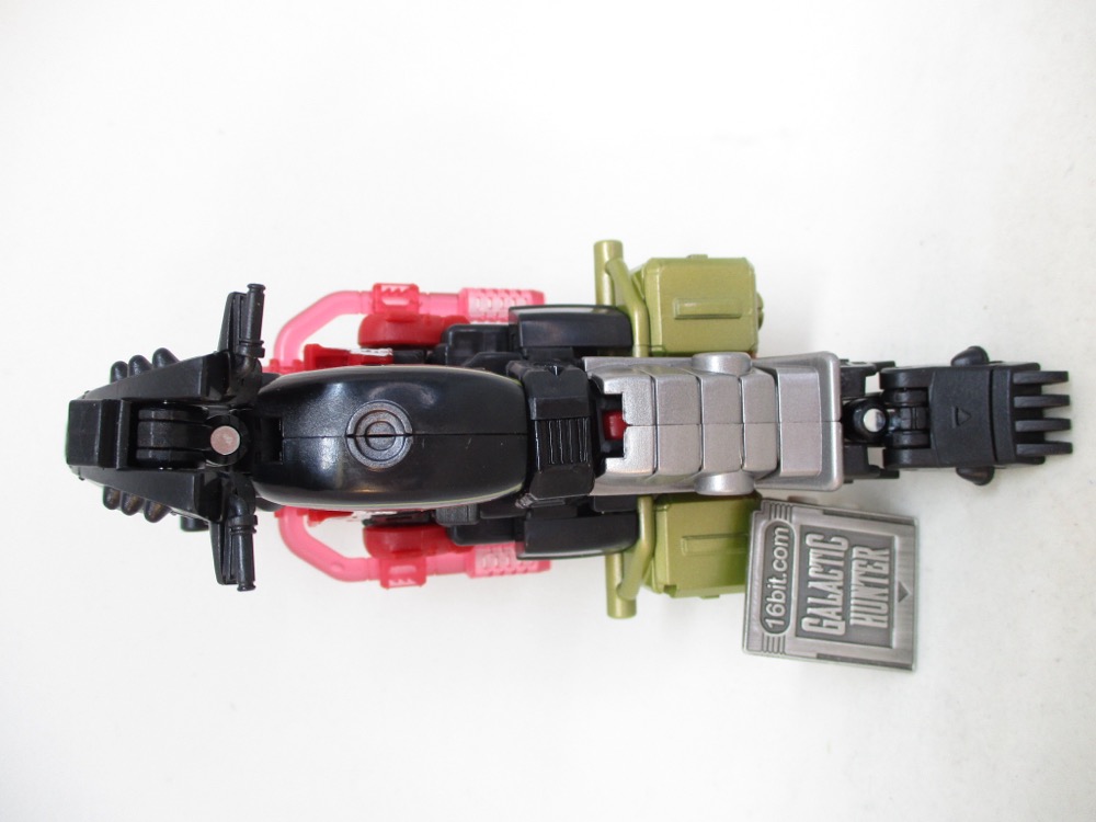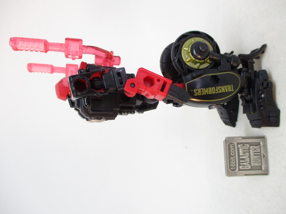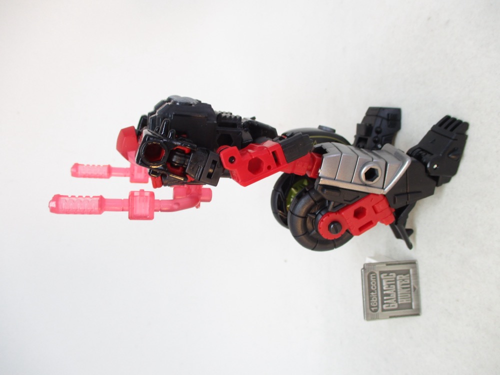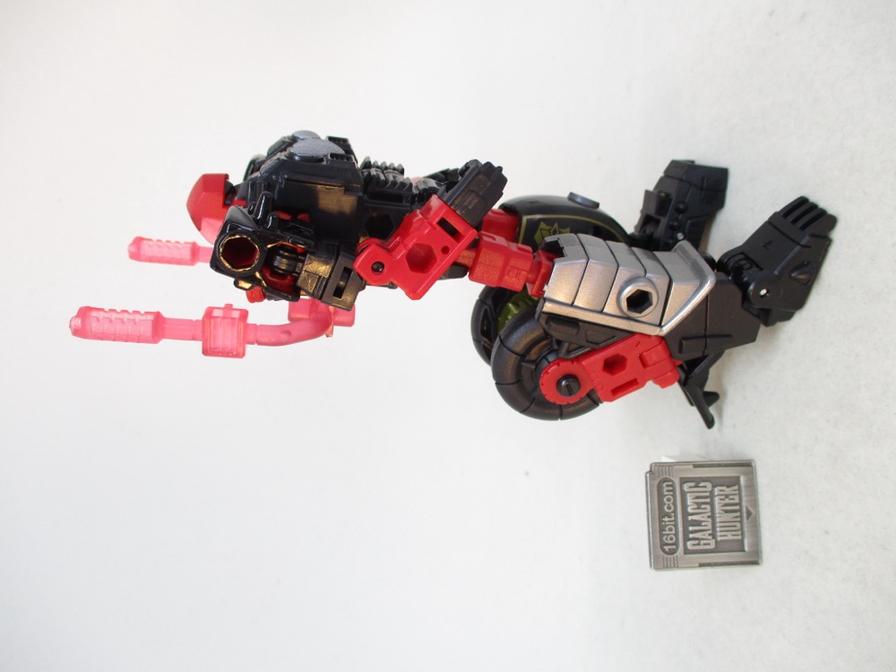 The bike mode is pretty good. As I mentioned above, it's spiky - but the black plastic really absorbs the visual detail, leaving you to admire the G2 Decepticon symbol or the gold Transformers logo on the sides. He's got silver on his seat, and one of his two wheels spins well. It won't surprise you that the spinning ninja star tire spins - the other one barely moves, so you won't be rolling him down a ramp. Hasbro did a really good job making a mold that does double duty as a sleek bike and a Junkion cycle, so kudos there.