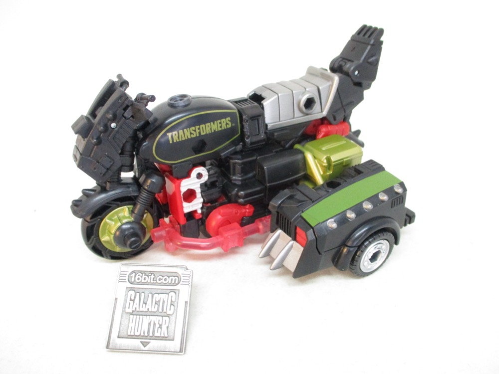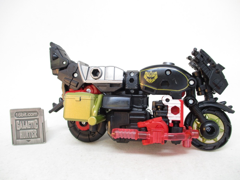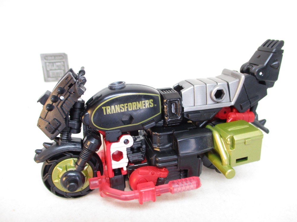 The conversion is pretty simple. Pop off the pipes and saddle bag blasters, twist some bits around, and you've got a nice bike. Then you put the gear back on. You can also take the toy apart in several places to use as upgraded parts on other toys, like limb extenders for Lockdown. The toy can swap parts with other Junkions as well. Hasbro made this one so you have plenty of reasons to play with it, rather than just admire it on a shelf.