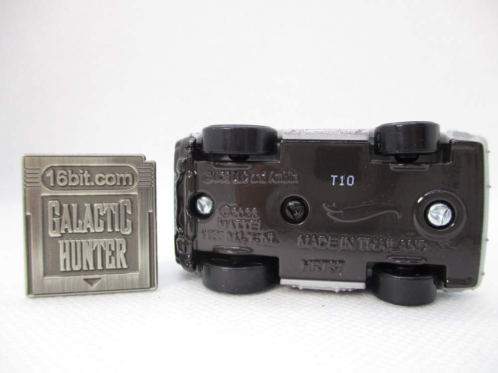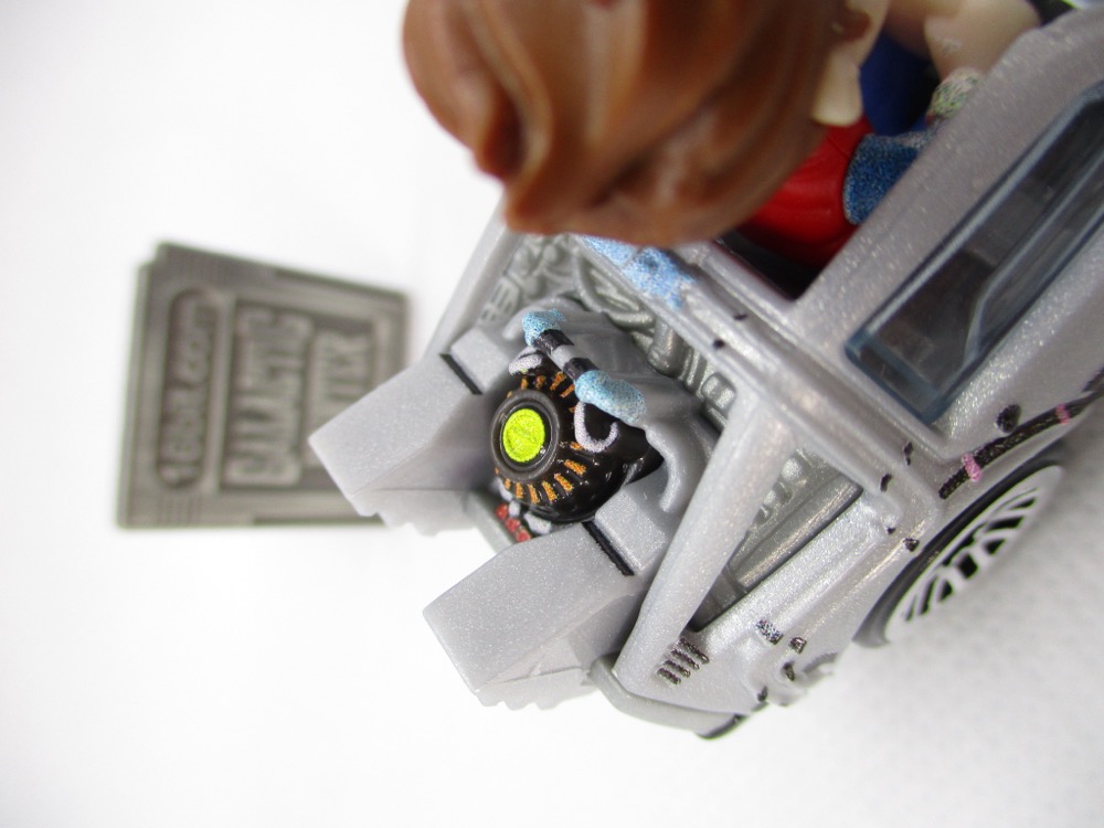 The car is molded in sparkly gray, rather than painting it, so you may see traces of that familiar "swirl" in the plastic that makes toy collectors flinch a bit - sometimes those don't age well. For now, at least, it looks good - the not-quite-Choro-Q car is squished and looks like the Time Machine from the movies. There's no DMC logo or OUTATIME license plate, but you'll see various time junk in the trunk, the cables running alongside the car - with painted details! - and even a painted Hot Wheels swoosh on the license plate. The brake lights are painted, as are other little details on the front and back - Mattel didn't cut too many corners here. For $6, they've got the budget for it.