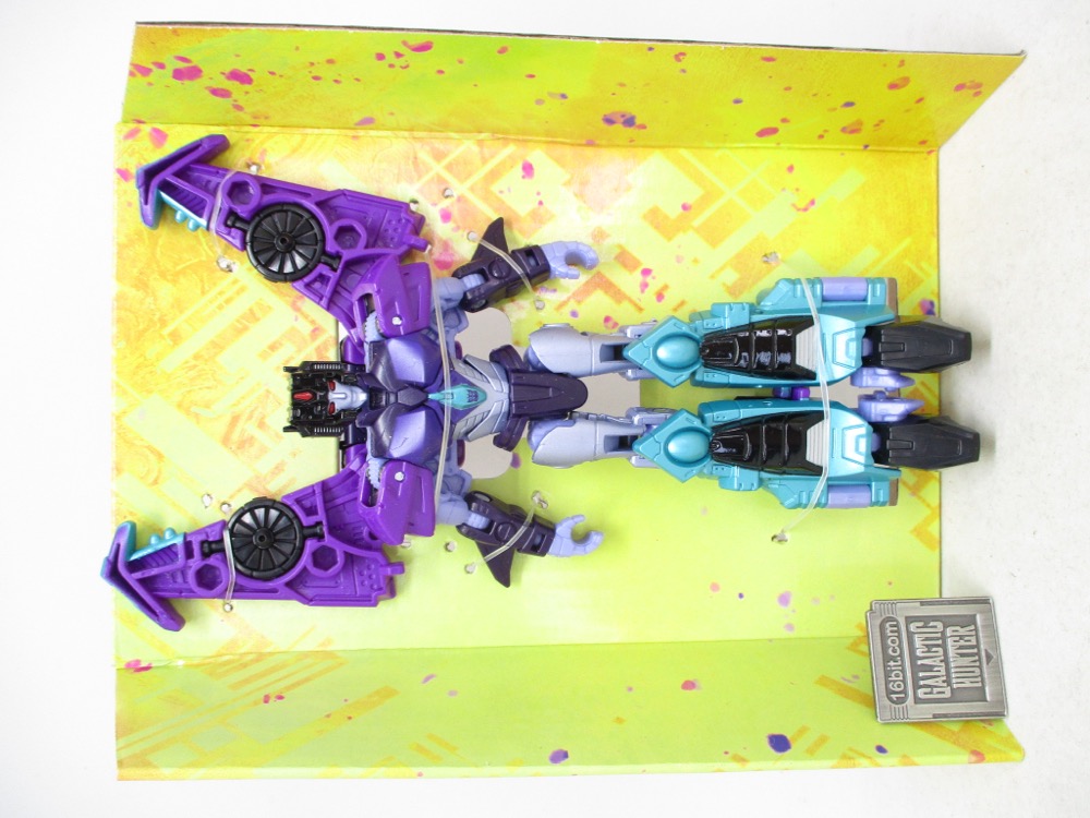 While not perfect, it's fun - a new Decepticon jet is nice to have, and this one uses a good mold with fans you can tilt, nice colors, and 5mm holes under the arms for blasters. They don't quite go where you would want, but at least they can go on the arms. Moving the 5mm peg lower on the barrel might help fudge it, but that would have other side effects. They can fit in the wings or the arms, and if you don't like it, I have got to assume someone at Hasbro is planning to do a G1 version of the character at some point down the road. But here we are waiting for a decent Sunstorm, so maybe not.