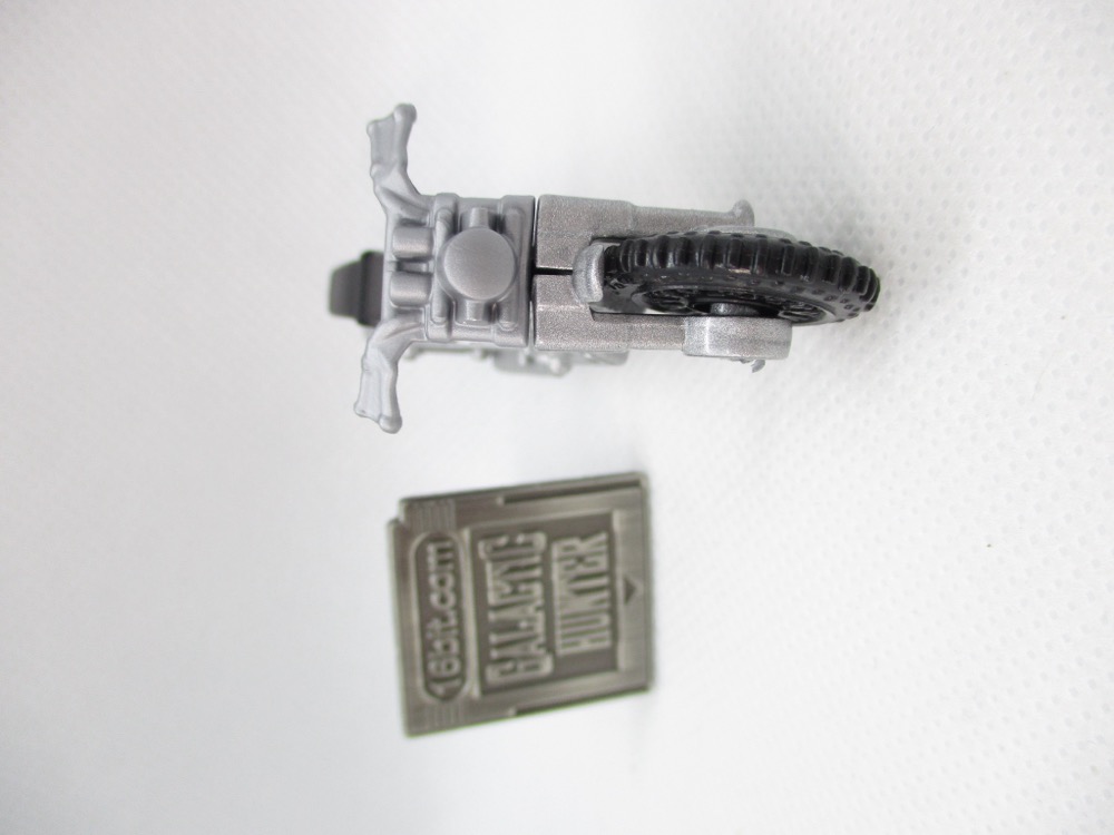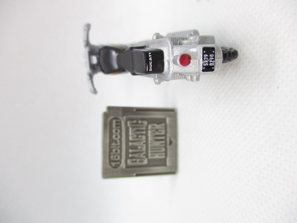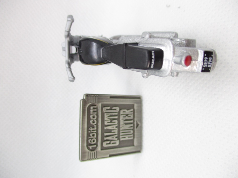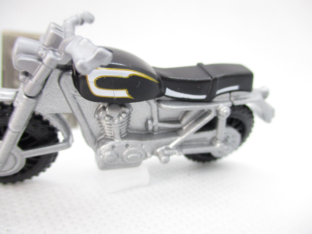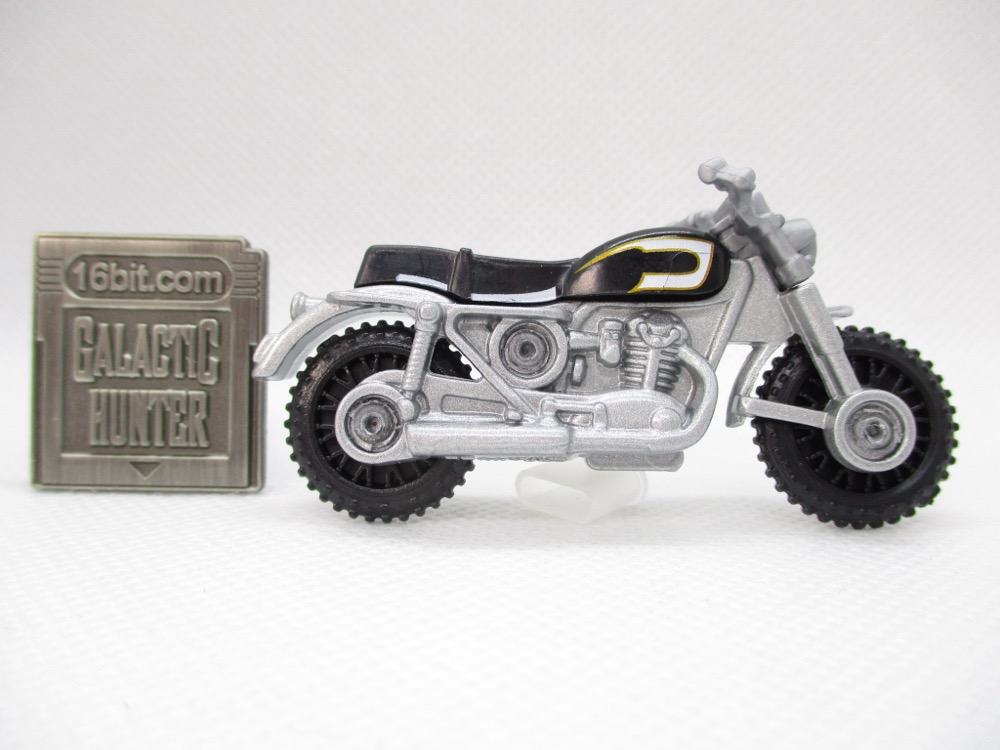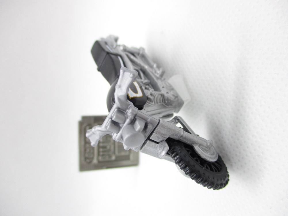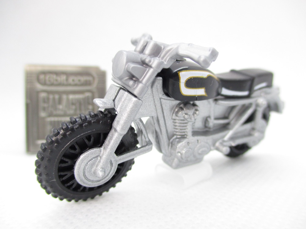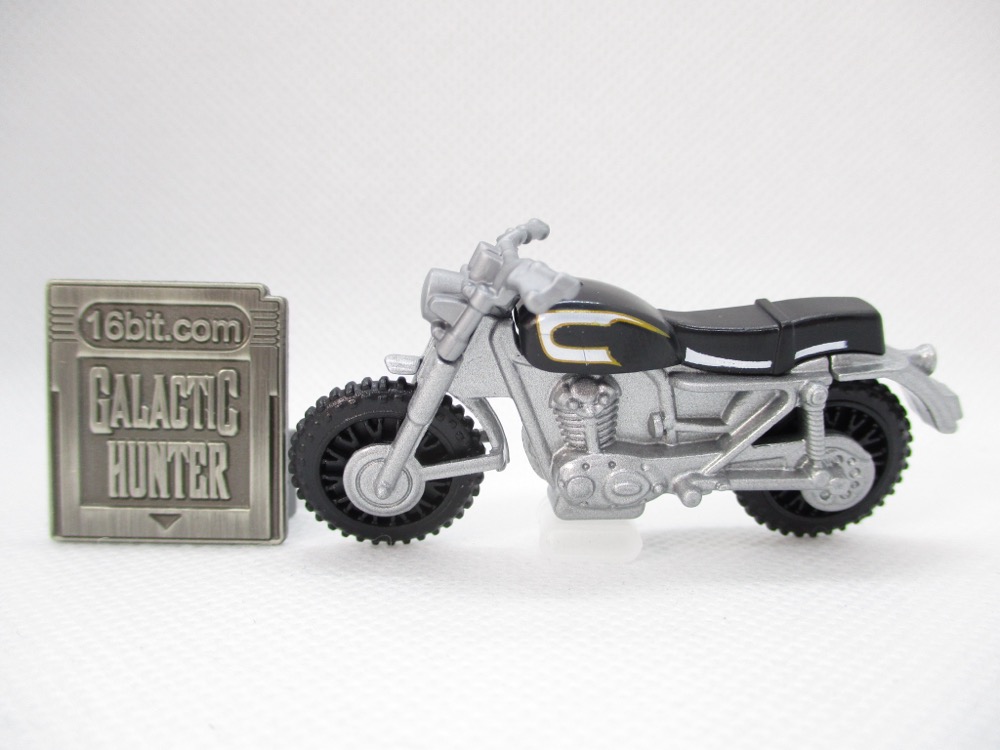Given Hasbro's line didn't exactly take off, I'm kind of surprised Mattel made these this year - but hey, I bought them, they're doing something right. The bike can't stand unassisted, so you may wish to leave it packaged. Once out of the box, it flops over - maybe you have some clear plastic USB covers on your desk or a small screw to prop it up. The tires are black, most of the toy is silver metal, and the seat is black. It doesn't quite match the bike in the movie, but the license plate does!