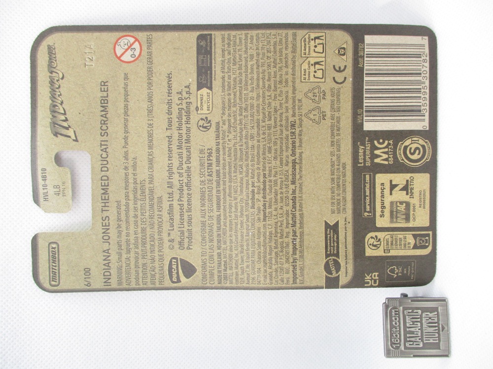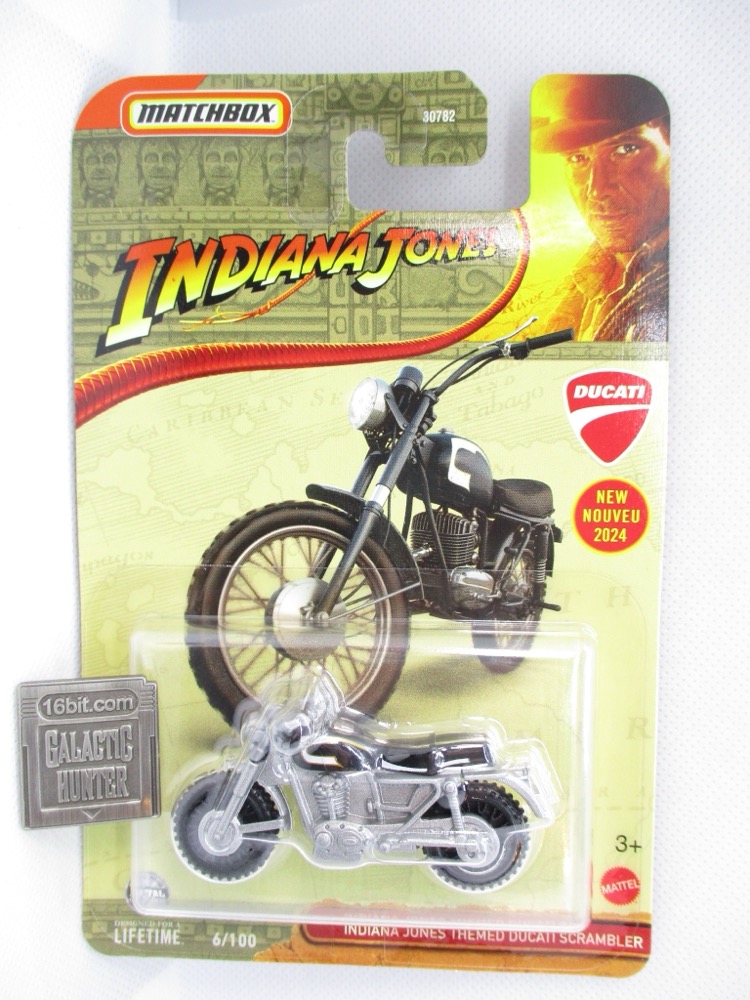 I'm no bike guy, but I saw the Matchbox Indiana Jones Ducati Scrambler at Dollar Tree for $1.25, along with the Tuk Tuk, and bought them. Yeah, they're from Indiana Jone and the Dial of Destiny but I was out and having a rough day, so I bought them both - they had several of each. The packaging stands out from the standard Matchbox orange cardbacks, and I support move vehicles in that line - so I got 'em. Admittedly I was not sure if this was Helena Shaw's bike or not when I bought it. (It is.)
