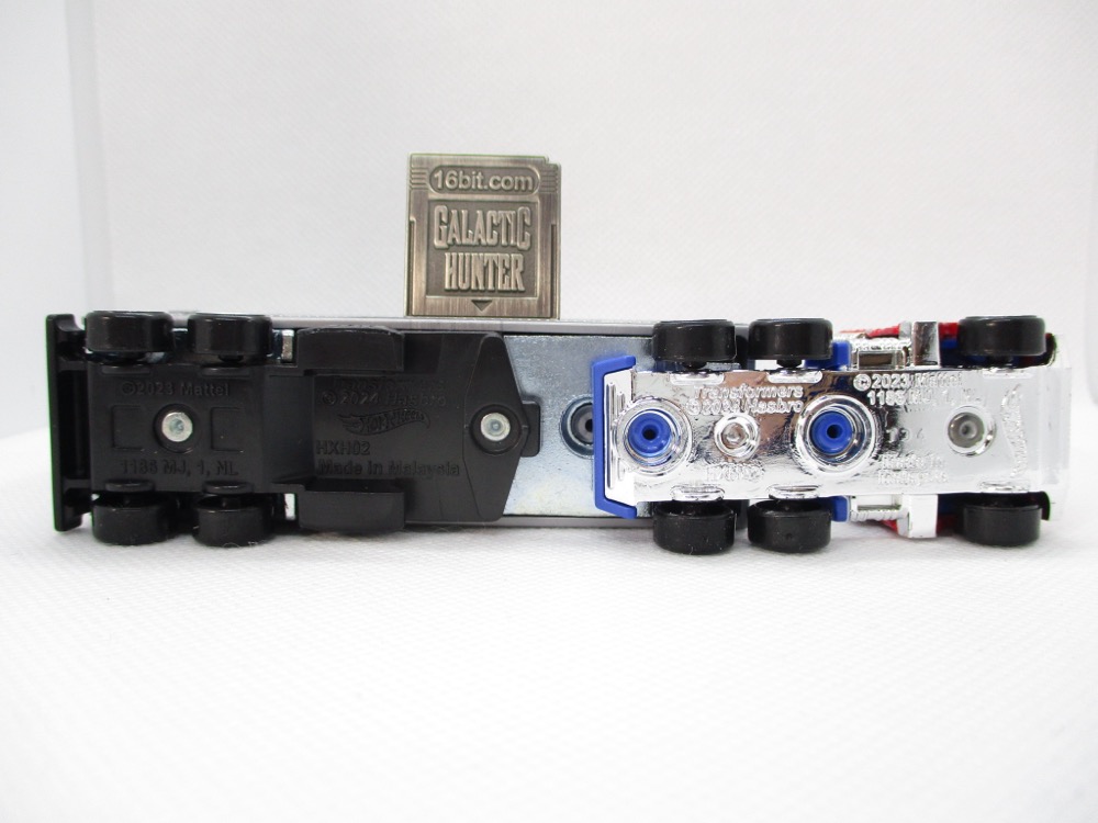 Mattel Hot Wheels Track Fleet Transformers Optimus Prime Die-Cast Metal VehicleToo big for a basic Hot Wheels case, Optimus Prime is the kind of thing you expect and indeed hope Mattel keeps in circulation for a long time. This version takes the basic 1984 truck vehicle mode, and translates it to the ever-popular 1:64 scale-ish toy car format. In this pack you get a die-cast metal cab (basically, a typical $1.25 car) and a big container with more wheels hanging off the back - that probably doesn't make up the balance of the price, but it's cool, and I assume "you'll pay more" is some riff on the ever-popular "rule of cool."