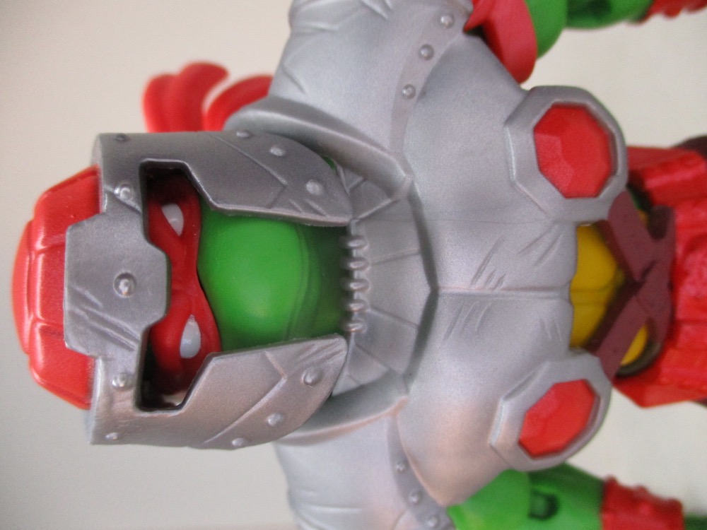The same turtle body returns, complete with removable shell shield, with a new head, a new shade of green skin, and removable gear. The Ram-Man helmet is really a great way to change the character's personality, as I would not normally think of taking one of these guys and head-butting other figures. The shoulder armor and coloring also match Ram-Man (and Raphael) nicely, with an added sword that looks like a sai. And because always two there are, his other sai is embedded in a massive glove.