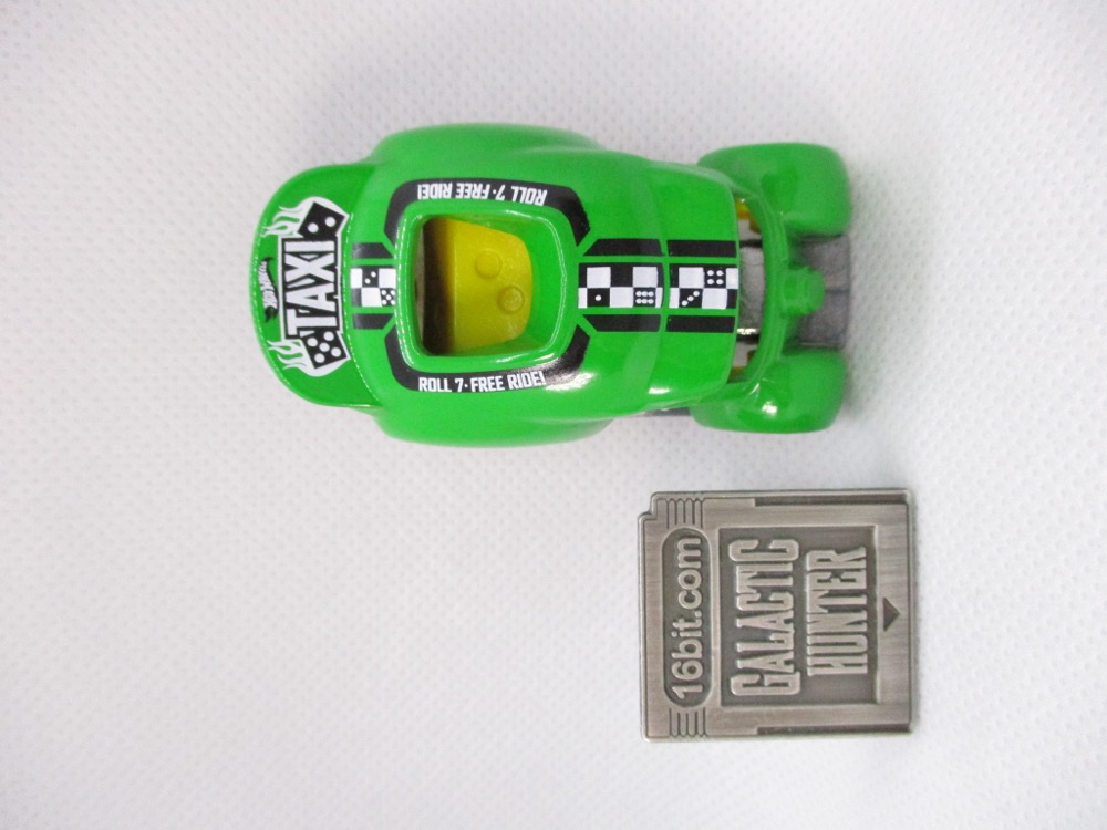 You'll note it has "Taxi" graphics - the checkered stripe with the dice inside were also used on a yellow version of the car which sells the whole concept a lot better. As it is, it reminds me a lot more of a traditional blackjack dealer's green visor even if it doesn't quite match that color either.