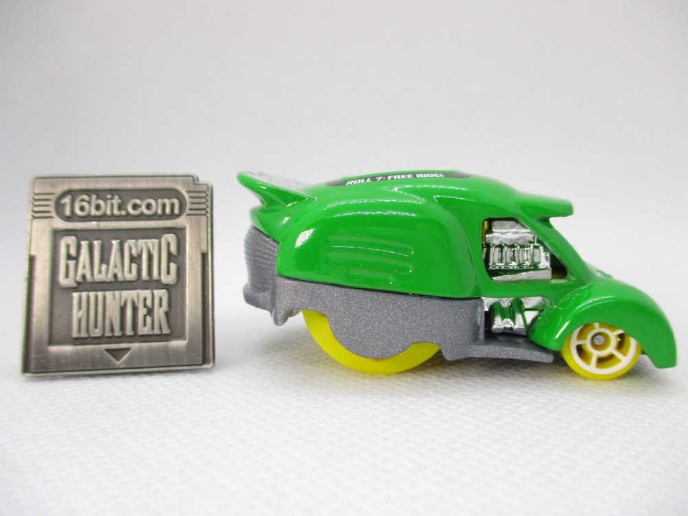 Mattel Hot Wheels Experimotors See Me Rollin' Die-Cast Metal VehicleDuring a long Hot Wheels binge last year, I picked up a 2022 See Me Rollin' was on front of the pegs when I was at the store, and I thought "that looks fun." So I got it. A yellow bed on regular wheels is augmented at the grocery store. It was a charming green car with a visible interior and a nice visible interior. There are four versions of it, and this green one is - as of my writing this - the newest release and has a big yellow steamroller-esque drum which serves as the toy's chief gimmick - it's a die!