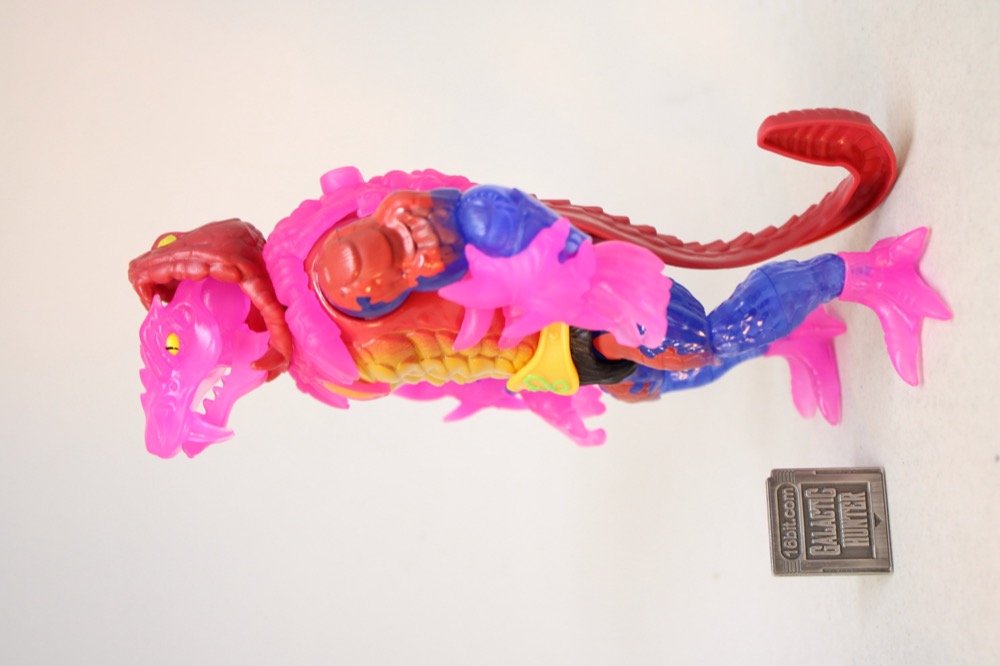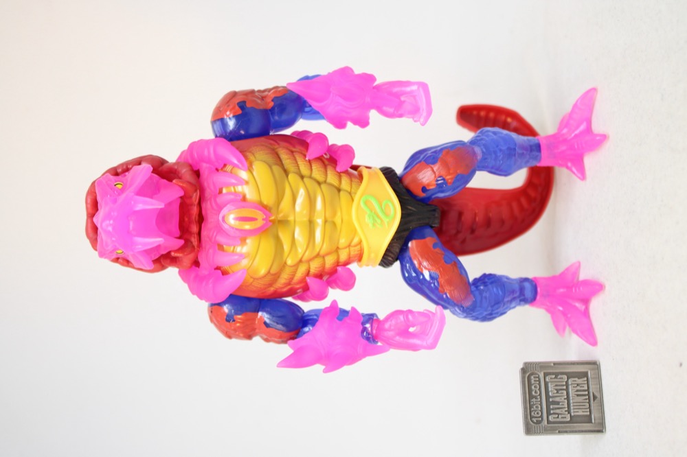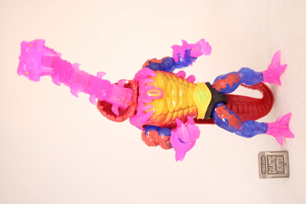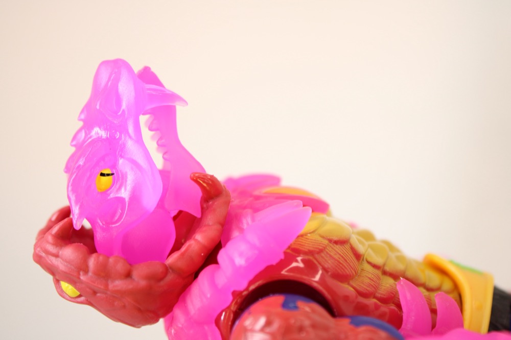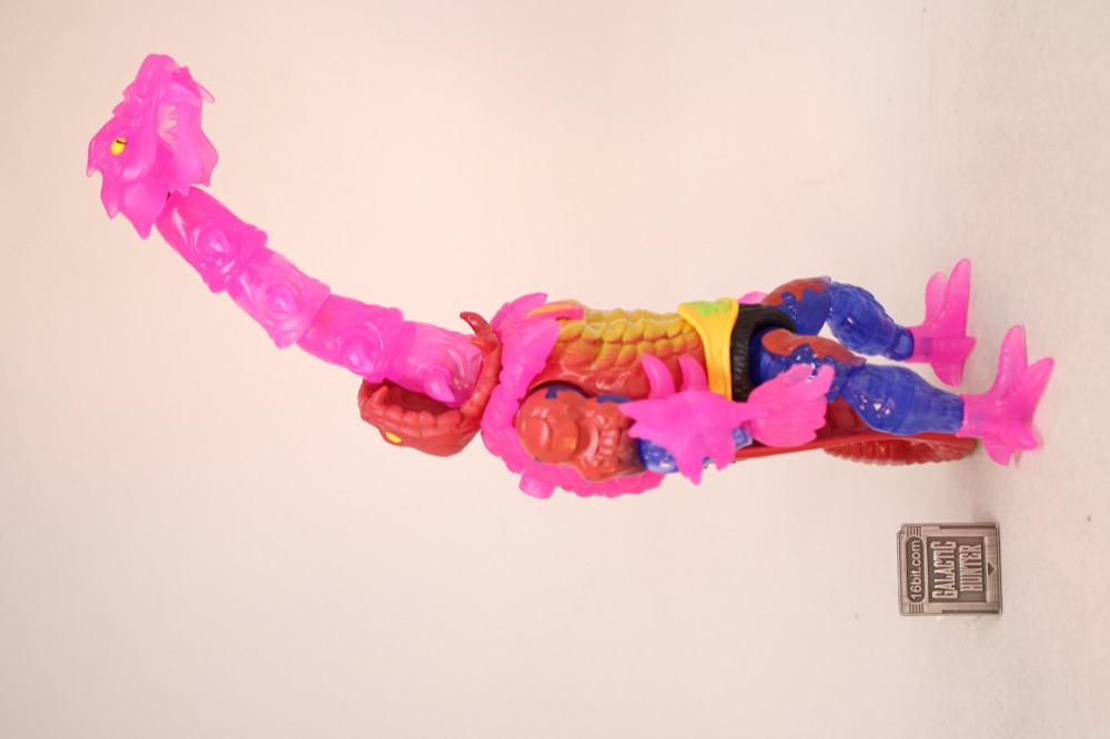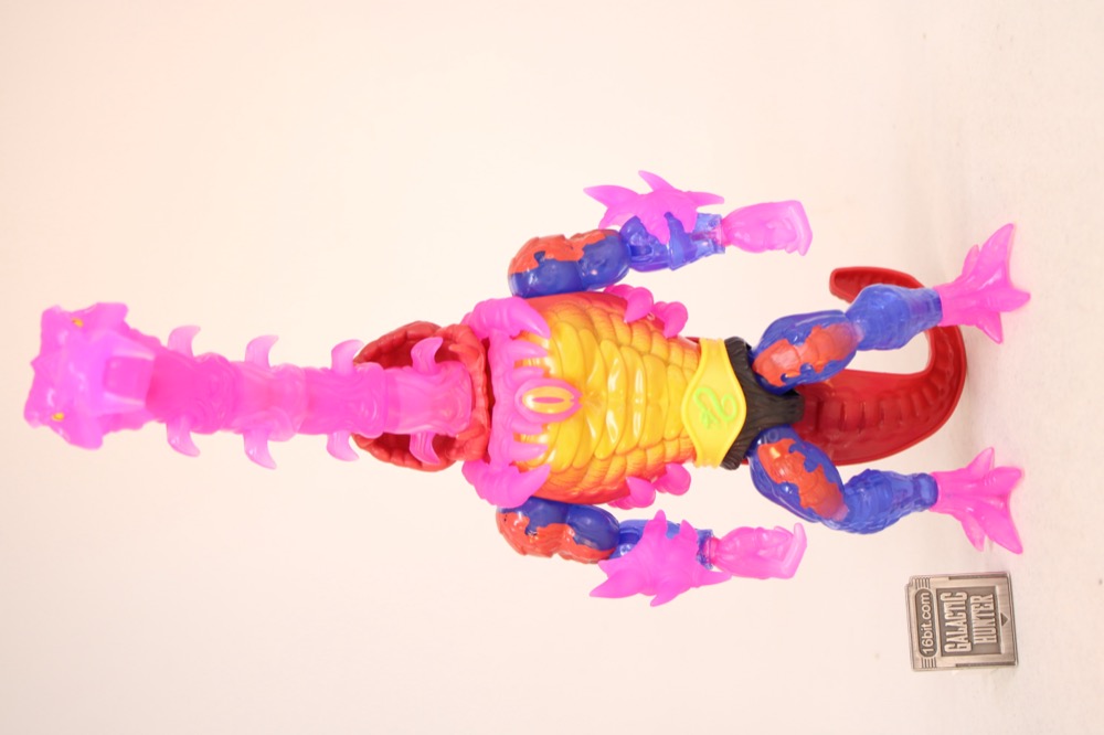The colors are really awesome. If lit right, the clear, dark blue limbs look utterly amazing. The body's opaque with very good sculpting and paint, with some added "armor" featuring fangs, a giant eye, and clip-on bits with spikes. Most exciting, though, is that the classic Rattlor head exists as a neck decoration, vomiting up a clear, bright pink skull! ...and as I typed that he fell over again. At least he looks really cool with those painted scales on his arms.
