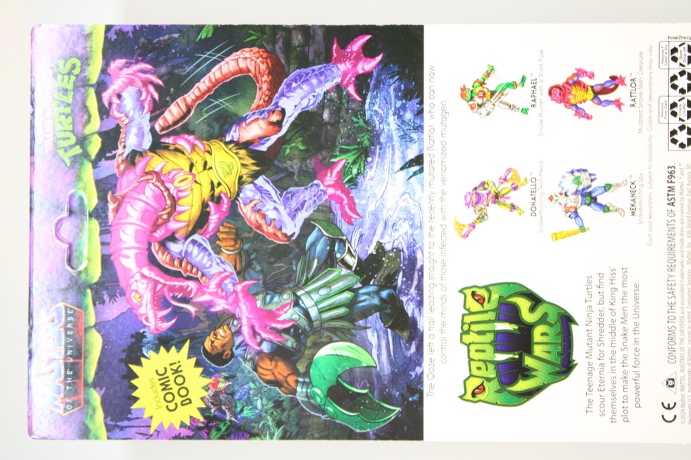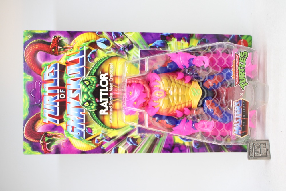 Mattel Turtles of Grayskull Reptile Wars Rattlor Action FigureWhen I first saw Rattlor I thought "Oh crud, I thought I was going to sit this line out now but I can't pass on a guy vomiting himself up." This is easily one of the best concepts in the line, with amazingly good detail, the gimmicks you'd expect, and just the right colors. But I found there to be challenges getting his wrist armor to stay on, and getting those neck bits to stay on was tough - and the head popped off when I was taking him out of the package, which is a bad first impression. It's still gorgeous.