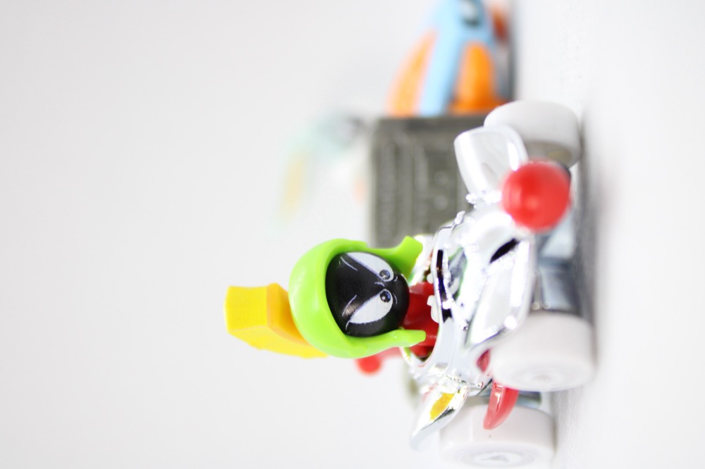 Marvin's car looks like a fancy collectible - thanks, chrome - while Bugs looks like a kid's meal toy that has been adapted to fit a modern toy budget. They both feel sturdy and just heavy enough to feel like Real Toys. Given the price I assume the audience is going to be limited, but I really like them both enough to recommend them to fans of the characters and/or format. I'd go as far as to say Marvin is essential to anybody who's been picking up The Outer Space Men or any other whimsical older sci-fi toys, even though Warner Bros. cartoons seem to be seen as old-hat by the society at large right now. (They were huge in the 1990s, I swear.)