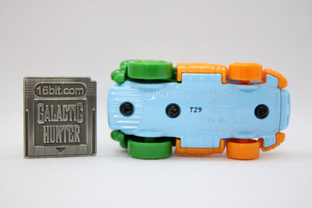 Joining Marvin is Bugs, who is also sold as a single car with (as far as I can tell) no changes. The car itself is three carrots slapped on a sky-blue chassis with buck teeth and cartoony rivets, making this look and feel like something out of a cartoon. (If it is, and I'm forgetting which one, I'll fire myself.) The orange wheels blend in with the carrot root while the green wheels blend in with the carrot tops. On the back are some exhaust pipes as well as the requisite license plate frame with a Hot Wheels swoosh. (Marvin's is hidden in his rocket.) The carrot car is neat, but it's not as cool as a mid-century rocket design adapted by some of animation's greats.