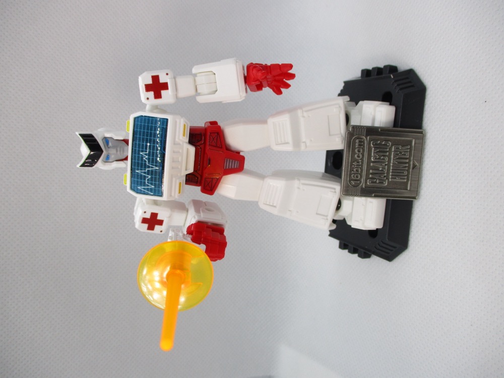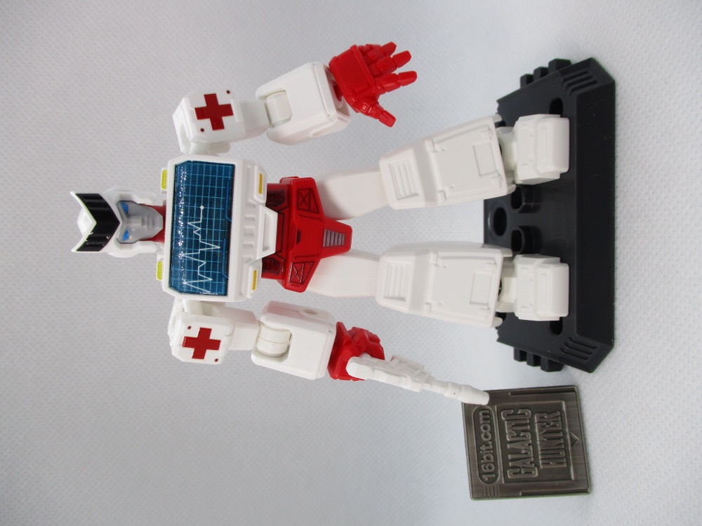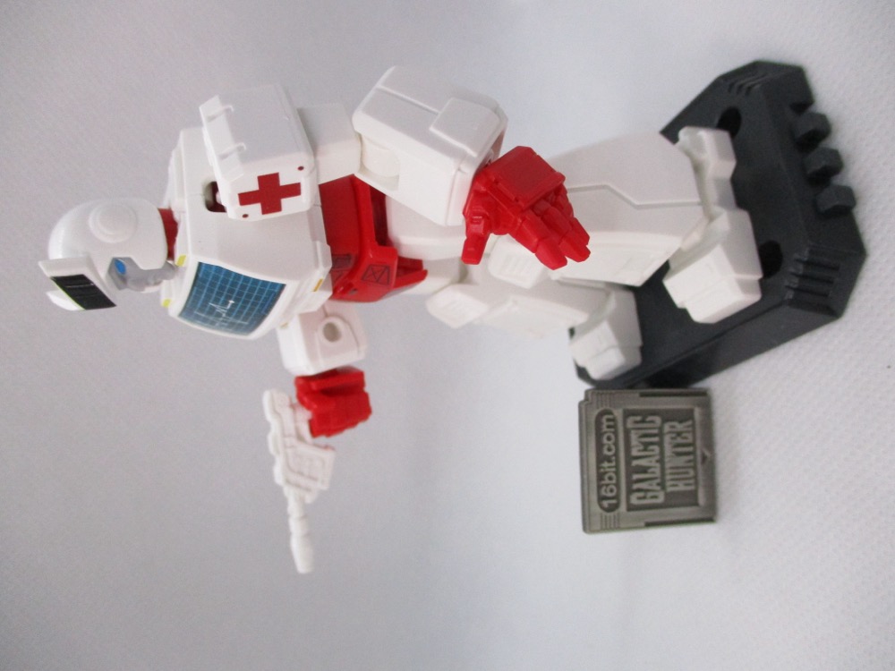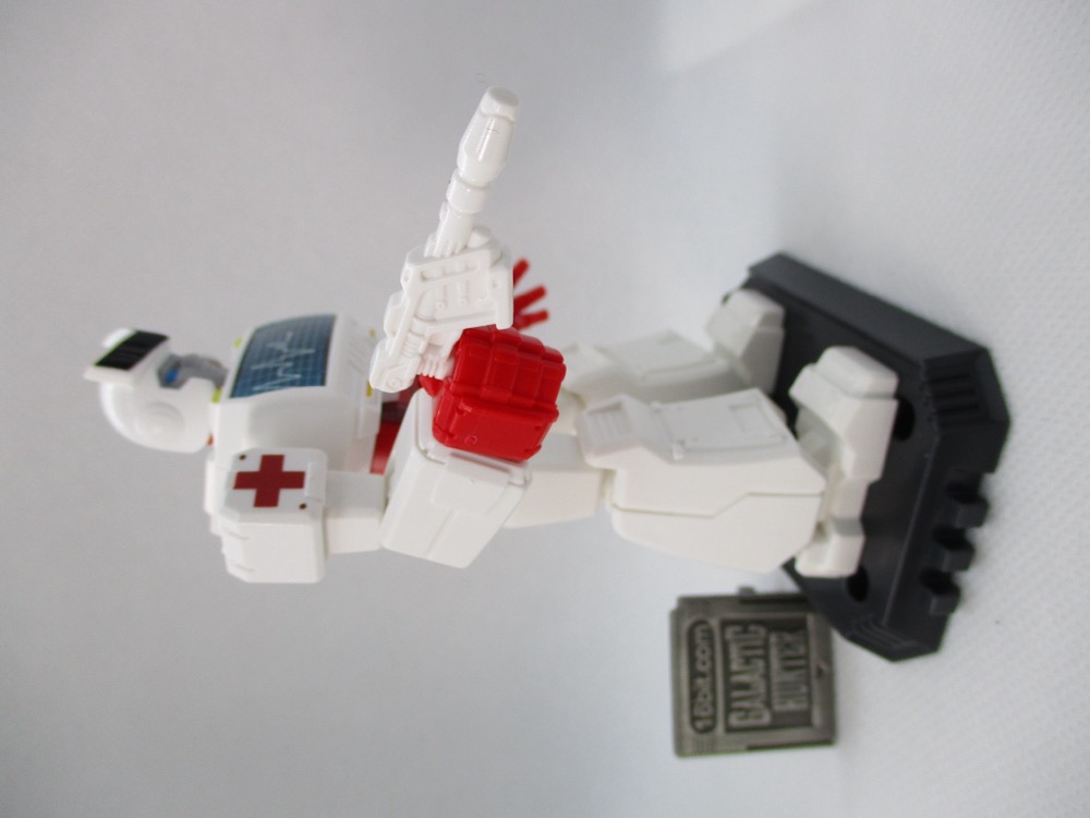 I bought two random blind box Blokees last year to see what they were like, and one of them was Ratchet. The character takes inspiration mostly from the cartoon deco, with some neat embellishments. The white helmet with black crest is pure Sunbow, as are the red hands and red cross shoulders - a feature frequently missing due to conflicts with the Red Cross organization. Why is it OK here? Honestly, I don't know.
