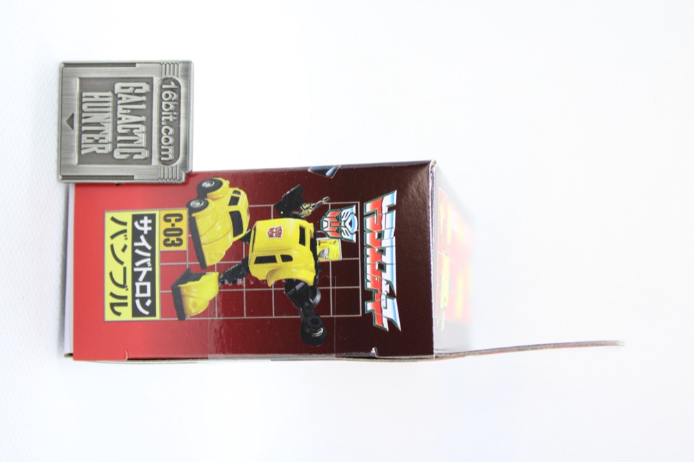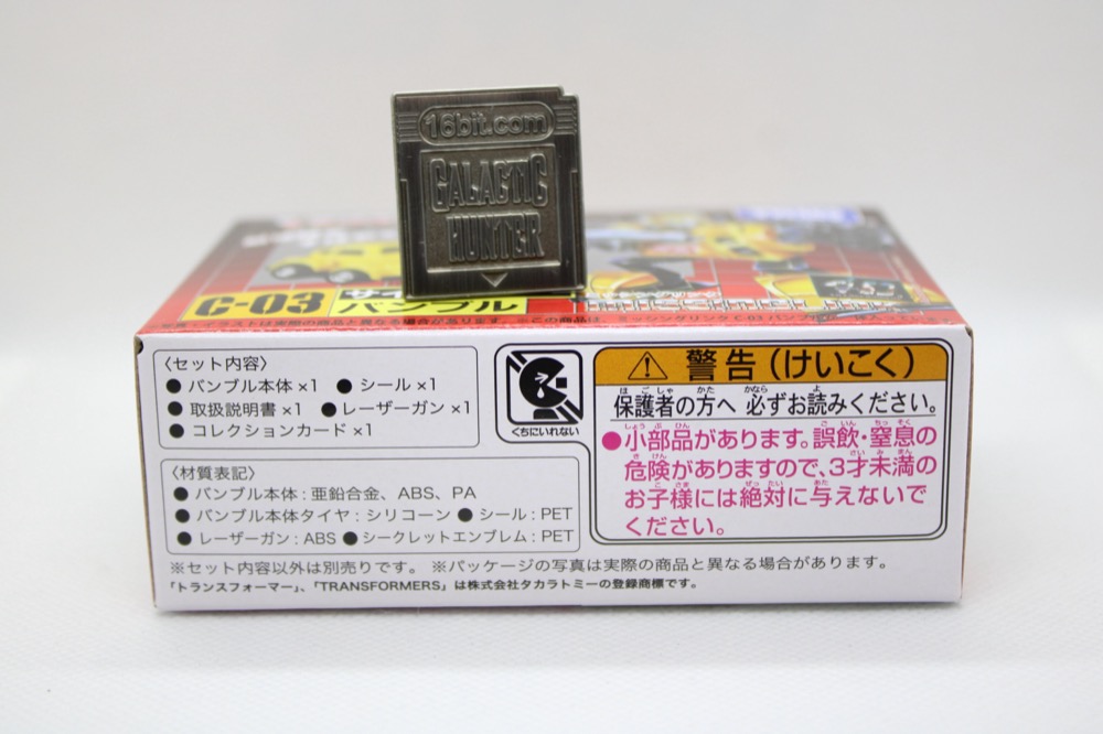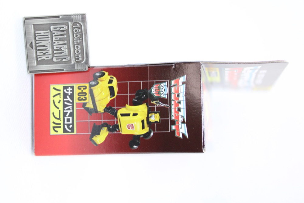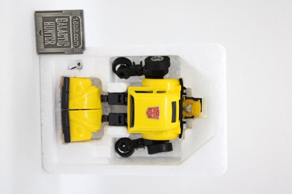 Packaged in a tiny box, with a tinier box inside, nestled in a styrofoam insert, Bumblebee comes right out and ready to be posed. (His blaster takes some more extracting.) It feels a lot like the original toy, with a lot of key differences. There are more joints in his legs, there are elbows, the head can swivel now. There are no pre-applied stickers - the chest symbol is painted on, and you can cover it up with foil stickers representing the old toy labels or the weird box art marker.