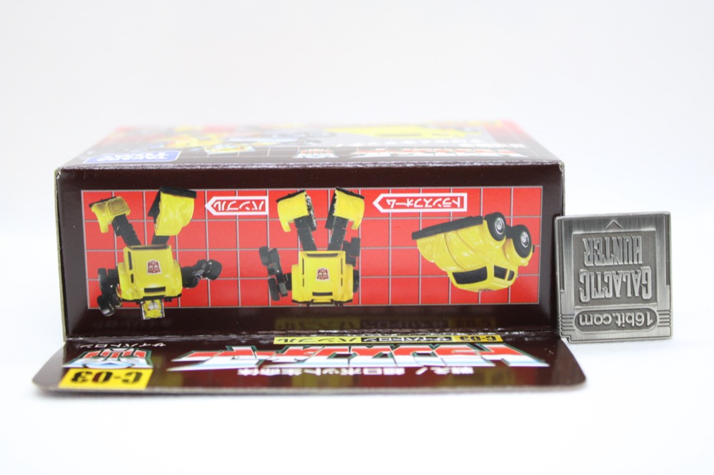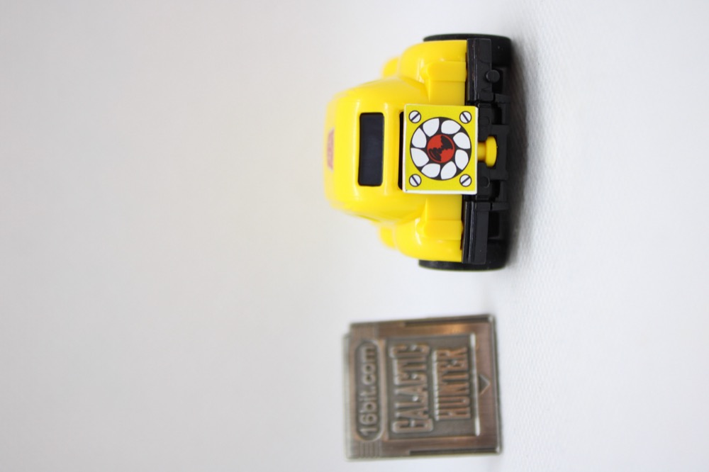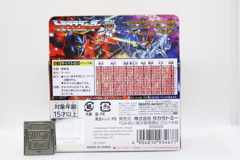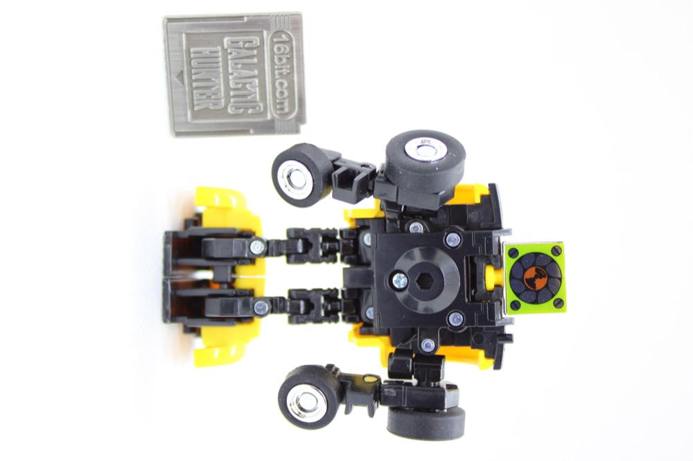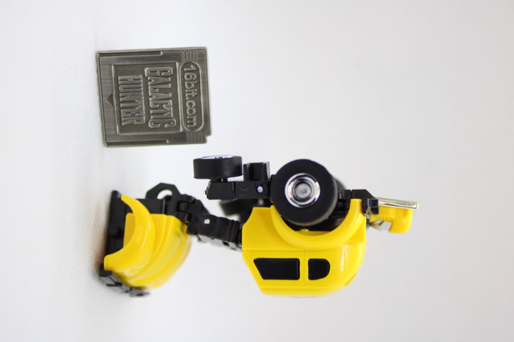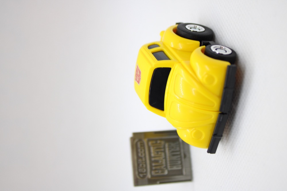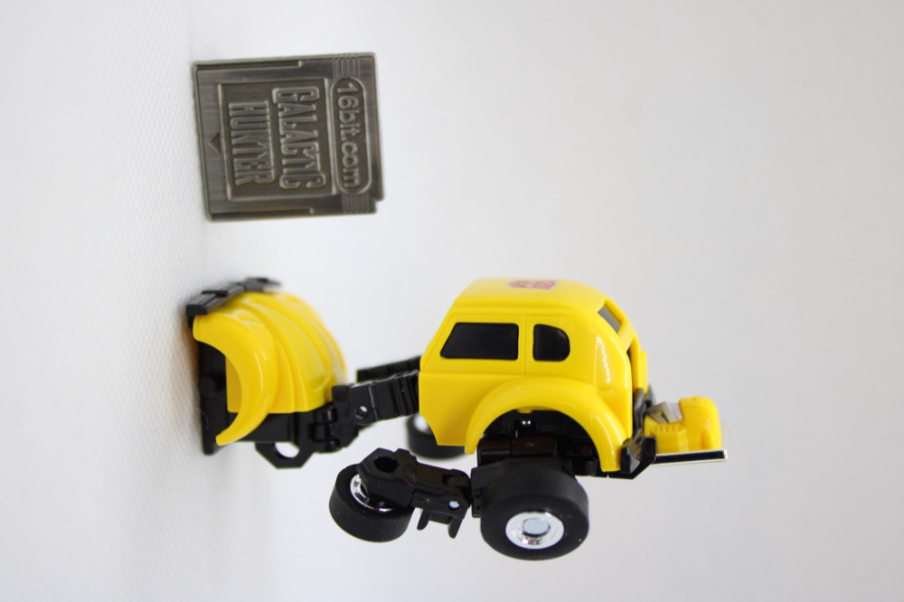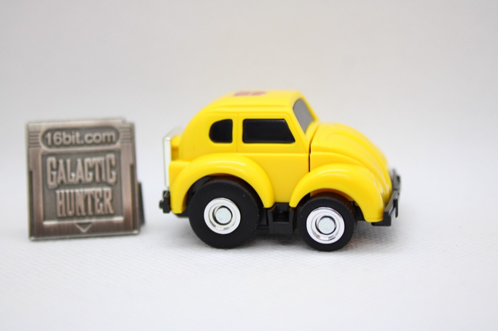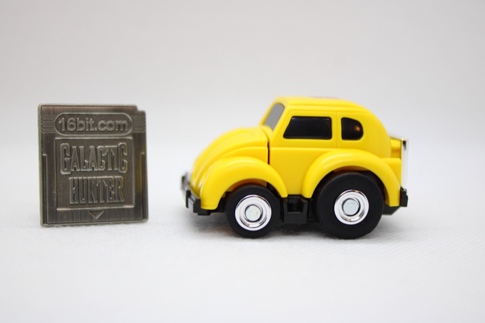 The car mode is very simple, tiny, and pretty close to the orignal. There's more of a gap in the back where you can see the face a bit more than my old toy, but other than that? It looks just like the original Volkswagen Beetle, down to the lack of painted headlights. You get silver hubcaps, and the rubsign symbol is under the car, rather than on the chest or elsewhere. (Mine is on the chest.) It rolls well, and other than having a place to mount the blaster in vehicle mode I can't imagine what else Takara-Tomy might have done to it.