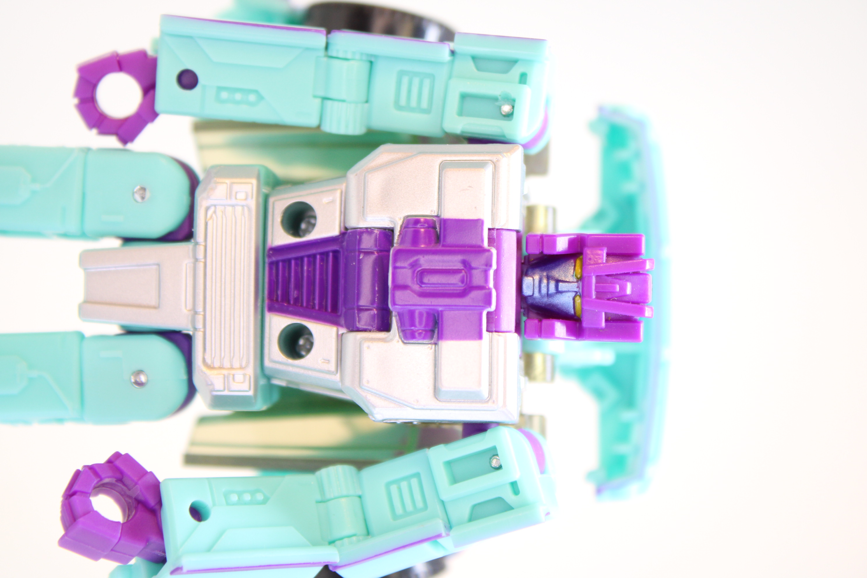 While the original toy seems to have a smidgen more red in the purple, this new version more or less feels pretty good. You don't get the metal chest, but you do get a blue face (no visor), purple fists, purple shins, and some blue forearms and feet for contrast. As robot designs go, there's not much to him - as long as Hasbro got the colors right, we're doing pretty well. The original toy had jointed shoulders and a fold-down neck which doubled as your shoulder connector piece.