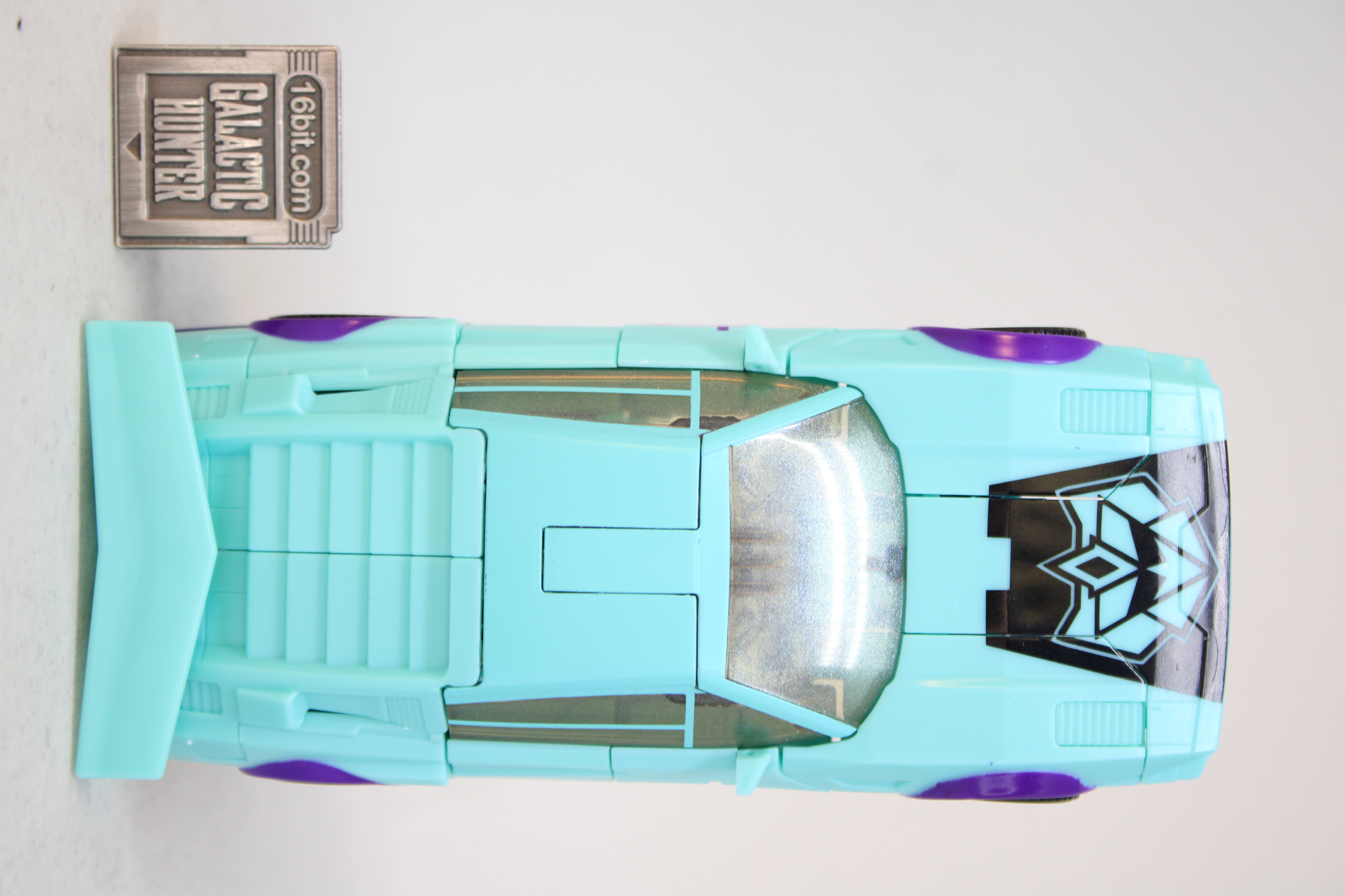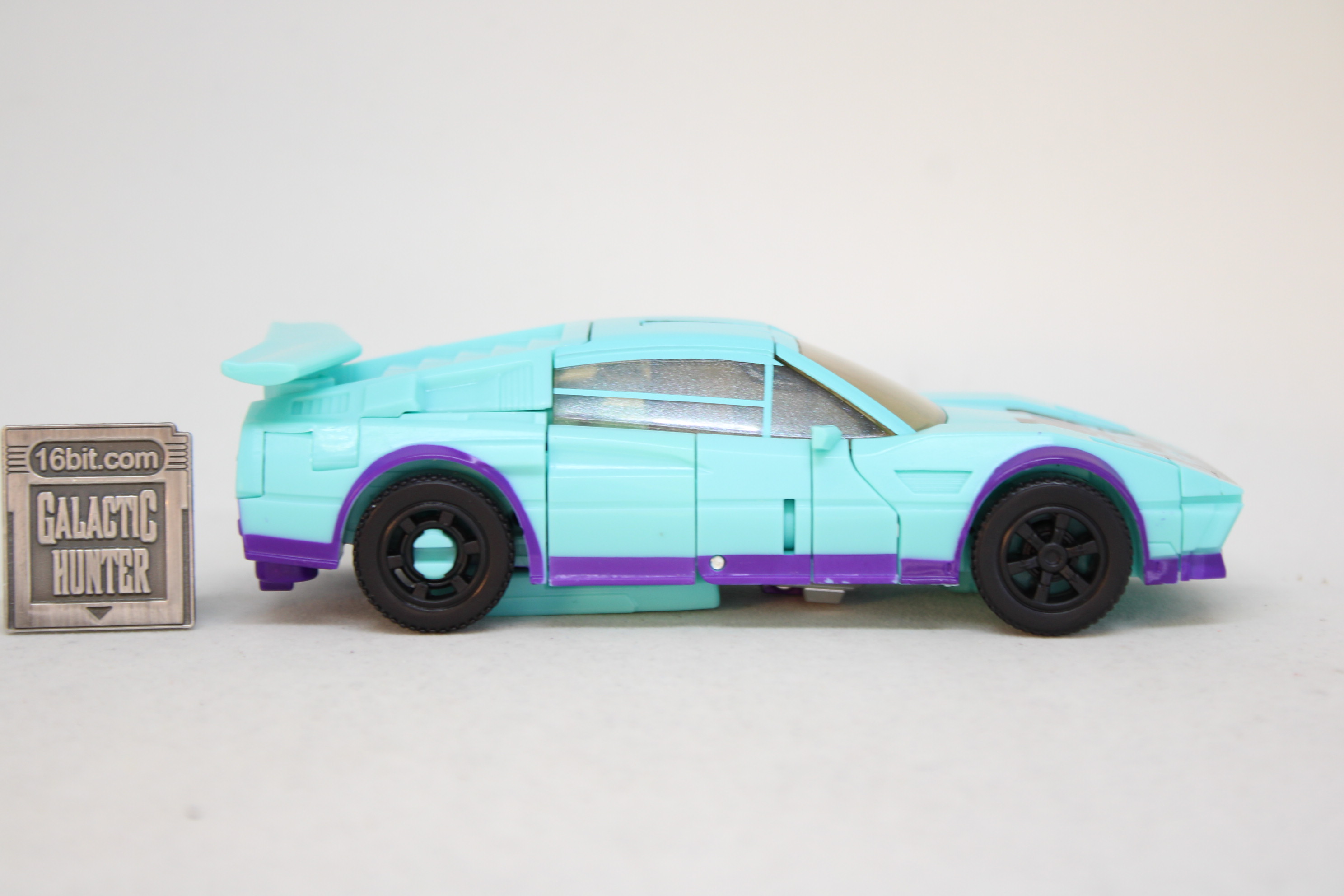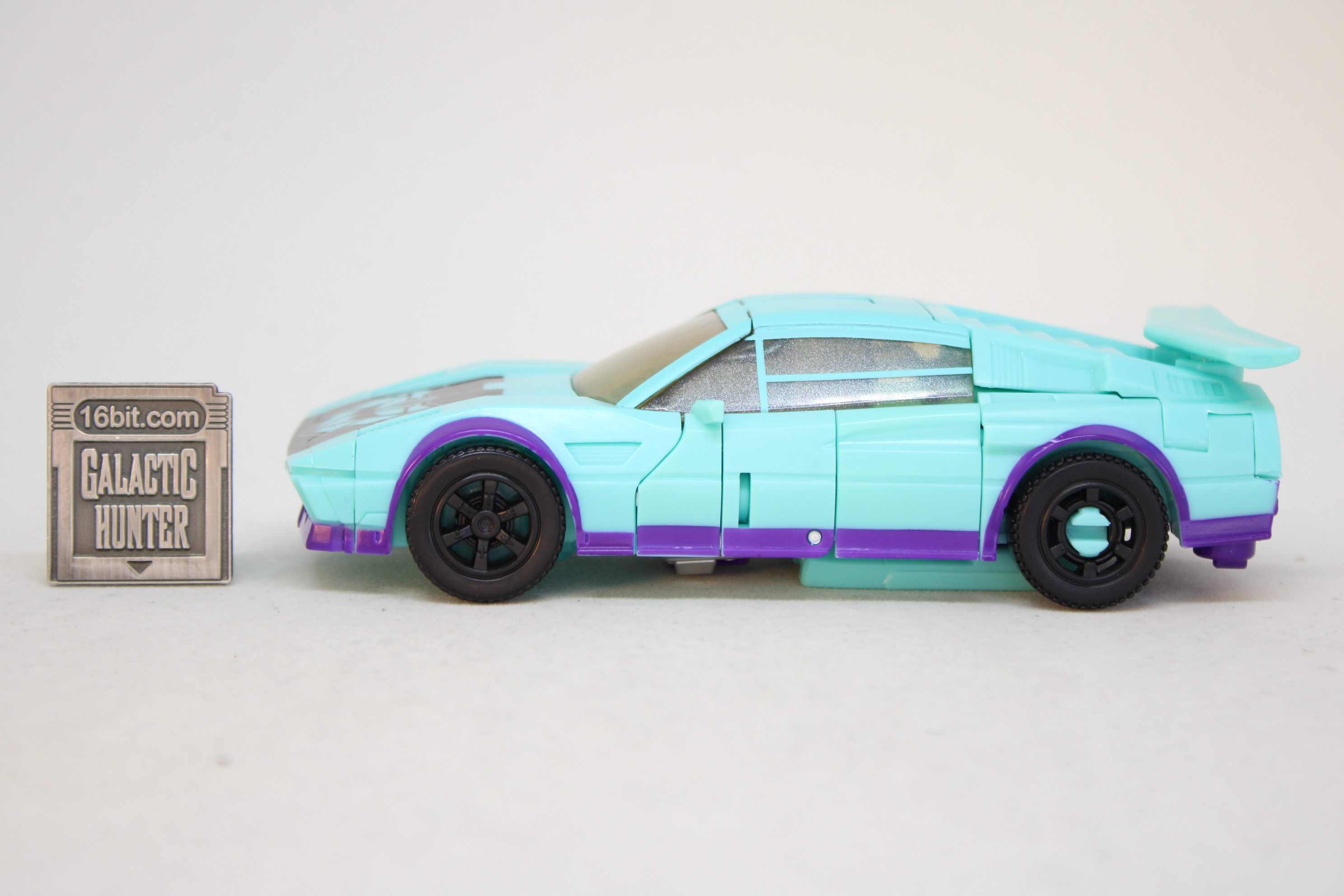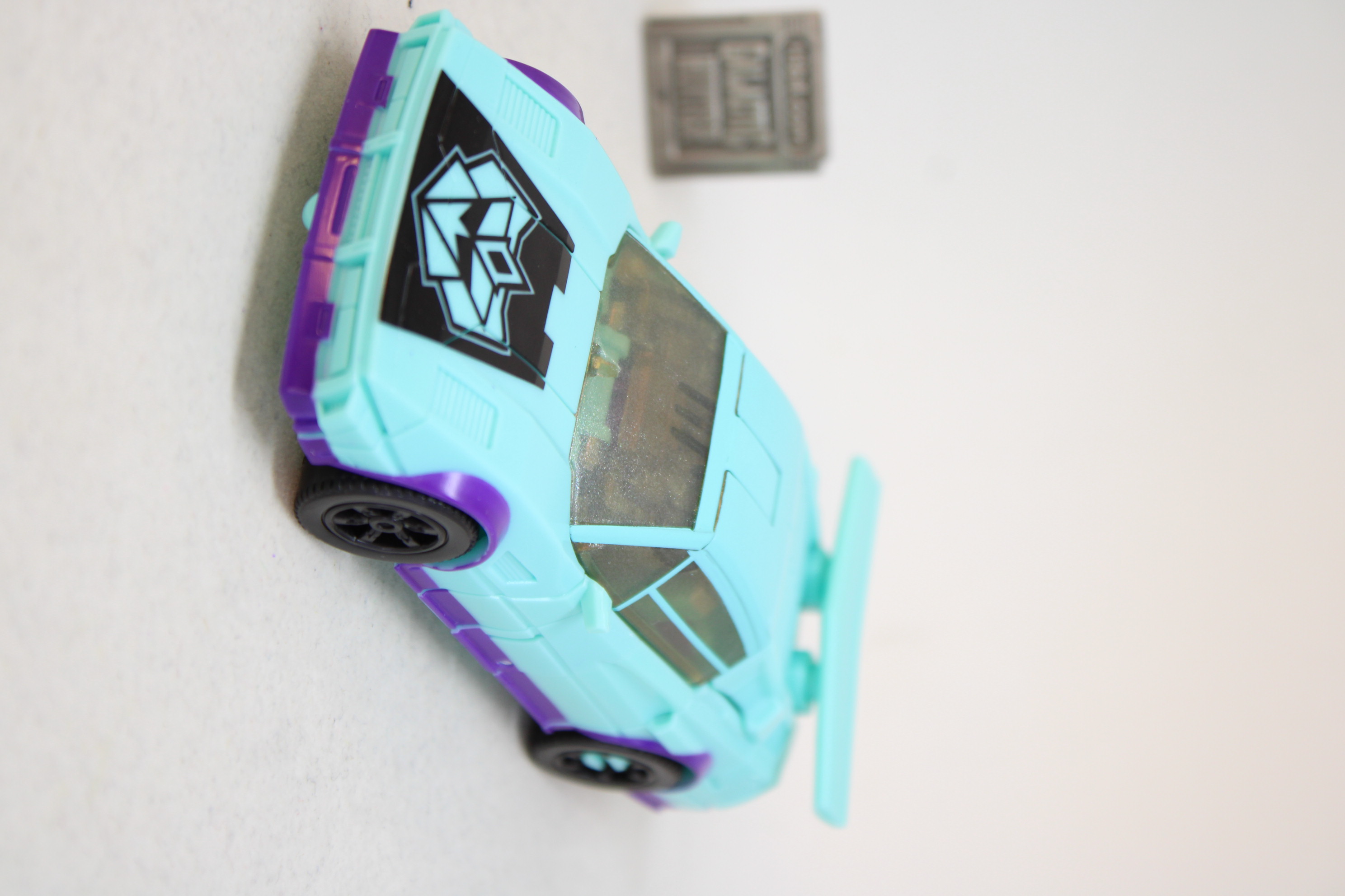 The car mode brings you the lambo with many - but not all - of hte major landmarks. The purple trim is present, as is the G2 Cybertronian Decepticon Empire sigil on the hood. You don't get the name tag on the door, nor the roof decal, but everything is otherwise close to how he looks on his wiki pages. The wheels roll about as well as they can these days, with the blaster mounting under the toy's hood quite nicely. The spoiler goes where it belongs and most of the car looks like one might expect. Maybe the colors aren't as saturated as a real one, but I've never seen the real one - just the TFWiki pictures. I'm assuming those colors are perfect because I know M Sipher and I know this is a meticulous photographer.