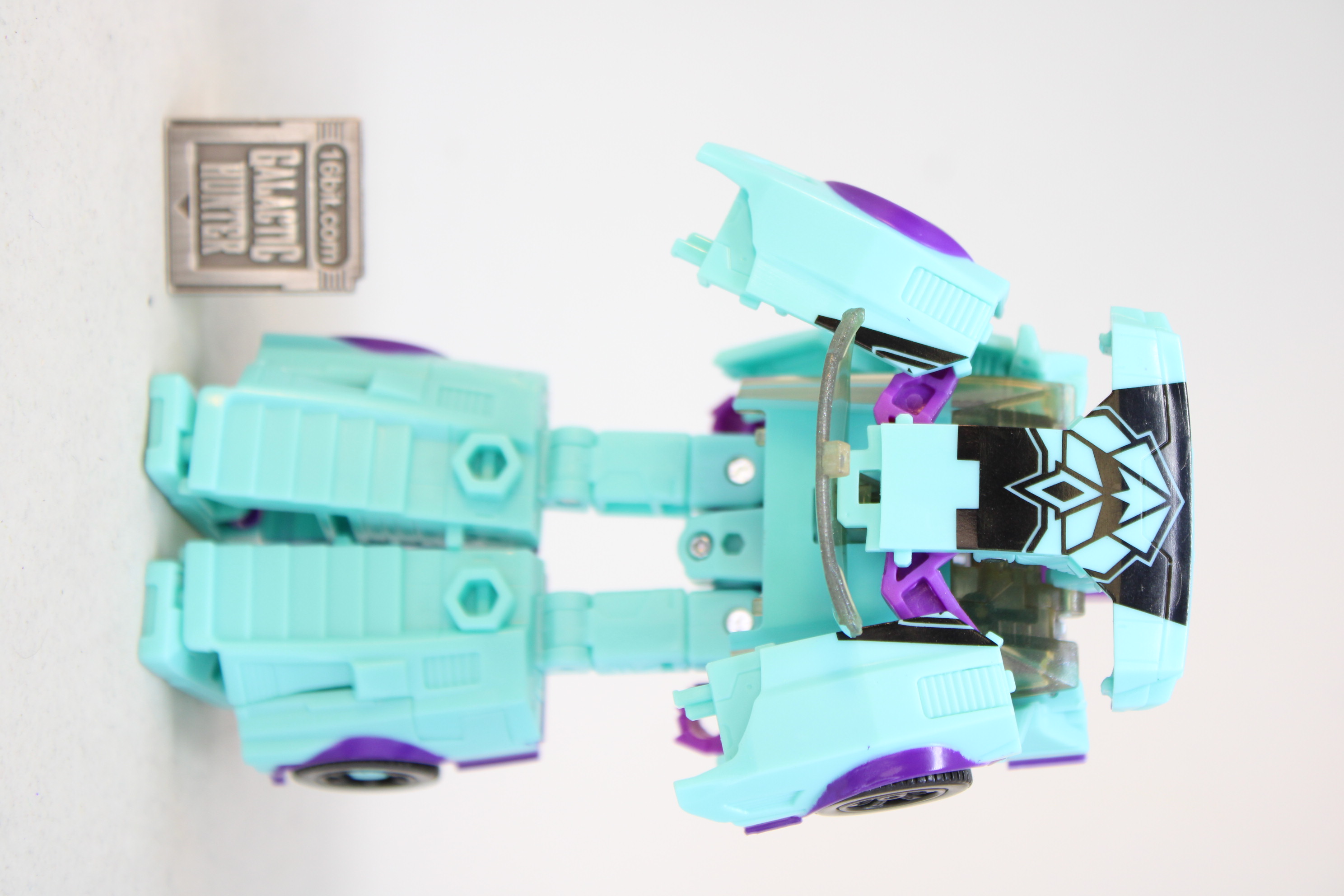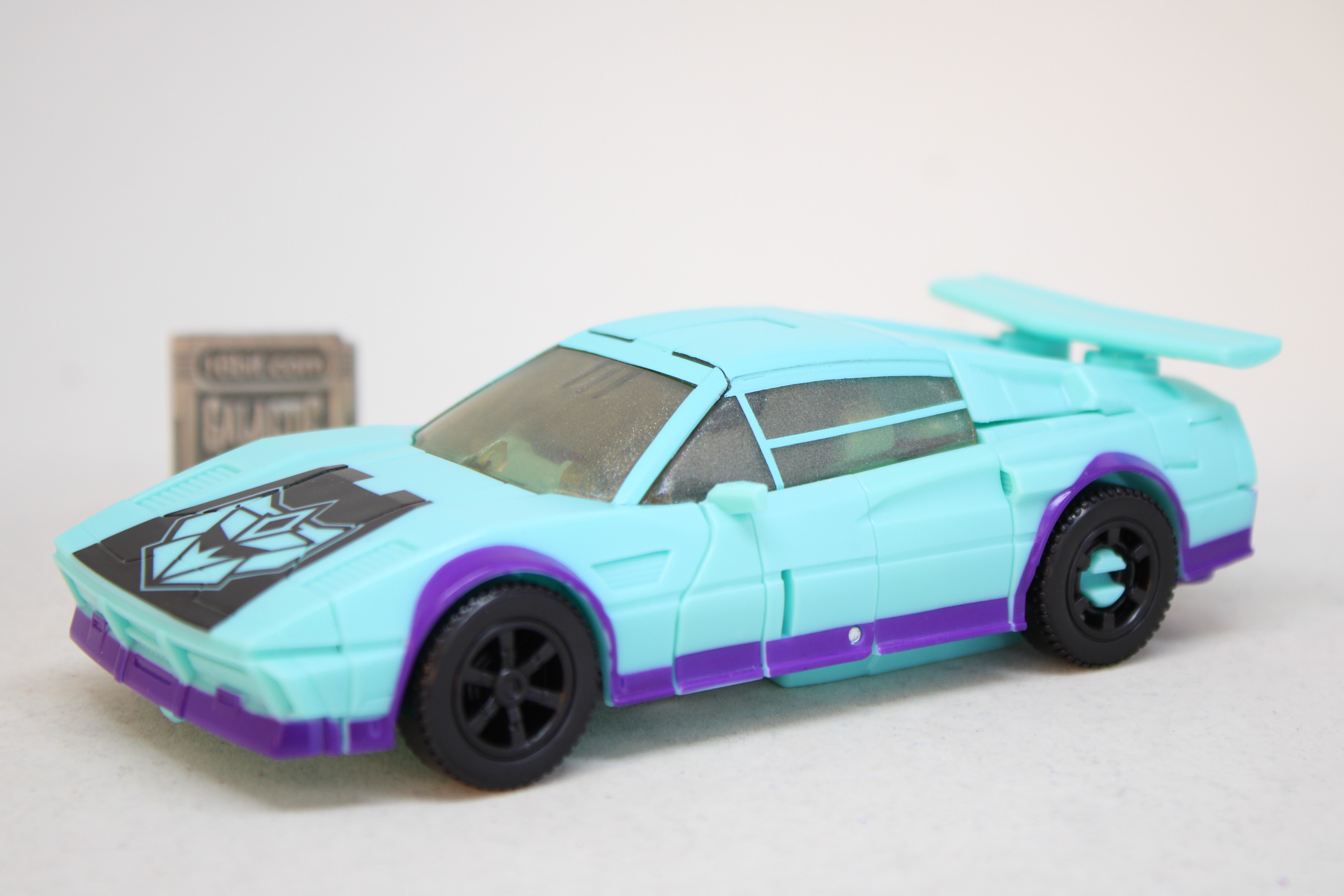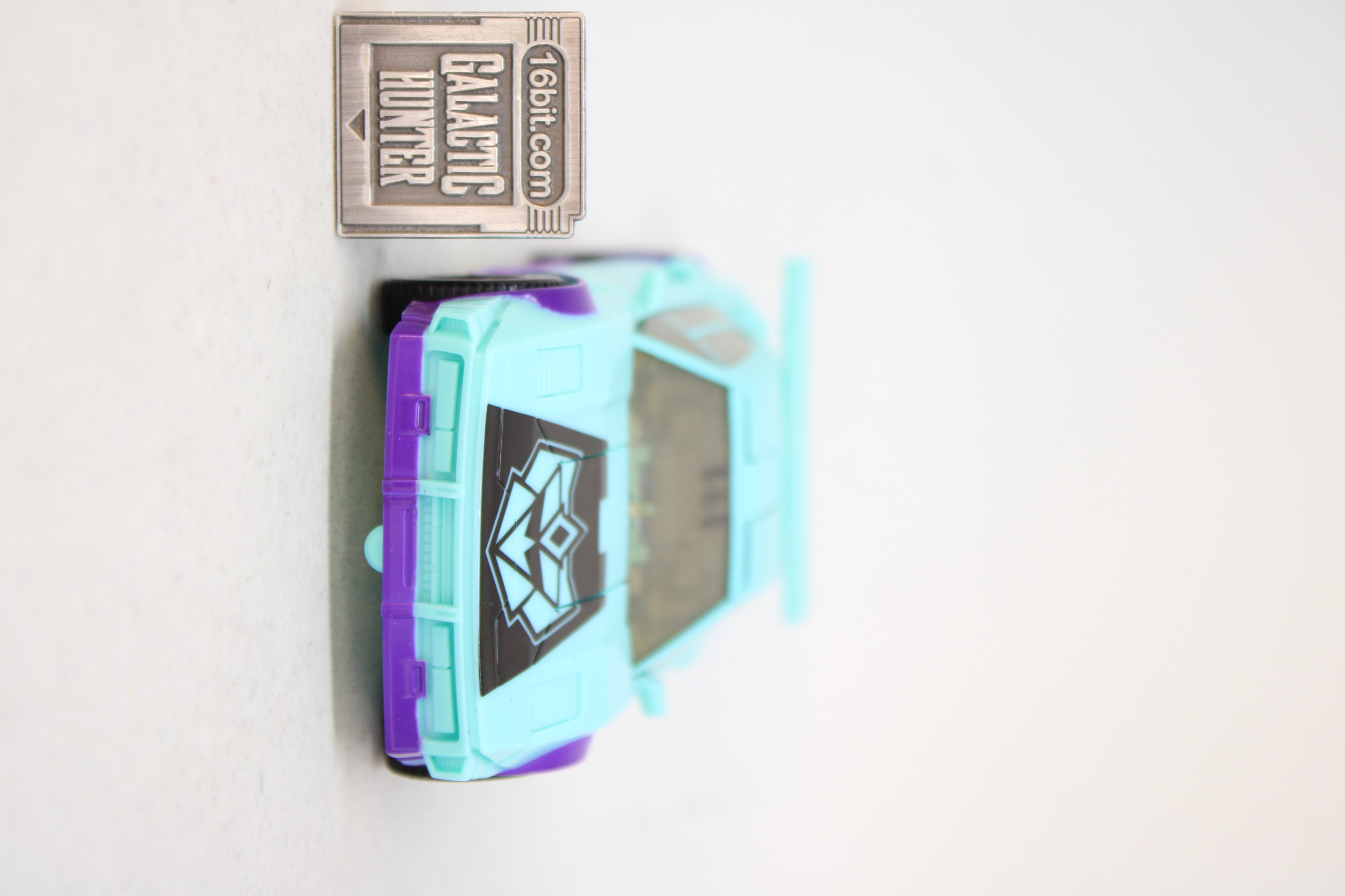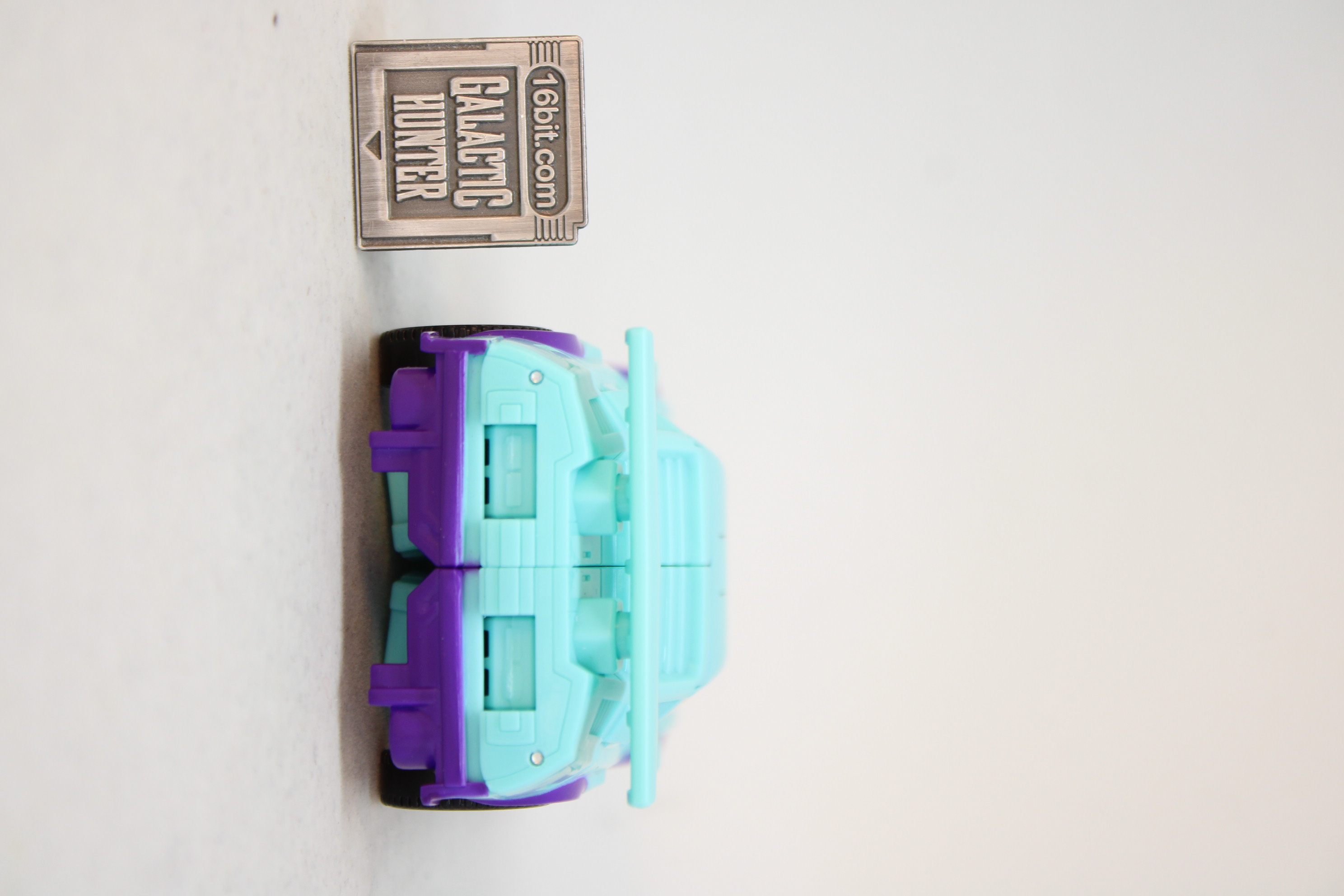 The car mode brings you the lambo with many - but not all - of hte major landmarks. The purple trim is present, as is the G2 Cybertronian Decepticon Empire sigil on the hood. You don't get the name tag on the door, nor the roof decal, but everything is otherwise close to how he looks on his wiki pages. The wheels roll about as well as they can these days, with the blaster mounting under the toy's hood quite nicely. The spoiler goes where it belongs and most of the car looks like one might expect. Maybe the colors aren't as saturated as a real one, but I've never seen the real one - just the TFWiki pictures. I'm assuming those colors are perfect because I know M Sipher and I know this is a meticulous photographer.