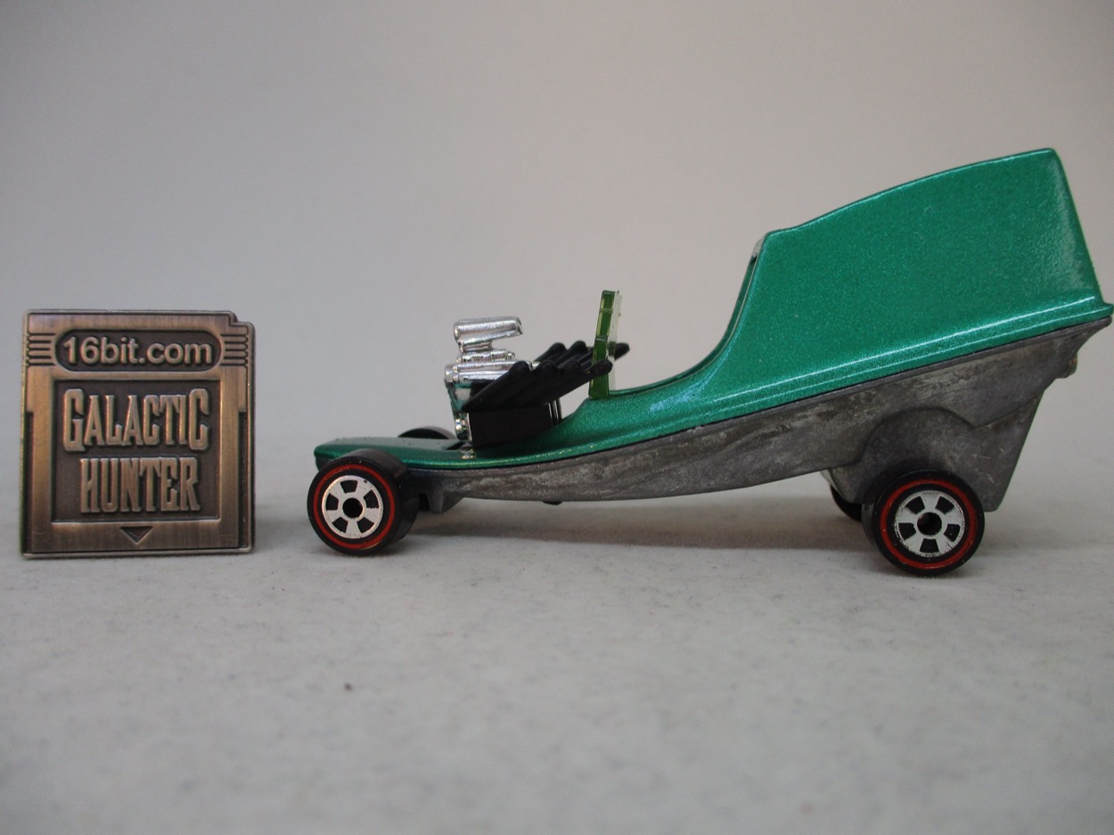 The metalflake green paint and red-trimmed black wheels with some chrome look really nice. It's not as great as the not-quite-Spectraflame paint of the originals, but it's striking. It has a cool tampo on the back, and it doesn't look like something that should be able to exist. It's marvelous. The wheelbase is similar to Hot Wheels and Matchbox, so if you want to run this on those playsets or tracks? Have at it.