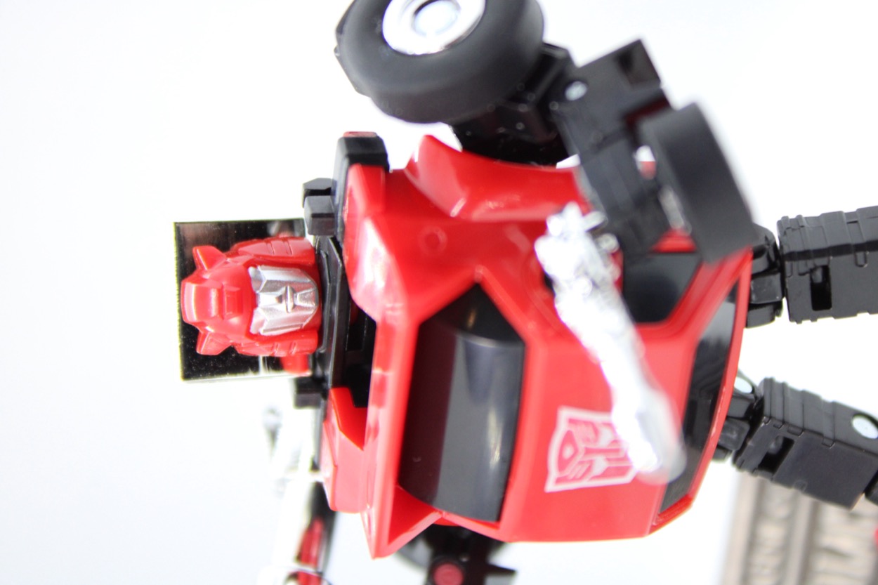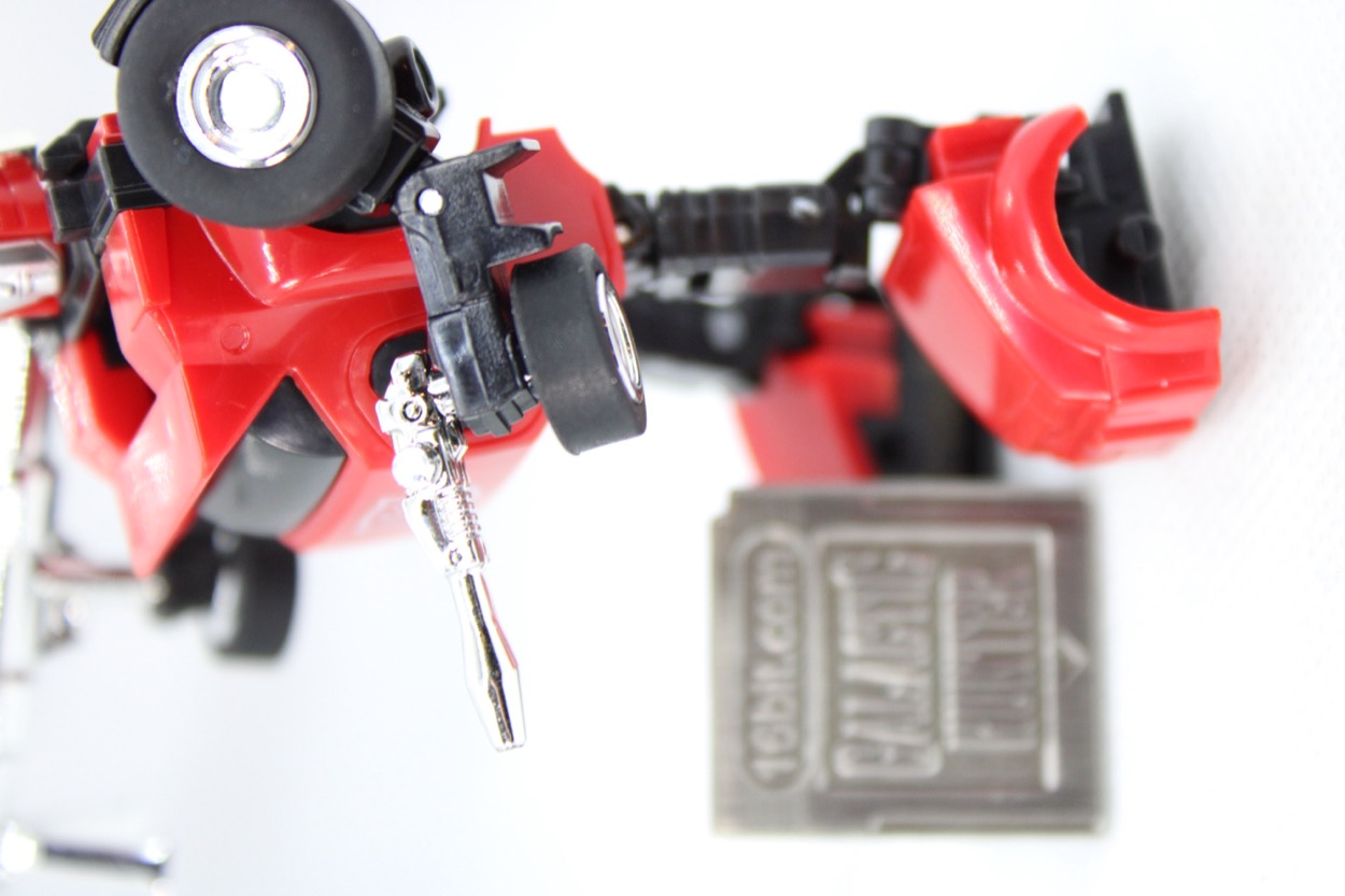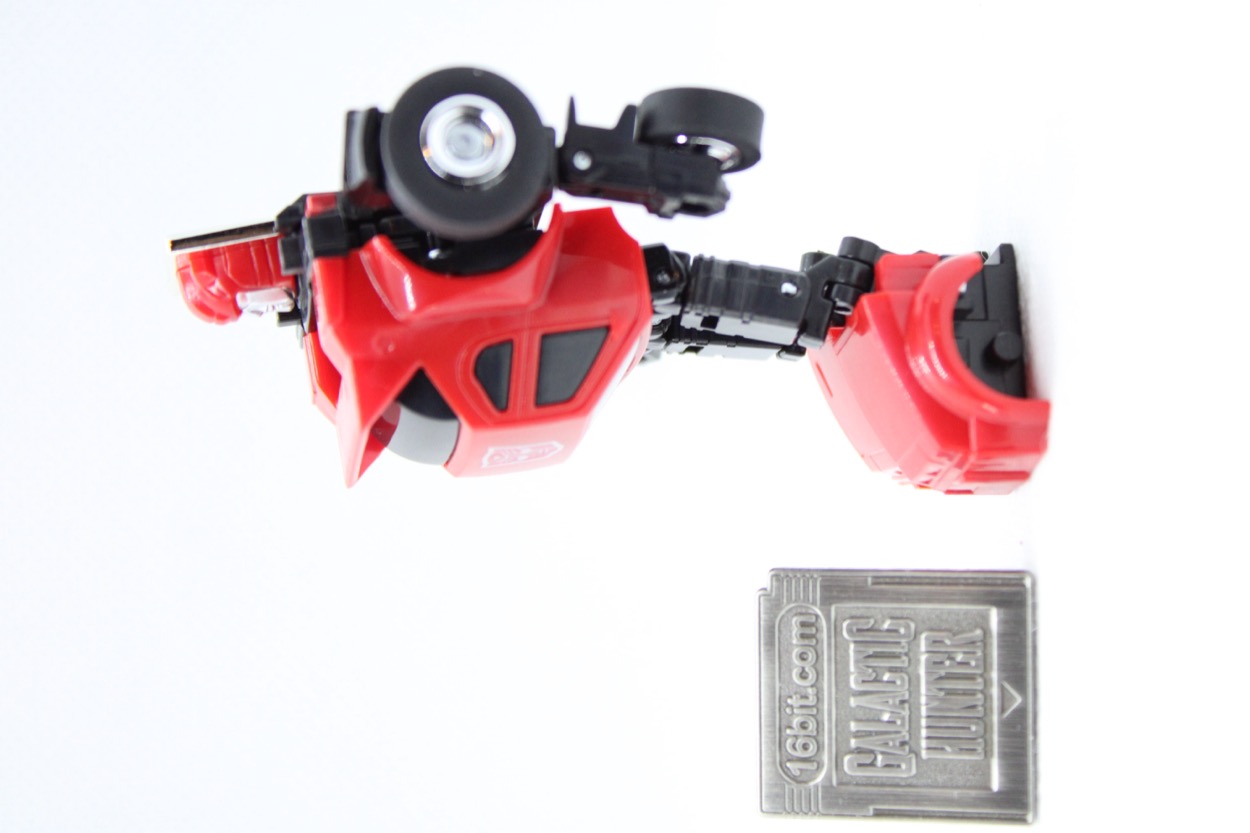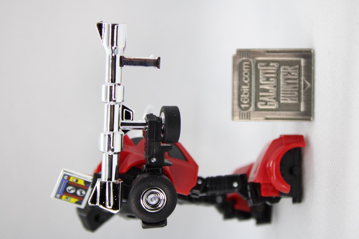 The main added joint that matters is at the neck - he can look around now! The original could only fold in and out for transformation, limiting how expressive he could be. Takara-Tomy made sure he can assume his various packaging art painting poses, which - while awesome - is probably not how most fans will display this toy. At least, not unless he included a display stand, and he doesn't. A 3mm port in his back will allow you to make one, or borrow one from another figure line. Since G1 Cliffjumper hasn't been reissued since a Basic Fun-driven key chain in 2007, odds are this is the Cliffy to get. Having said that, I'd still encourage Hasbro and Takara-Tomy to reissue the original some day. It'd sell... and you could apply the toy-inspired stickers included with the Missing Link toy to it. Cliffy has a couple o faction symbols, some of those rectangular Diaclone stickers, and a 1984 packaging art--inspired flat-head faction symbol that's pretty great.