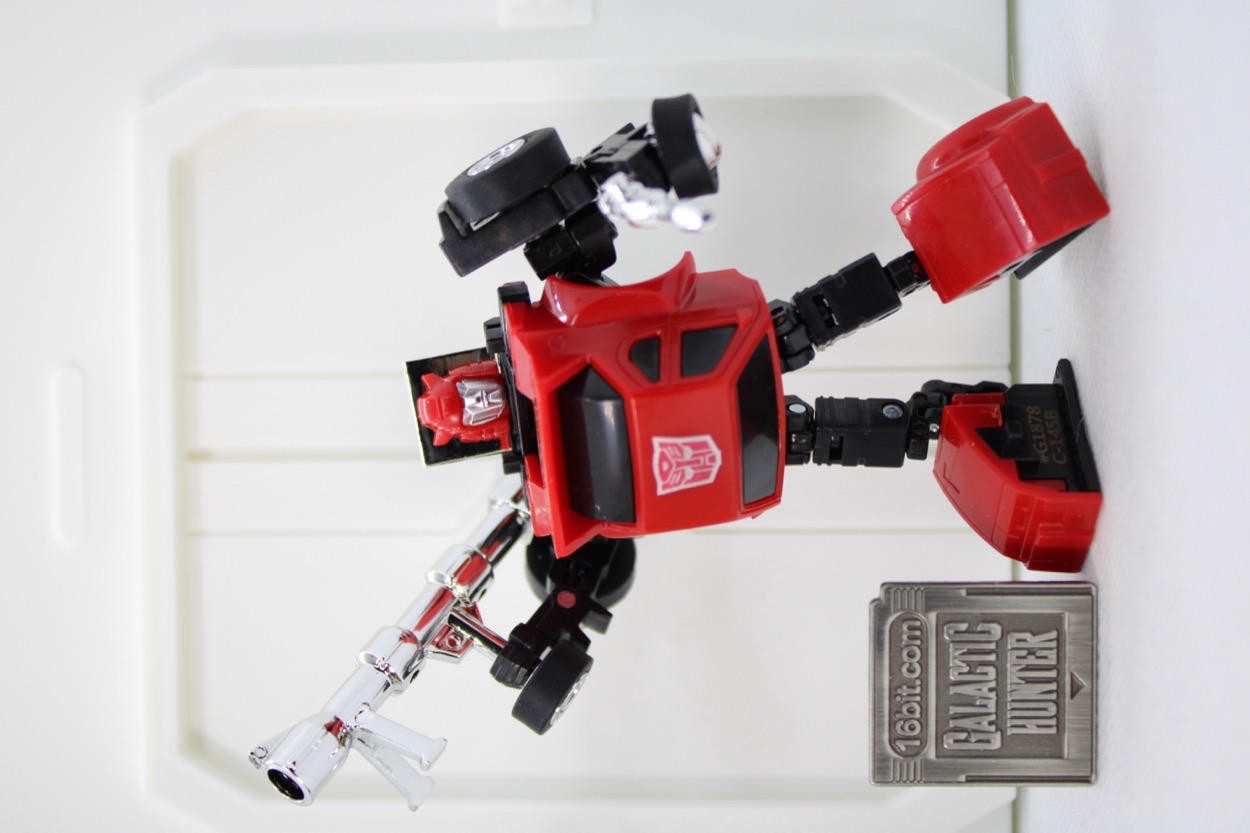 This Cliffjumper is a lot like Bumblebee [FOTD #2,819], with pretty much the exact same transformation and articulation. The head is new, the chassis is new, and the accessories are different between figures. Since both have distinctive personalities, you might want both - but the pair will set you back at least $80, as opposed to G1 reissues, which were ten bucks a pop at the last US minicar rerelease.