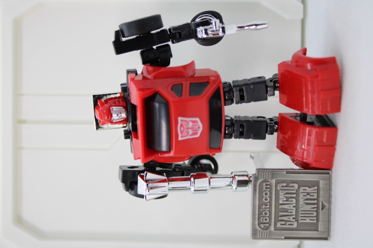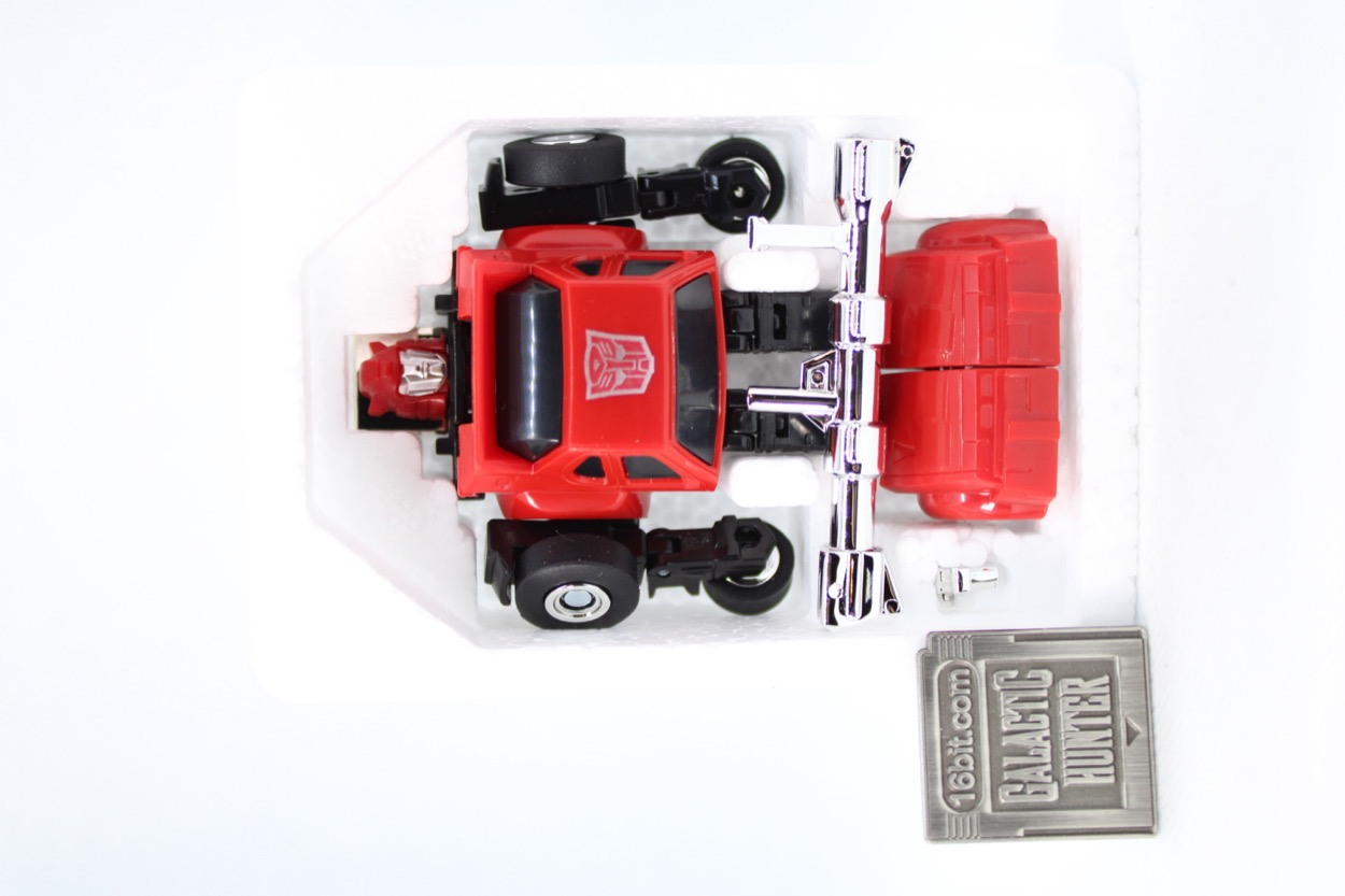 Also packaged in a tiny box, with a tinier box inside, nestled in a styrofoam insert, Cliffjumper is ready to go in robot mode. Prying him out of the foam was easy, but his blaster was kind of hard to remove. I assume some fans will want to use tweezers, or just rip apart the insert. I had an original as a kid - the "Listen 'n Fun" version - and it feels a lot like his default configuration. It's red, with a shiny backer to his red head, which has a silver face. Articulation is enhanced from the original with moving shoulders and elbows, plus some movement at the hips and a bit more at the ankles, but it's not exactly impressive like Optimus Prime. It's very clearly better, and I love having new vac-metal silver accessories, but I probably would have been just as happy with a straight-up reissue of the original robot.