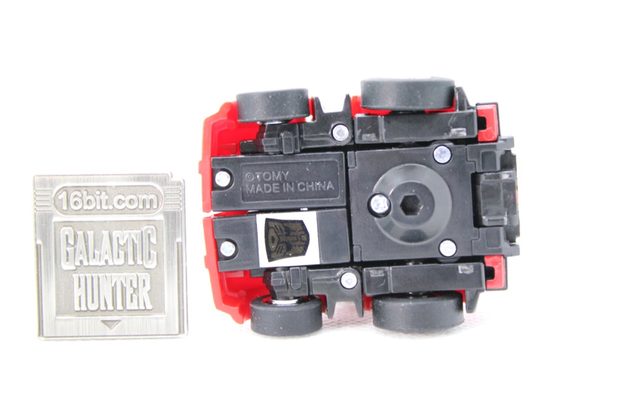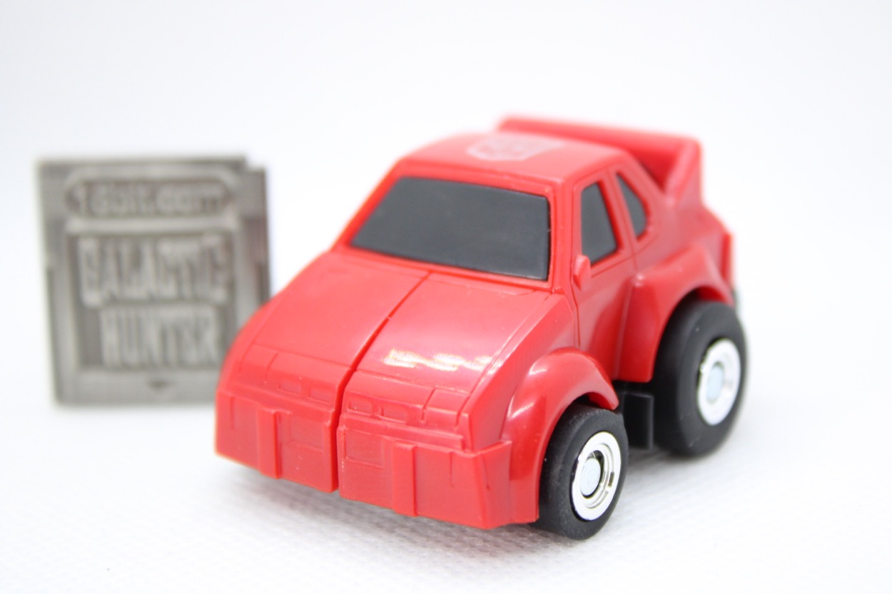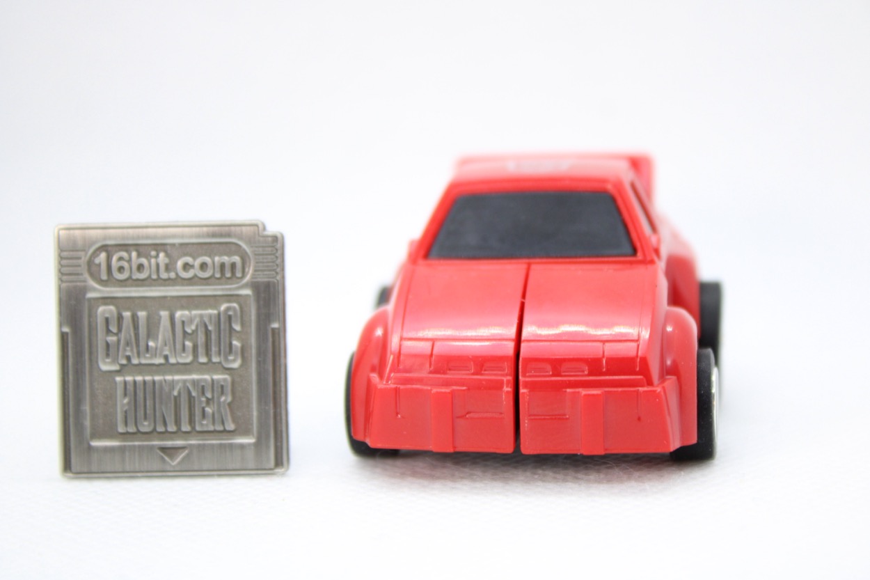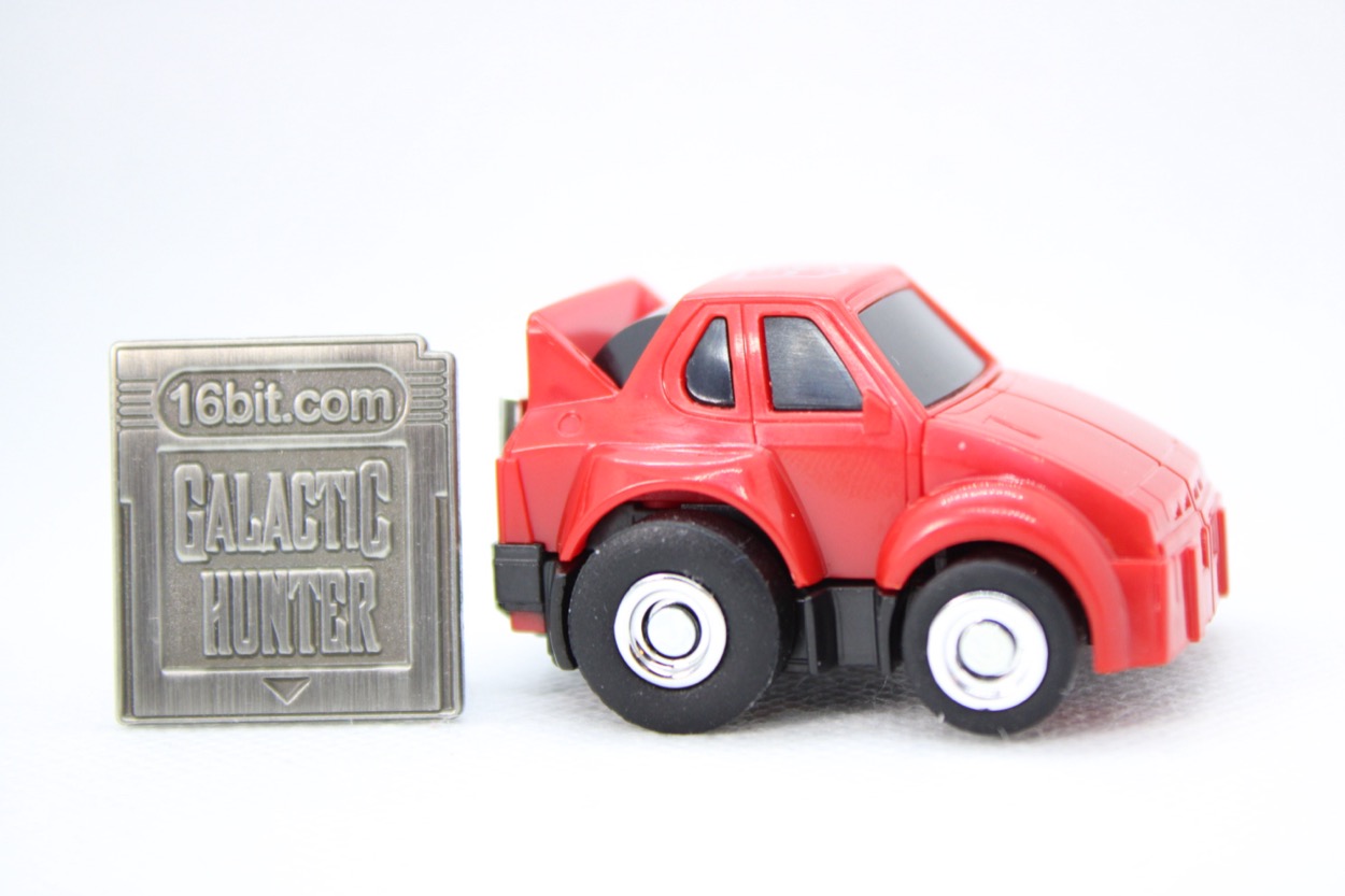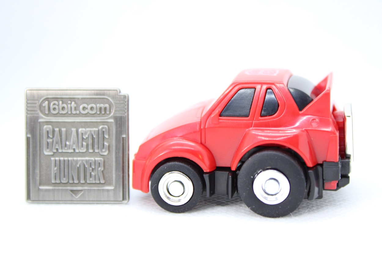 The car mode is very simple, and it reminds me a lot of the original. The 1984 toy rolled a bit better thanks to the wheel alignment not taking a back seat to elbows, but it's still very good. There's a tiny gap between the rear plate of Cliffjumper's head and the back of the car, and it seems the legs don't go together perfectly well to form the car's hood... but it's very close. At this size, I assume those kinds of tolerances are hard to pull off. Even though it may not be perfect, it's still very good. A reissue of the original toy might suffer similar problems.