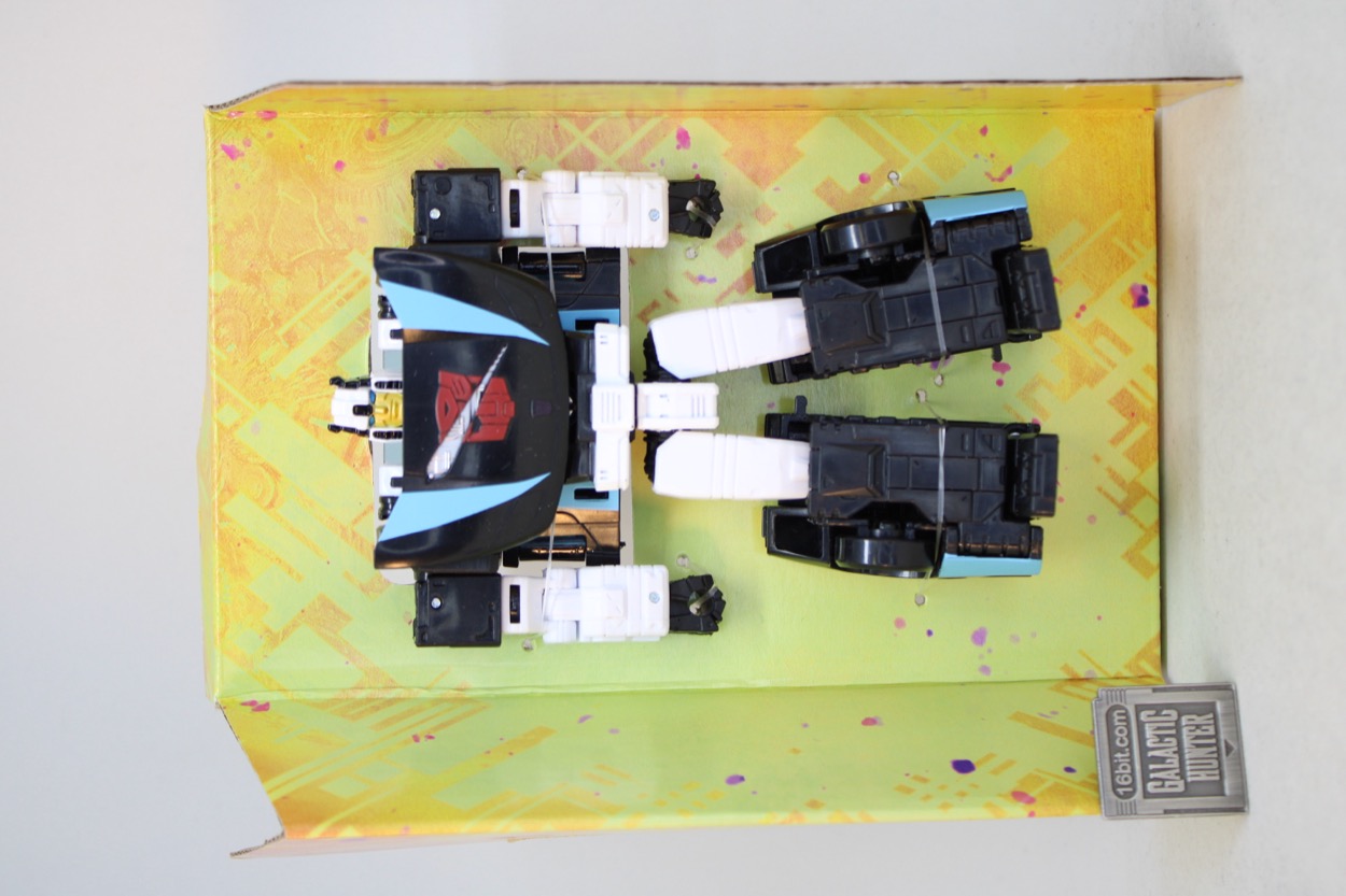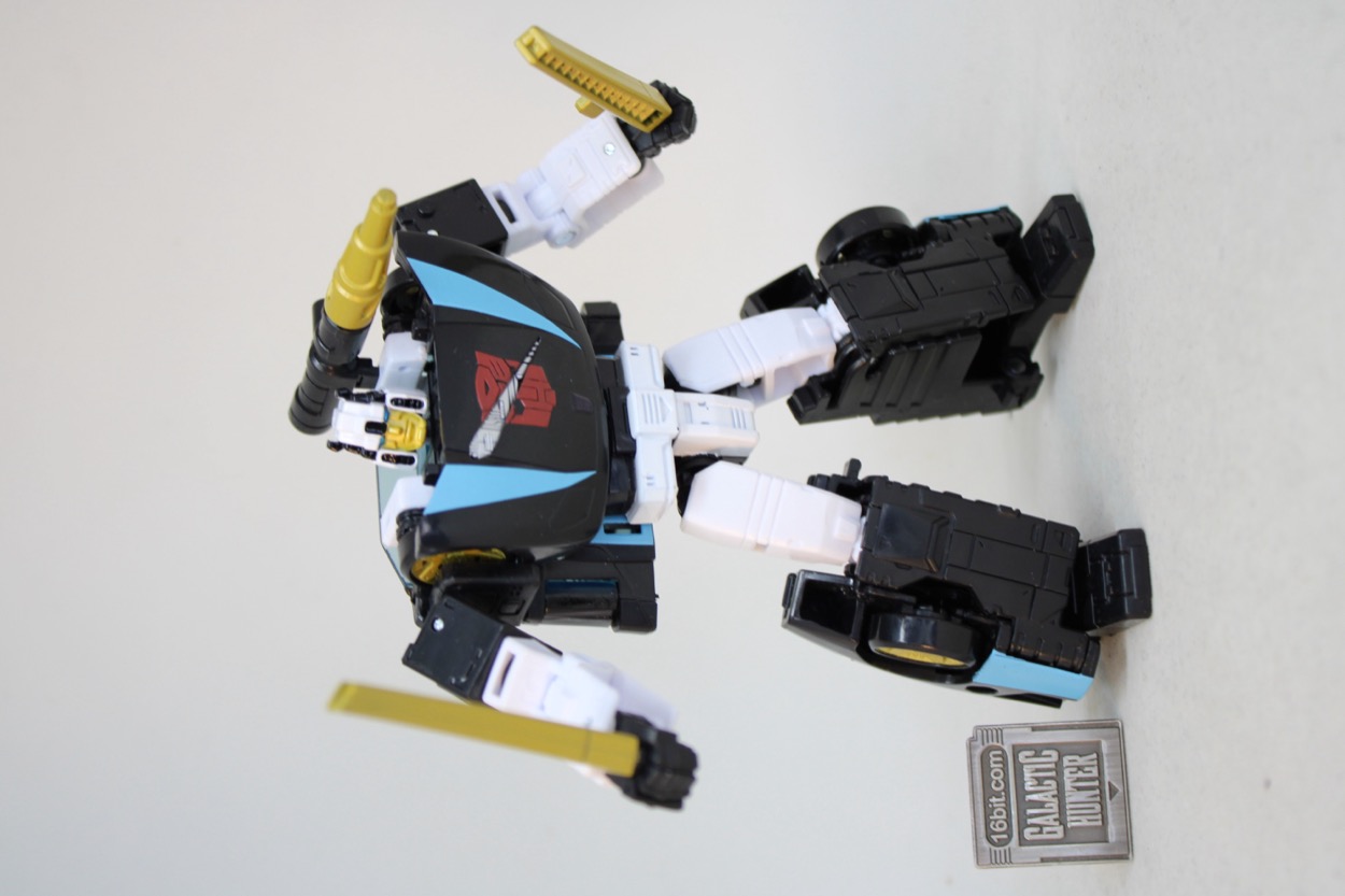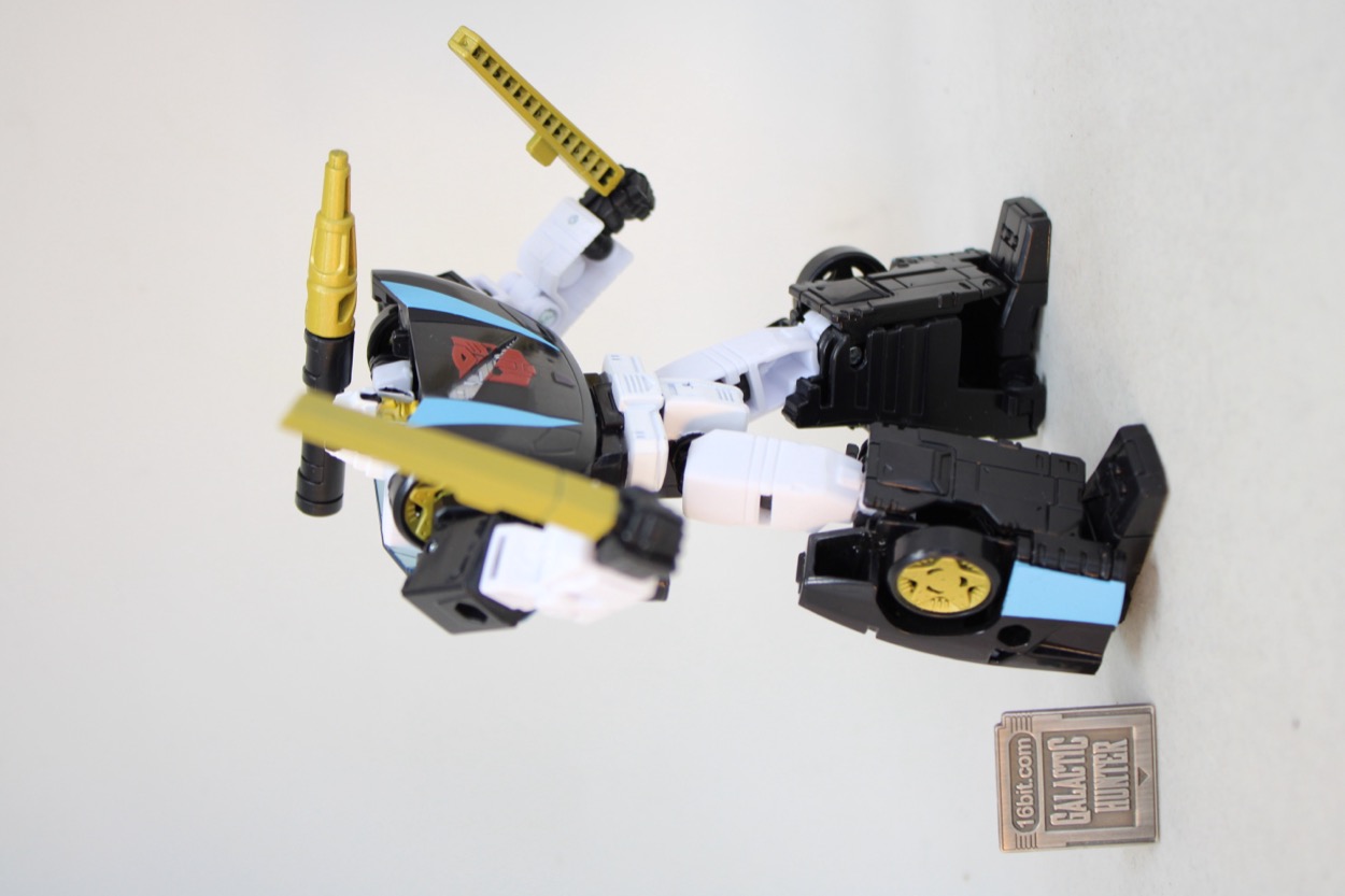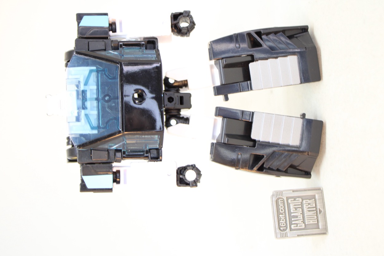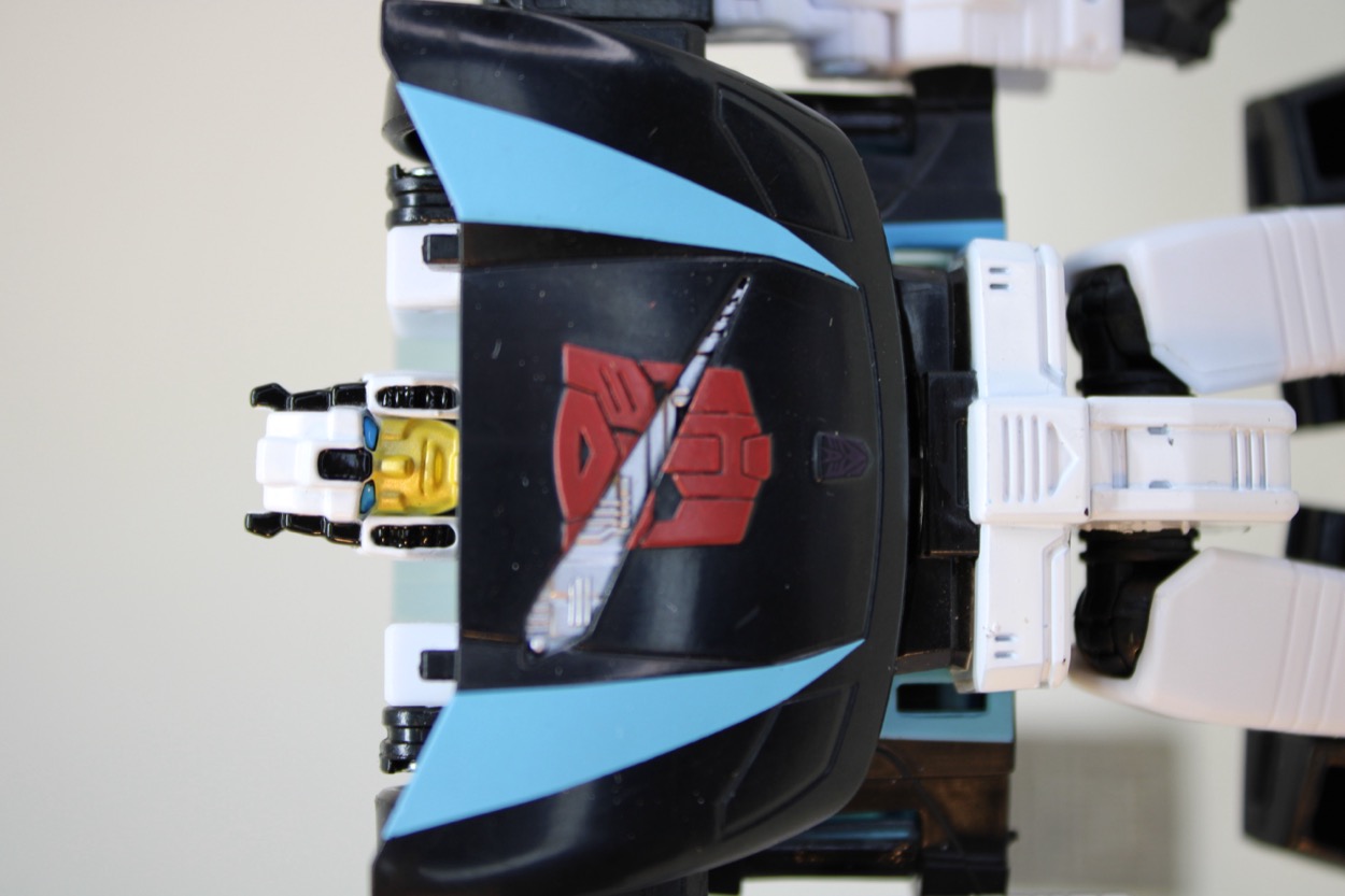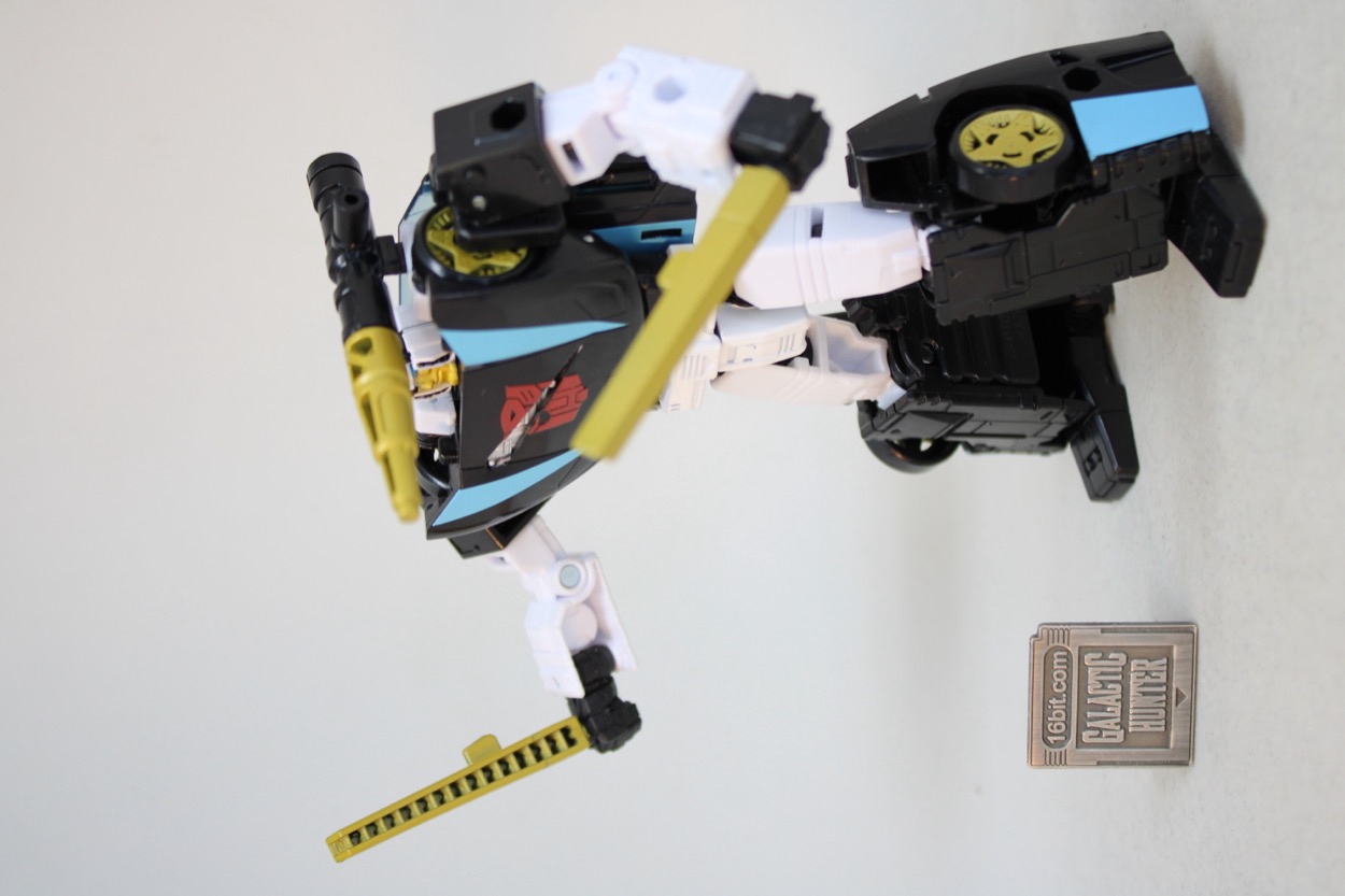 Since you no doubt have multiple versions of this mold already, I'll spare you from explaining that the detail is mostly all the same. The head sculpt is very good, and more like the cartoon. Black horns adorn a white helmet with a gold face, complete with blue optics. His chest is black, with blue stripes surrounding a molded and slashed-out Autobot symbol, with a Decepticon one underneath. I'm kind of surprised they didn't just bolt a new Decepticon symbol over the old Autobot one, but I guess this looks more dramatic. His limbs all move nicely, and rather than bright yellowish orange bits, he now features gold. Looking at the cartoon, this was probably the right move. Similarly, the stills on TFWiki don't show the purple forearm symbol in the cartoon so I'm not going to gripe that it's gone. Despite not being a taller robot with spring-loaded action features, Hasbro captured the essence of the character to the extent that you'll look at it and say "yup, that's him!"