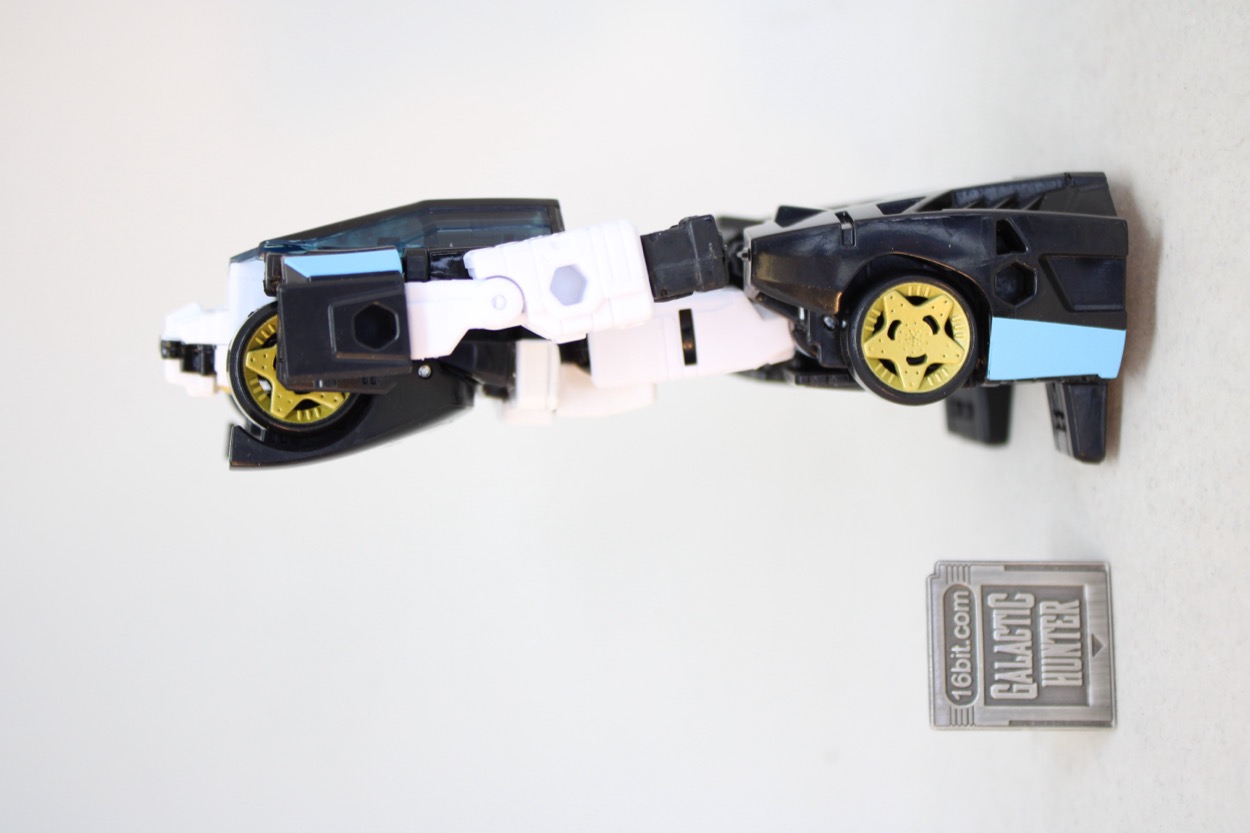 I don't love complicated transformations - so I love this toy. Hasbro goes back and forth between simple things and things that somehow don't budge and stab you somehow. Transformation is a breeze - every panel swings nicely and everything fits together well. The swords fit on the sides of the car, the blaster mounts on top, and at no point do I feel like a chump for having spent at least $300 on various incarnations of this mold over and over. Everything works. You get a car, and it looks like a car.
