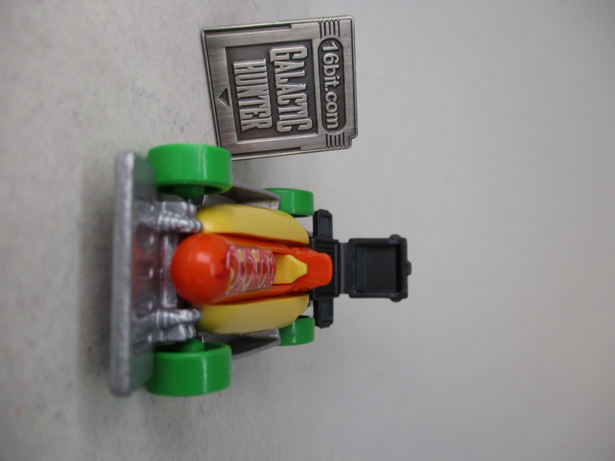 It seems almost silly to write about this toy in any detail - to do so basically ruins the joke - but you can see a tiny seat, some ketchup and mustard detailing, plus some tip-top fast food red-and-white art on the sides. The painting is quite crisp, and more or less replicates the kind of "plate" you might get at a number of old-school roadside fast food joints. Or maybe those are out of vogue - hot dog joints seem to be on the decline in suburbia, but you'll still find some here and there. (Have you tried Korean corn dogs yet? Give one a shot.)