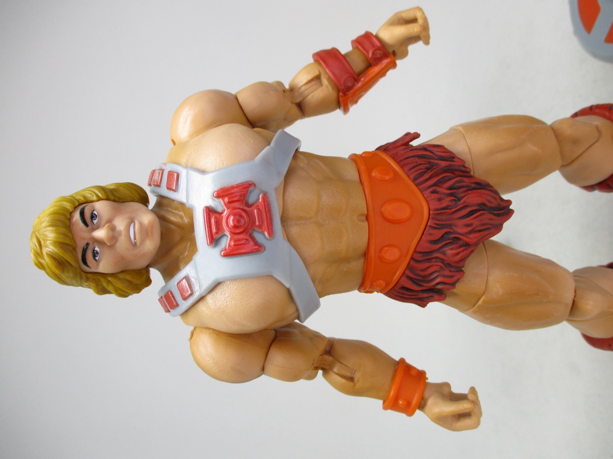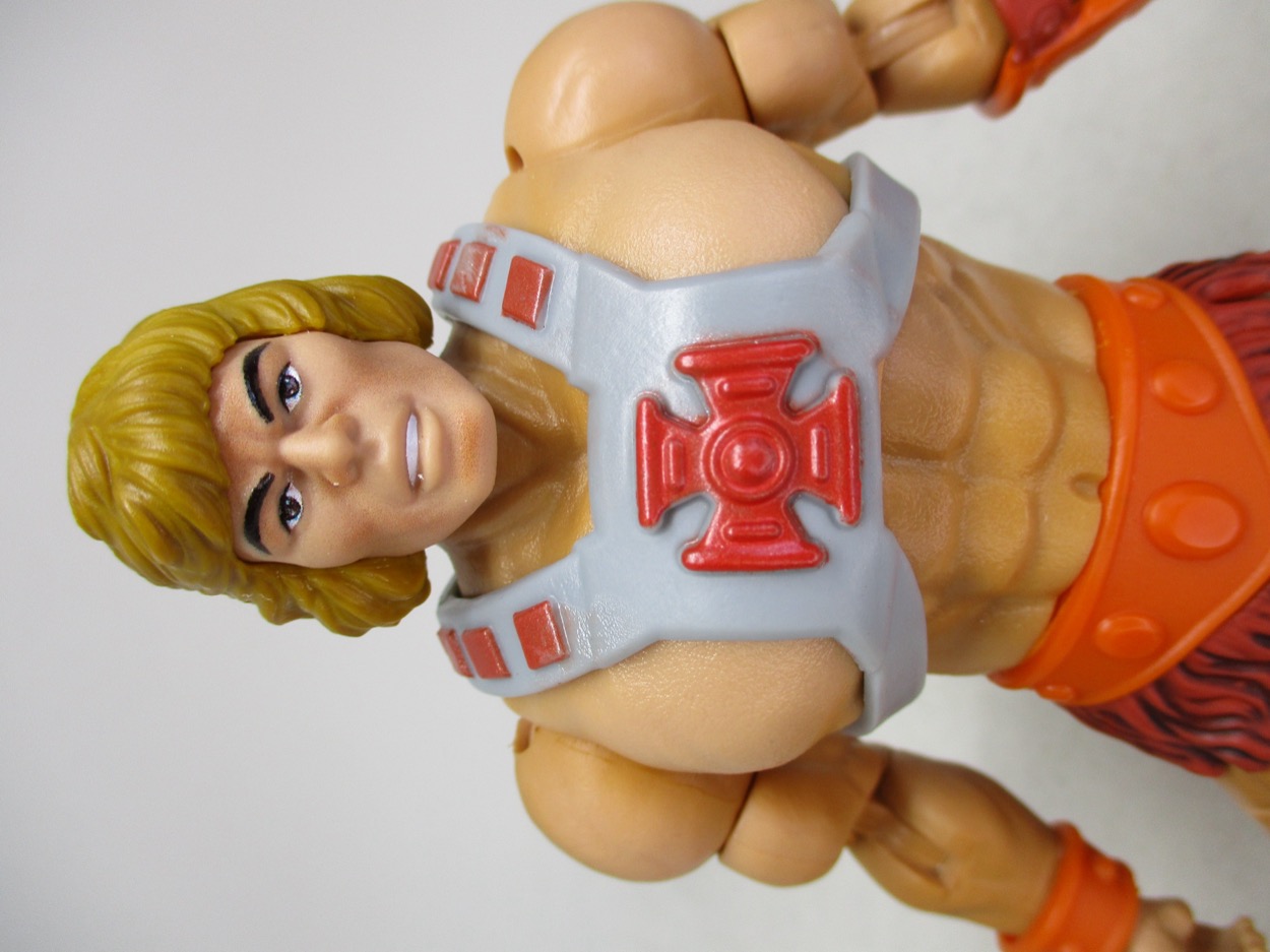 The head sculpt does its best to update that old toy. The teeth shine that white smile you no doubt remember, with slightly better painted eyes and much nicer hair. The head spans multiple generations and as such doesn't quite nail "1982 head" or even "modern head." It's He-Man-esque, but it's not quite the update I would have expected. I guess that first Origins head wasn't either - but at least Mattel made sure they all have a flavor of that original character. His noggin seems a little small on the body, as his arms are a bit bigger than his head.