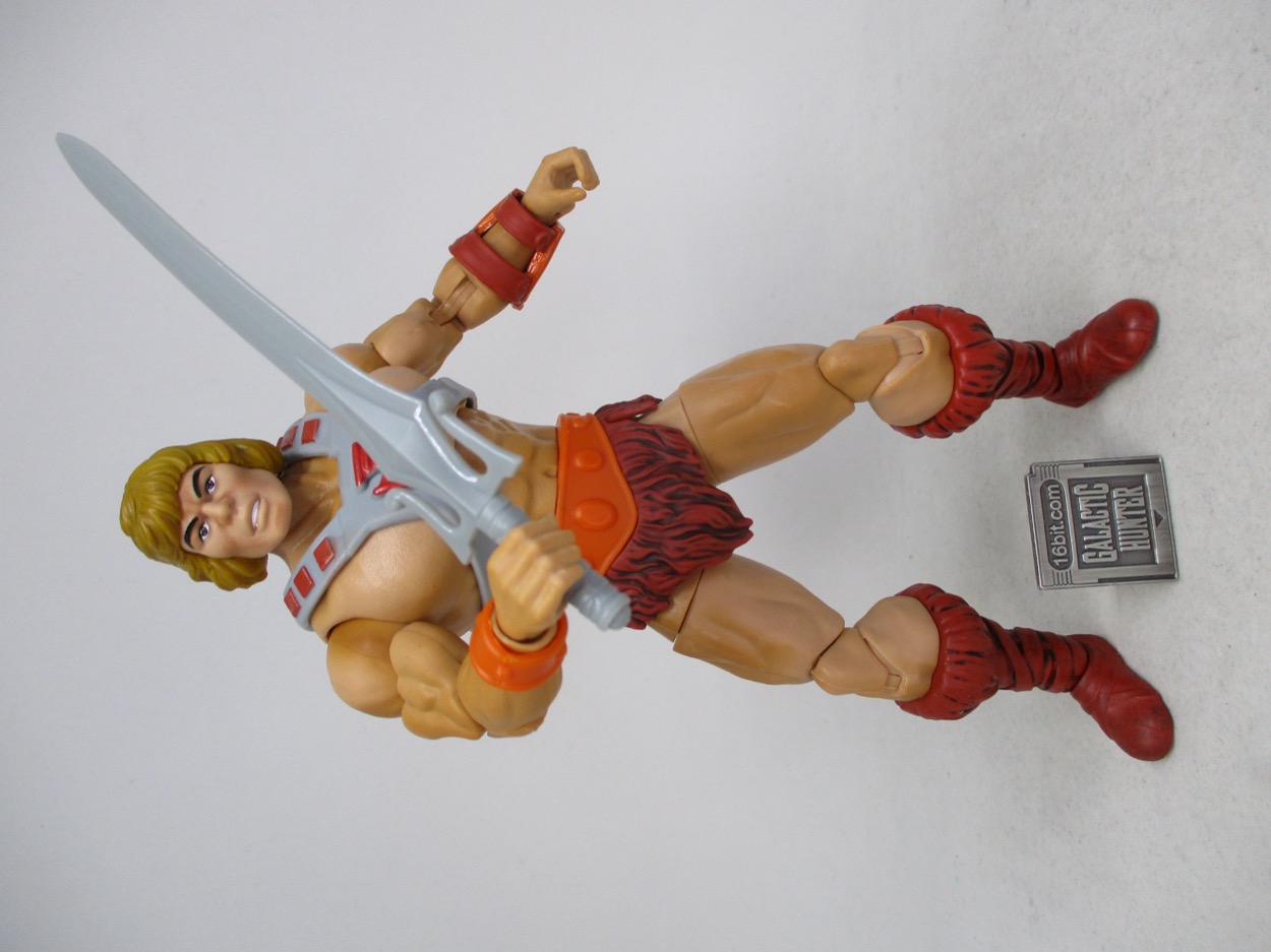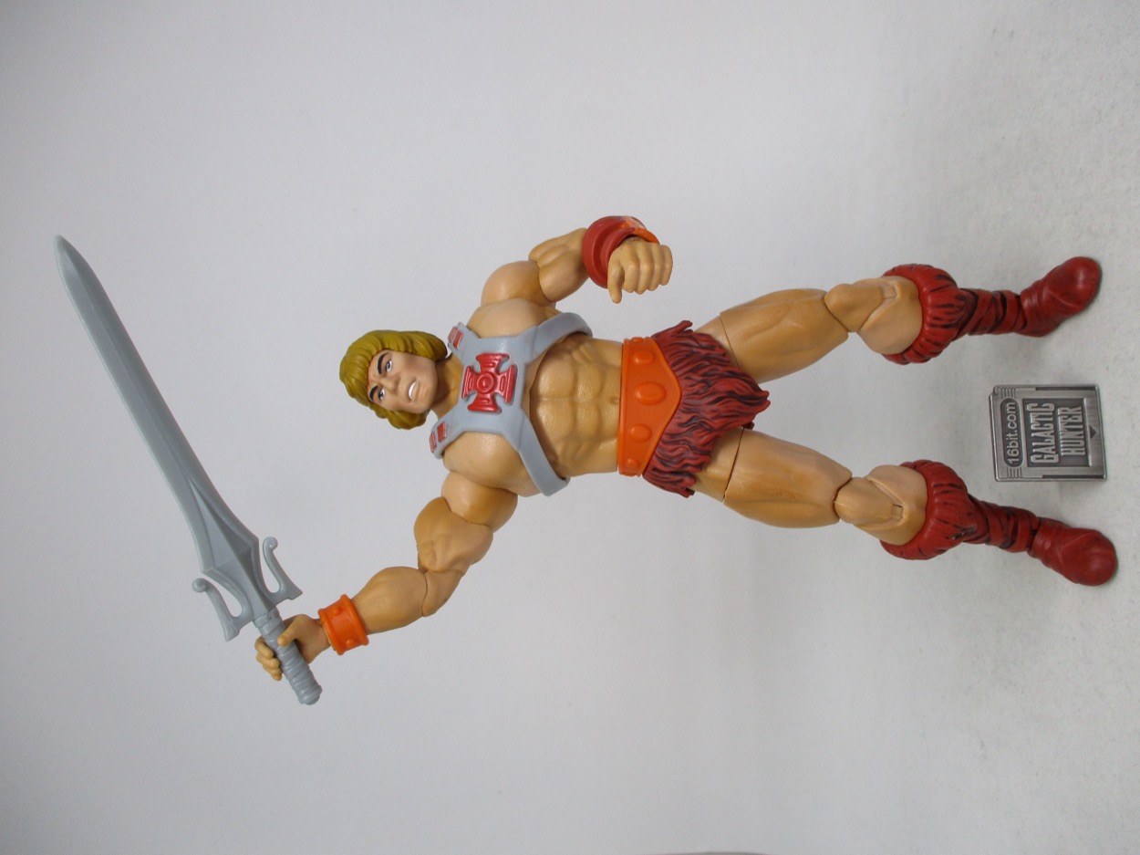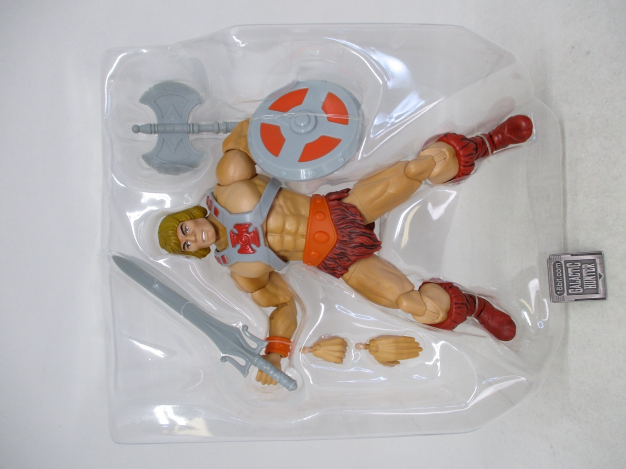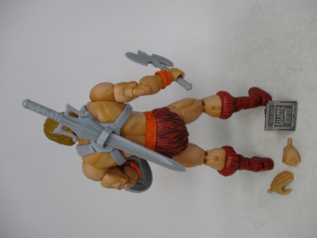 The figure includes a shield, sword, and axe inspired by the original toy - or really, your memories of the original toy as colored by the TV show - plus a punching right fist and an open left hand. It's a decent suite of accessories which he can hold, or stow the sword on the back of his armor.
