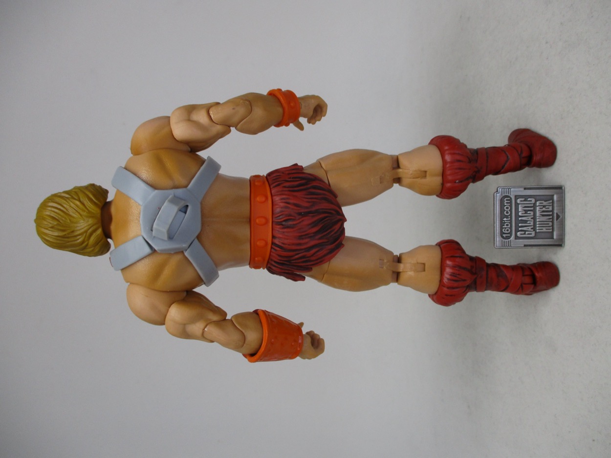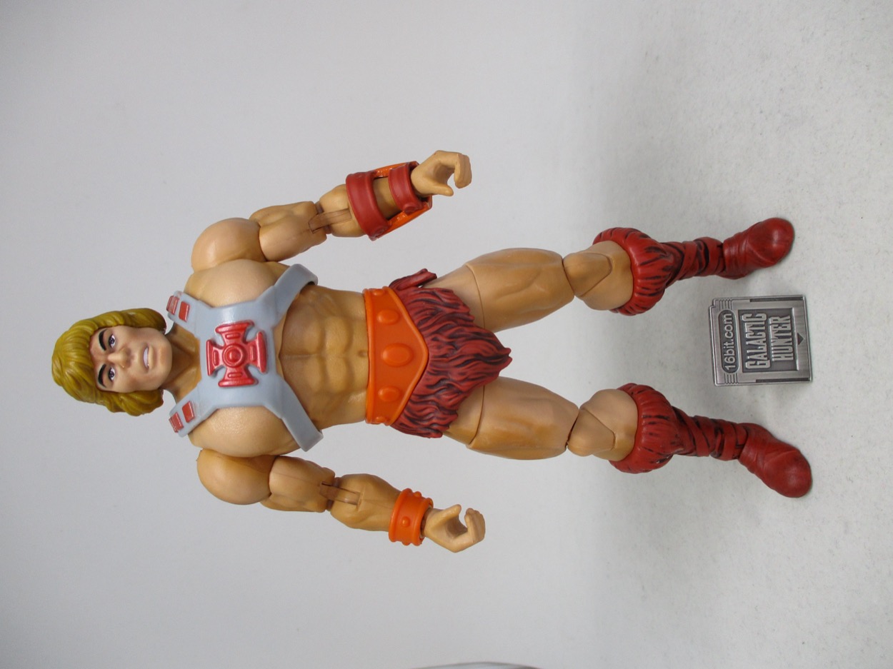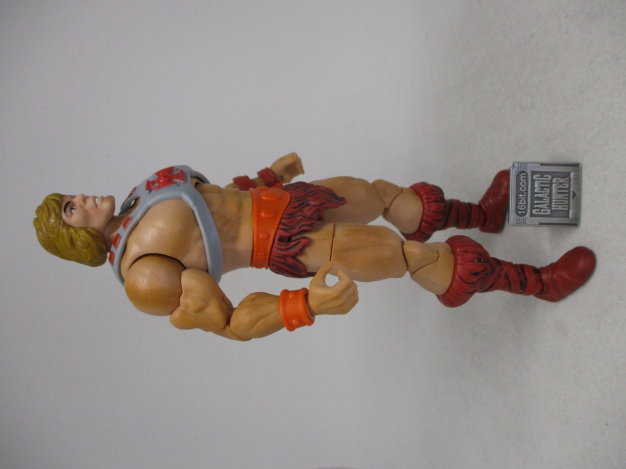 The older figures tended to have exaggerated heads and hands, plus a giant chest and a small waist. This one has slightly better human proportions with rock-hard abs, we;;-defined muscles, and a skin texture I could only describe as "plastic." It's like a toy - you've no doubt had any number of hard plastic toys with a similar pattern, so it's not smooth like most of Mattel's other lines. The boots and loincloth are a reddish brown, with a black wash over them that I don't particularly like. He has armor on his wrists, and of course the harness over his chest, all colored to recall the original 1982 action figure.