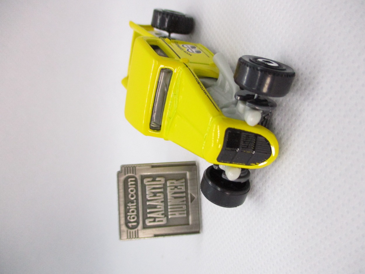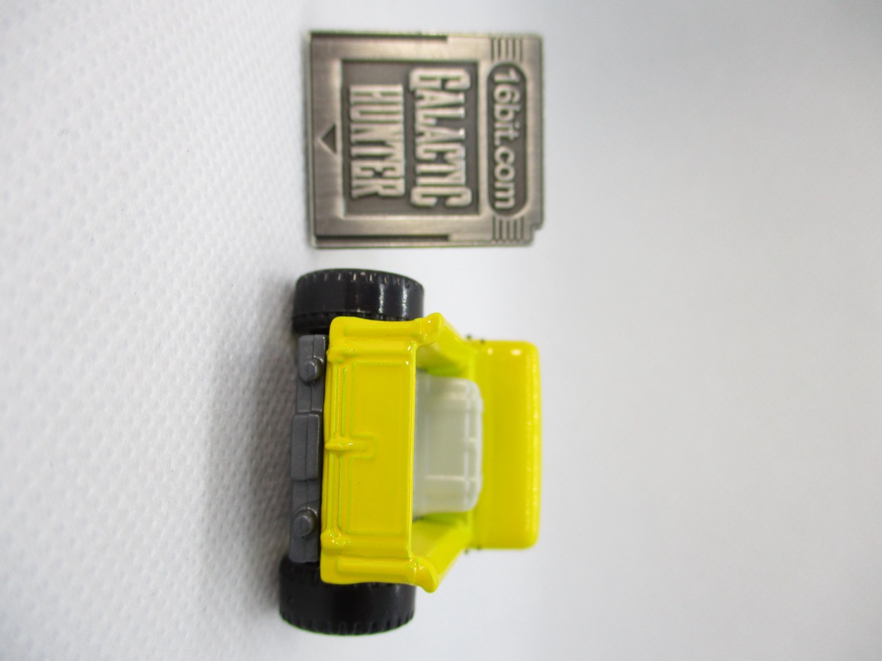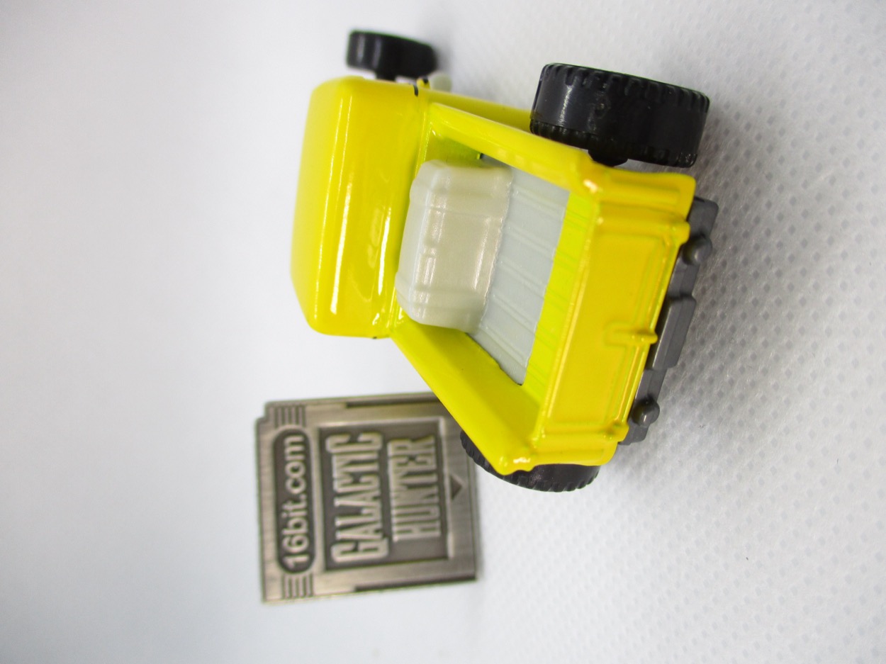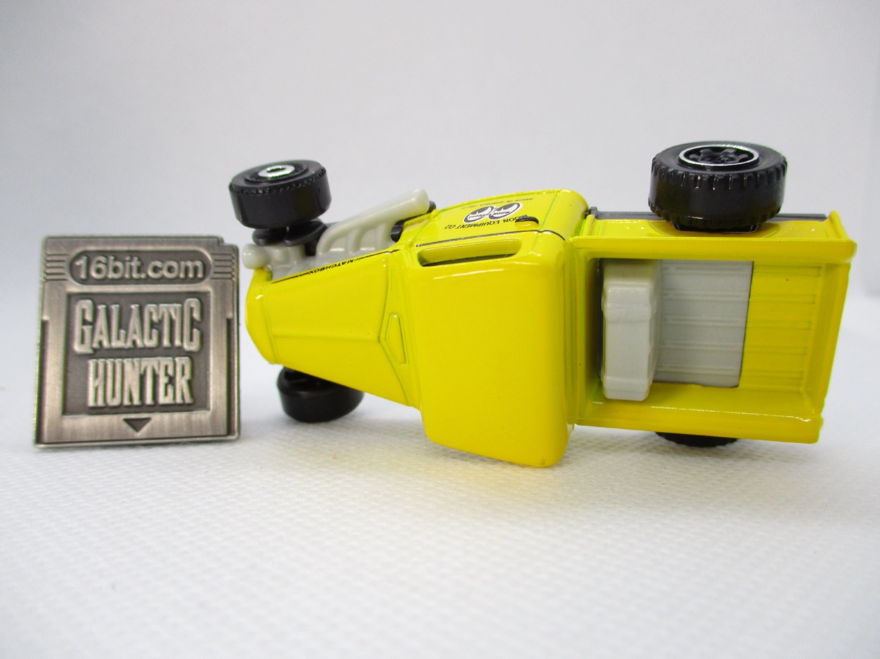You can see a tool chest in the truck bed, which itself is sculpted fairly well. I love the striping along the doors and the absolutely tiny lettering on the sides - the paint quality on the 1:64 toy car space is nothing if not impressive. The yellow paint is mostly evenly applied, but you can see spots where it's a little thinner than might be ideal. That's not atypical when you're looking at cheaper toys with a brightly colored paint over a dark plastic or metal material - they'd need another coat to prevent hints of the metal from peering through. At this price (in this economy) that's just not likely.