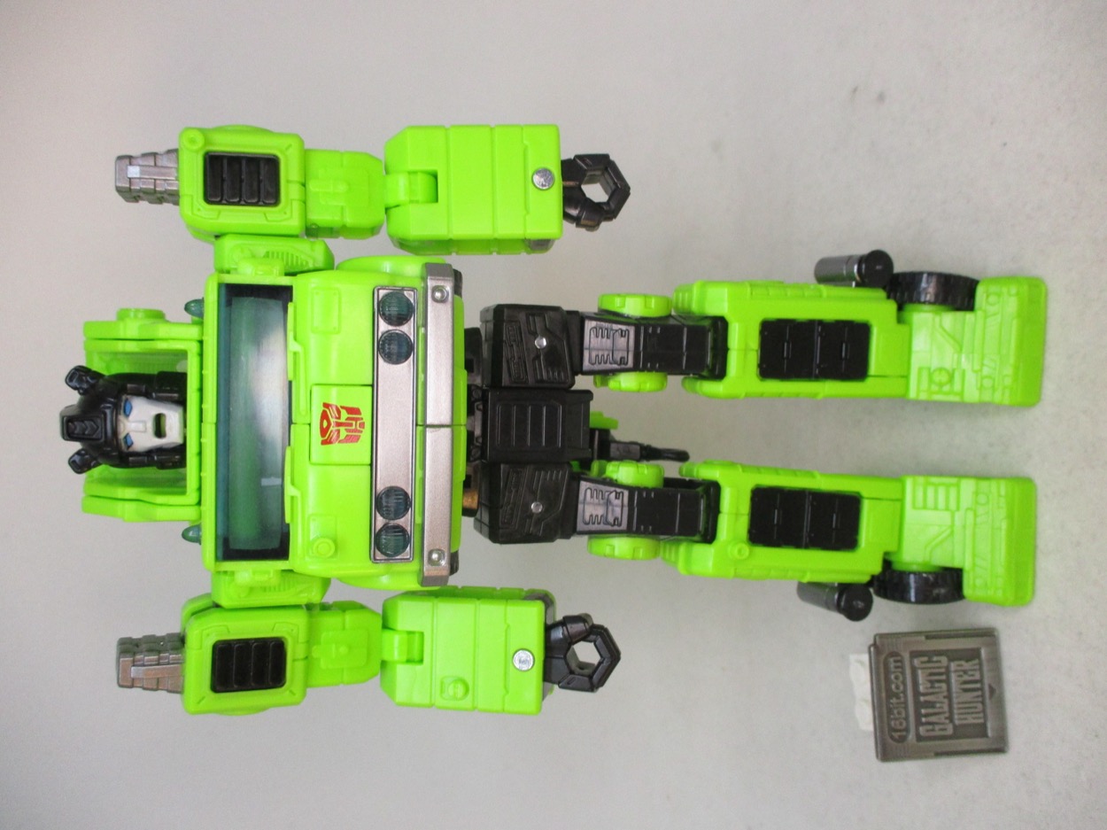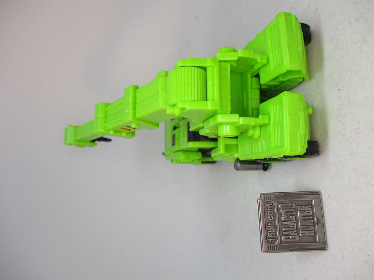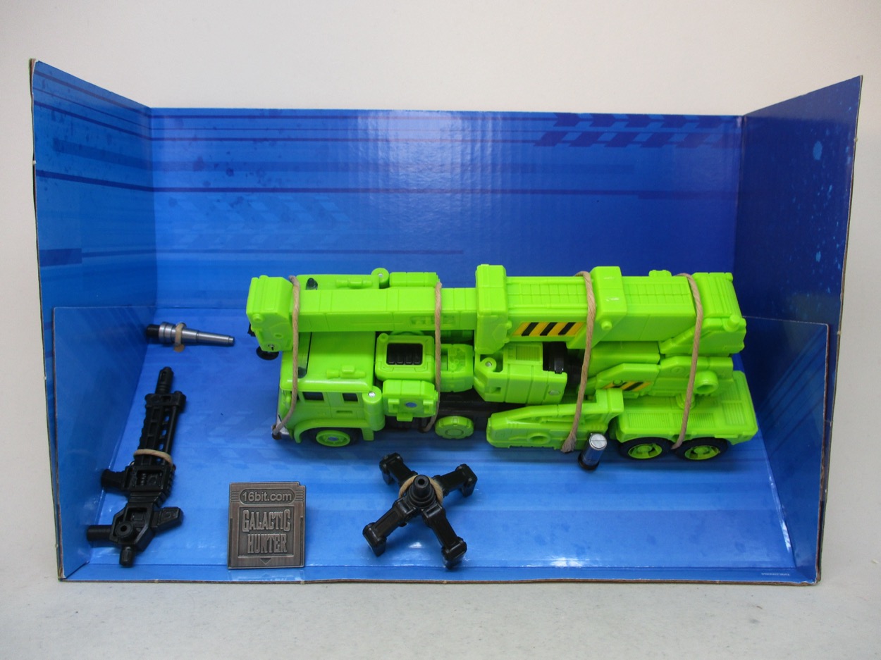 While long gone from my area, and after its subsequent stop at Ross on extreme clearance, it's a good figure. The robot mode has great black and yellow markings plus a green color that's right at home with Devastator or some of the other Constructicon-esque figures. Of course, fans know this figure predates the six green guys because he appeared in "More Than Meets the Eye Part 1" way back in 1984. Granted, he was orange there, but that's Takara for you - they wanted a new character and by gum, they made one. This figure is actually a pretty fantastic robot, standing about 6 1/2-inches tall and with lots of places to store accessories. There are sockets for his alternate hands - a claw, or a nozzle - plus a place to connect his blaster.