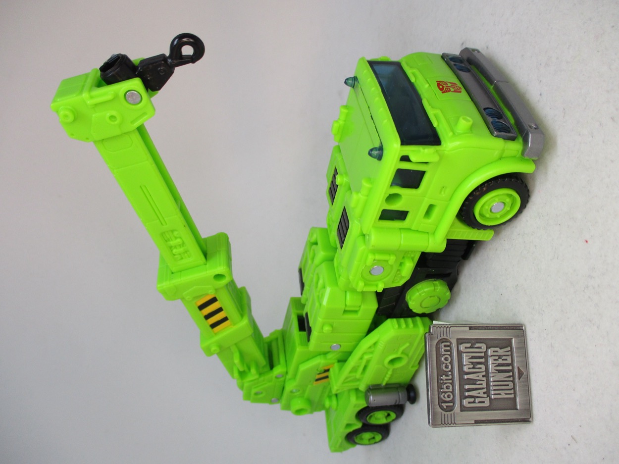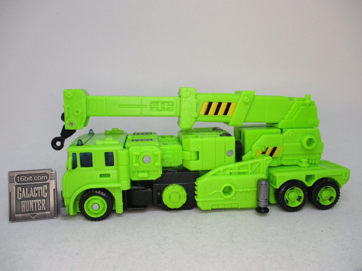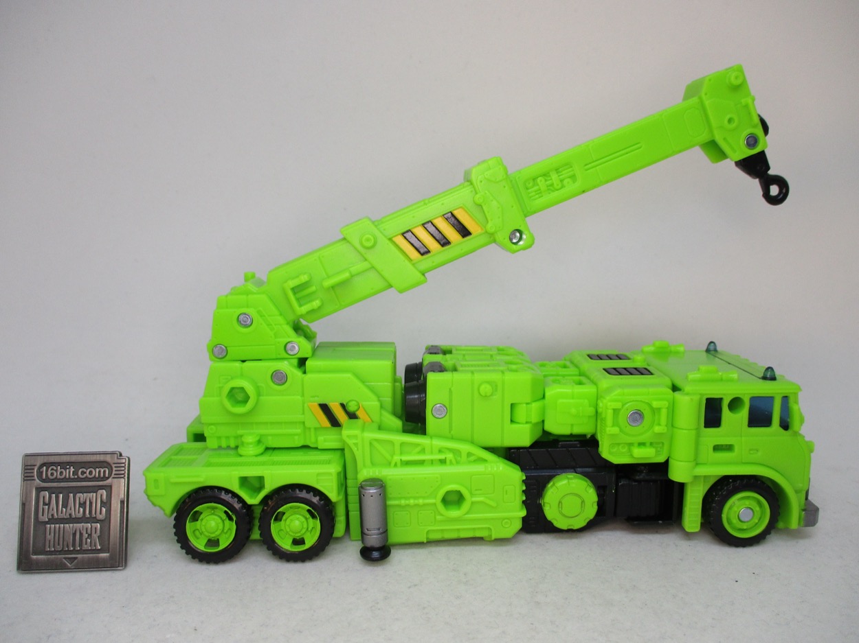 As a truck, it does the unthinkable: it's a toy! The crane goes up and down with a jointed hook, and the boom arm can telescope in and out. It swivels too! You can add a claw tool on the hook if you like, and there's an attachment there to tow or pick up select Earthrise vehicles. You can store the gear on the sides, and it rolls about as well as you can expect. The wheels aren't amazing, but at least they look good. You have transparent windows and matching lights, too. I'd say this figure looks exactly as good as you might hope.