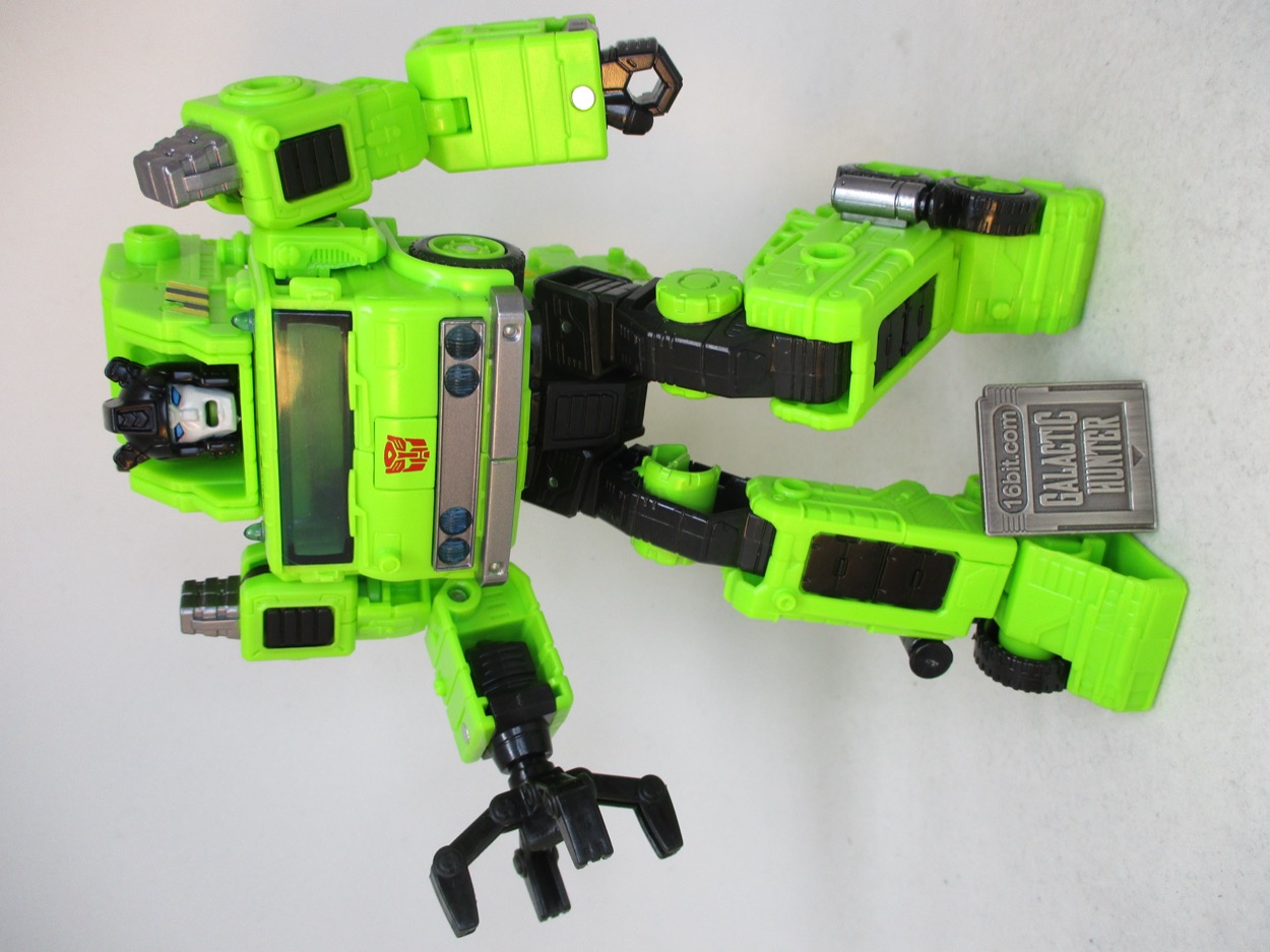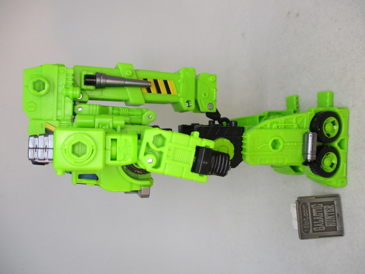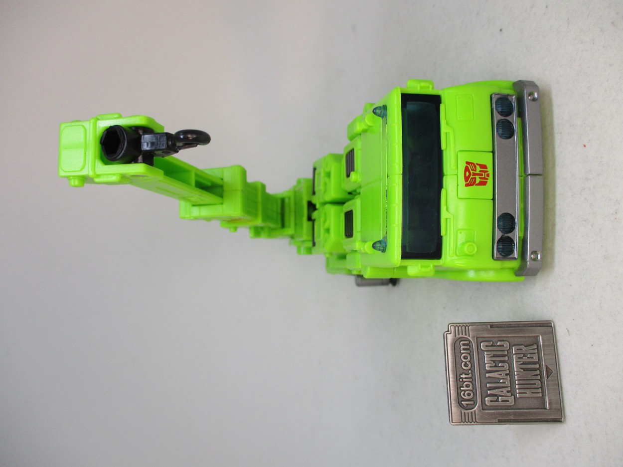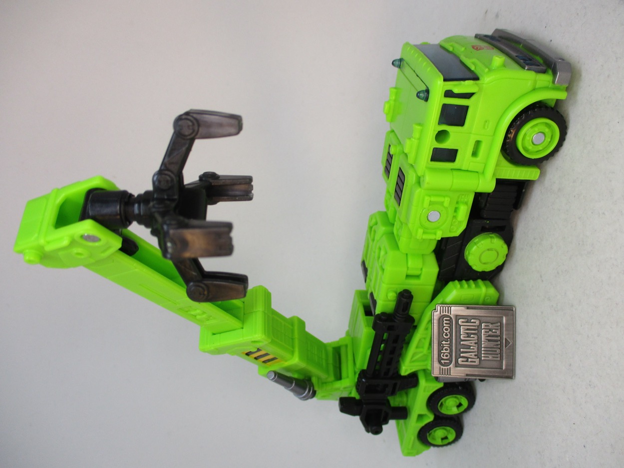 As a truck, it does the unthinkable: it's a toy! The crane goes up and down with a jointed hook, and the boom arm can telescope in and out. It swivels too! You can add a claw tool on the hook if you like, and there's an attachment there to tow or pick up select Earthrise vehicles. You can store the gear on the sides, and it rolls about as well as you can expect. The wheels aren't amazing, but at least they look good. You have transparent windows and matching lights, too. I'd say this figure looks exactly as good as you might hope.