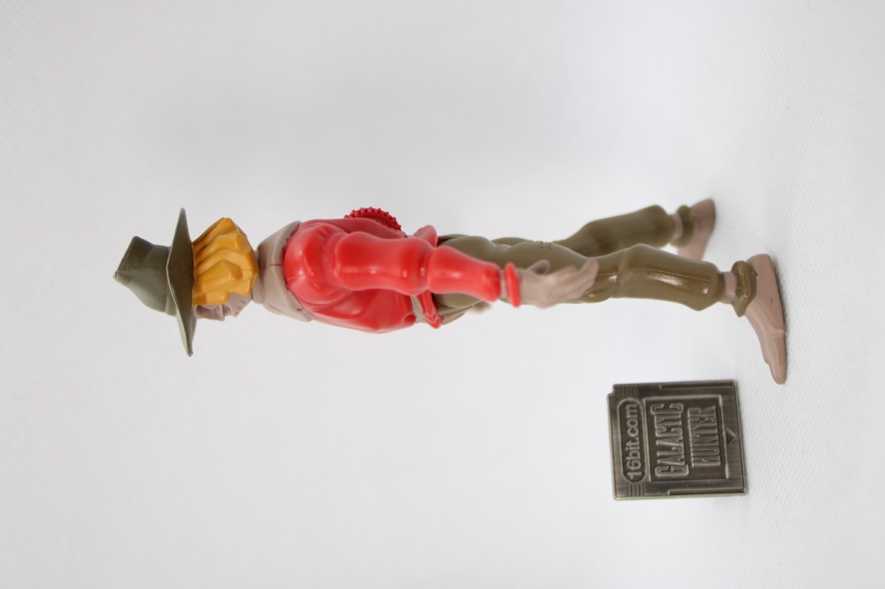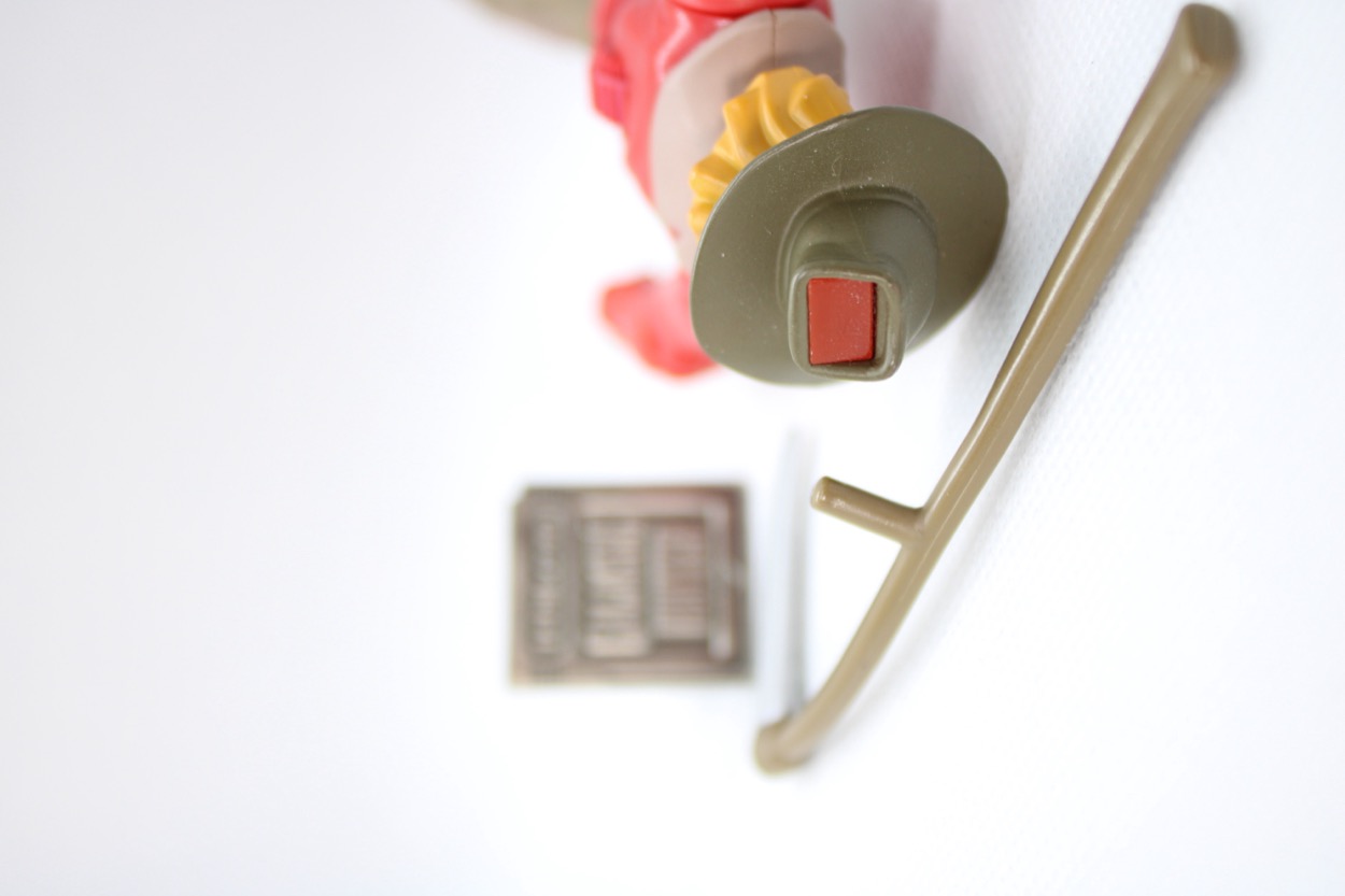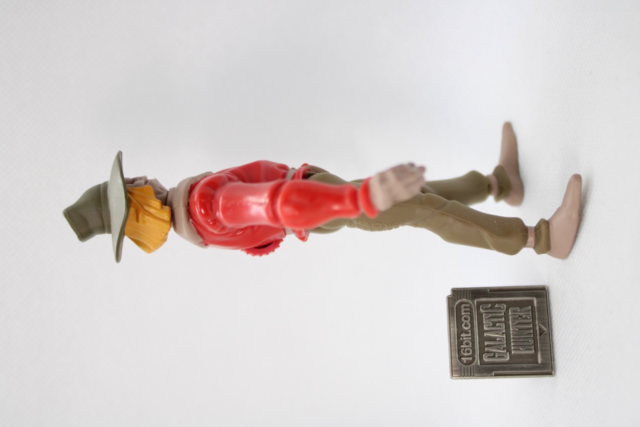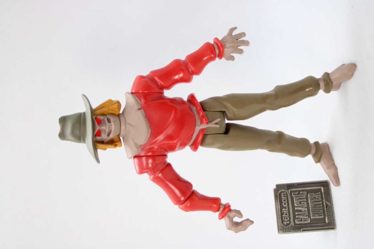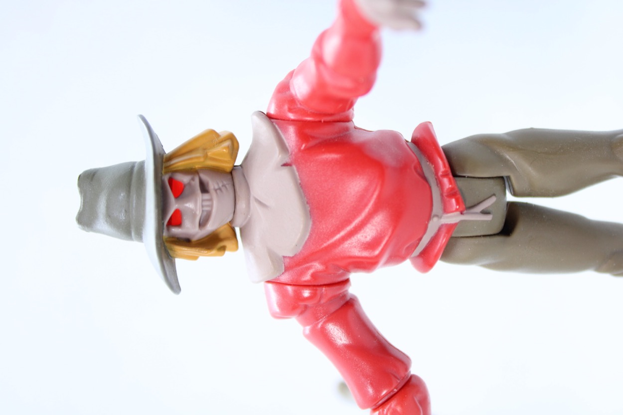 Kenner gave this guy a great sculpt, with rarely-seen features like separately molded fingers on his left hand, plus a wheel on his back that caused his right arm to spin at the elbow. The figure even had "scary" light-up red eyes thanks to a well-placed port on top of his head, rather than the use of LEDs and a small batter - although we'd see more toys using those just after this release, especially in Transformers. Kenner made this guy a tiny bit less skeletal, beefing him up a bit and retaining the basic shapes and colors from the cartoon. It's close enough - you get the bag over the head, the straw hair, the hat, and the creepy grin. If you look carefully, you can see some sculpted stitching under his chin too, with a rope tied around his waist, big worn shoes, and ropes to keep his sleeves and pants together. In the toy landscape of his day, he was an unusual-looking toy and none of his features got in the way of how cool he looked.