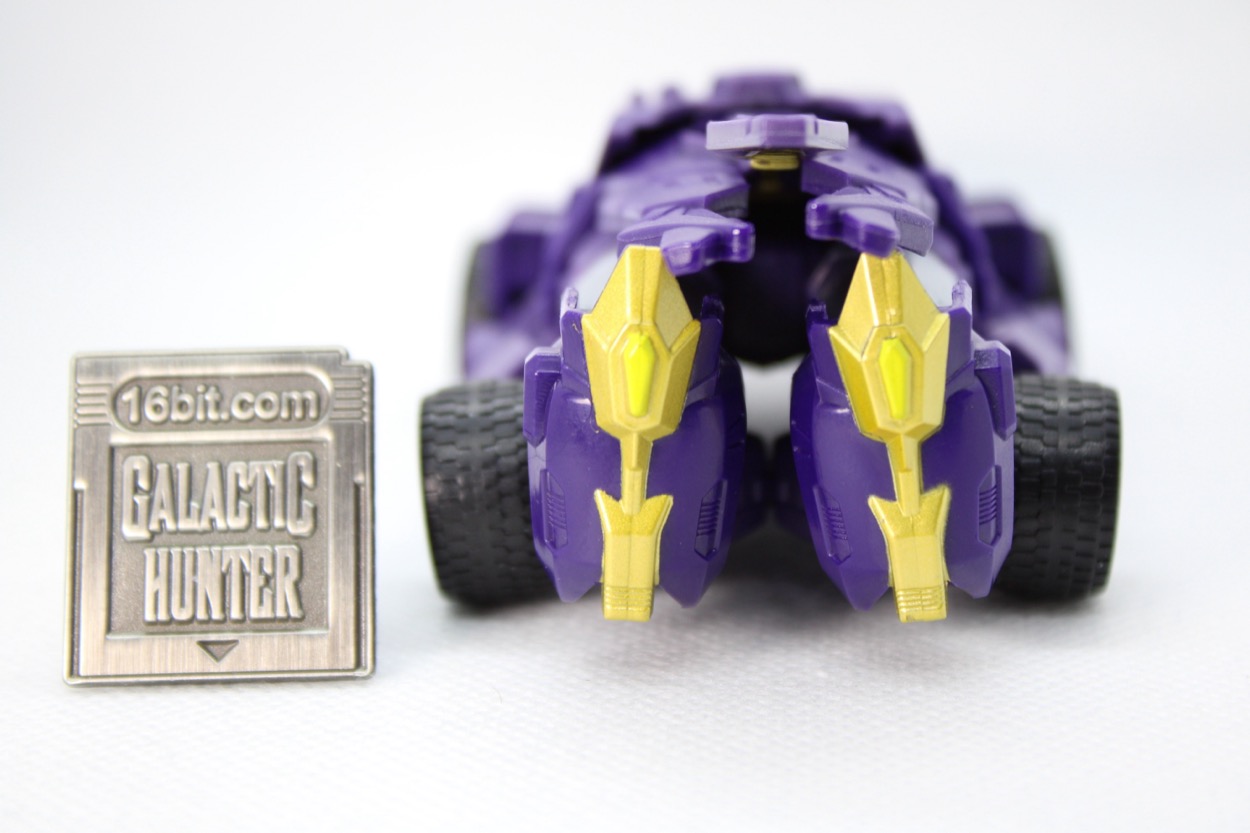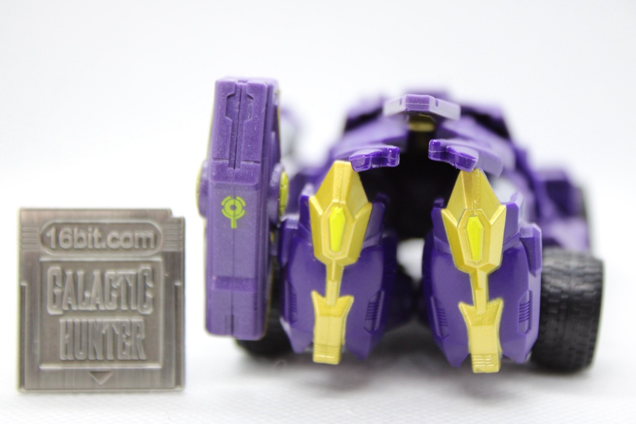 Her robot shoulders become two very clashy elements on the front of the truck, which is so odd given that they don't look good as shoulder pads and they don't look good as car bits. At first glance it looks like feet on the sides of the truck, but they aren't feet. Due to its small size, you can see where the money went - visible robot bits make up the back half of the vehicle, which looks acceptable at certain angles. There are painted gold windows (which, for a space vehicle with no driver, may not have been necessary) and painted silver wheels. I like the sculpted greeblies and vents, as all the choices seem to be not-too-over-the-top and you can tell it belongs in the same continuity as Kup or many of the other sci-fi vehicles. It won't convince anyone that it's a real vehicle, though.