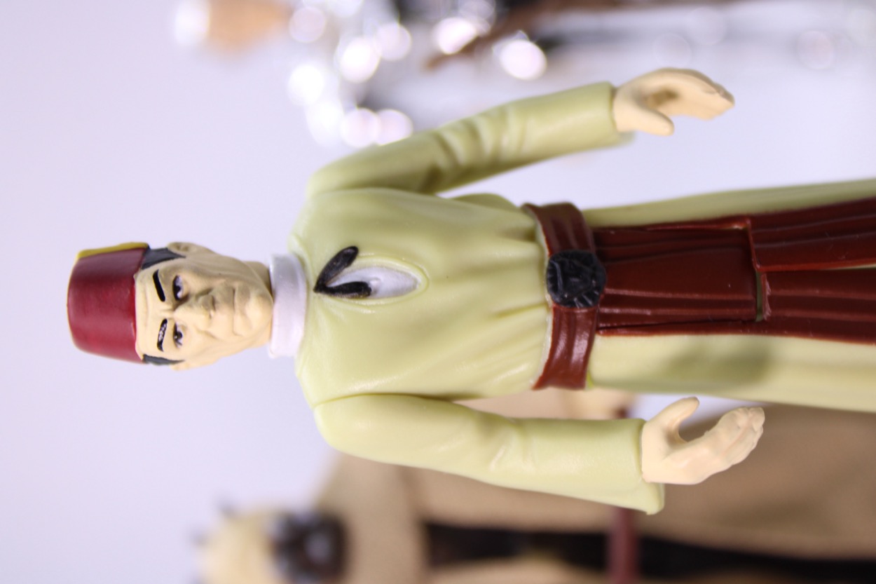 The toymakers of the past 90ish years tended to make the monsters - you got a werewolf, not Lon Chaney Jr. The artwork of this figure hints at a transformation, but what you're getting is a costume Boris Karloff wore, and a swell hat. I like the outfit, I like the general vibe, but the face deco does not help him read as Karloffy to me. Your mileage may vary.