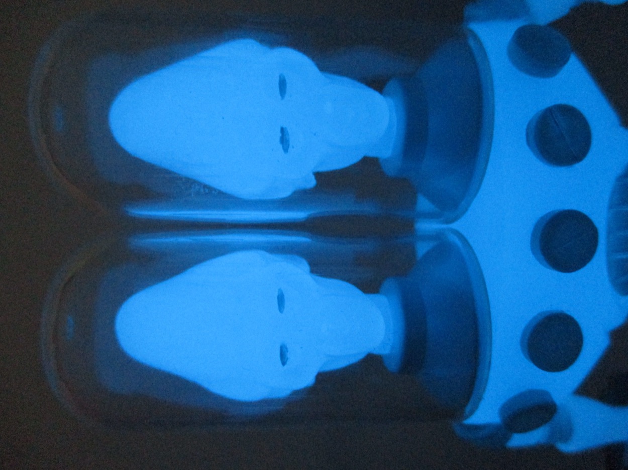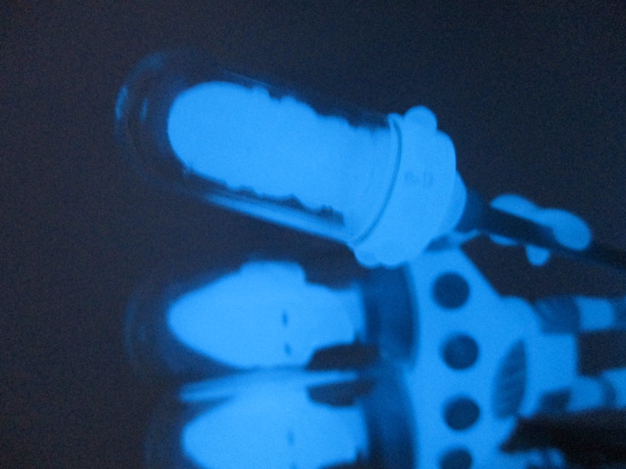 Gemini has had at least three fully-painted versions to date, three clear versions, and also three opaque versions - the aforementioned White Star, Bluestar, and Cosmic Radiation [FOTD #1,615]. This one glows in a nice blue color, and if properly charged it can last for hours. I don't mean "three or four hours," I mean "you can charge it, go to bed, and it's still glowing in the morning." Blue Glyos plastic is magic.