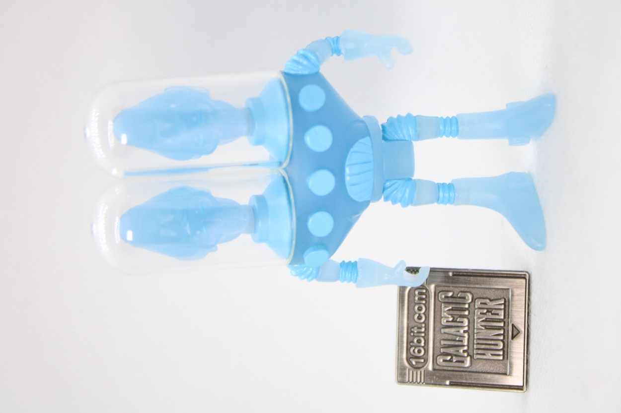 The 3 1/4-inch scale alien is gifted with two - technically three - clear bubble helmets. Each head has one, including the two-faced head on his staff. The figure is made of several parts, including ten plugs on his chest. The arms are swappable, as the baggie includes bent and straight arms. The legs swivel, the wrists and ankles swivel, but he's pretty top-heavy thanks to the massive chest required to support two heads. Each head is rather pointy, with noses, chins, and ears that are on theme. His eyes are a little squinty, and everything looks like it came out of the late 1960s. The reason for this is that the original unreleased prototype for this figure would have been released around 1970. Sadly, landing on the moon ruined the desire for space toys because there were no little green men to be found.