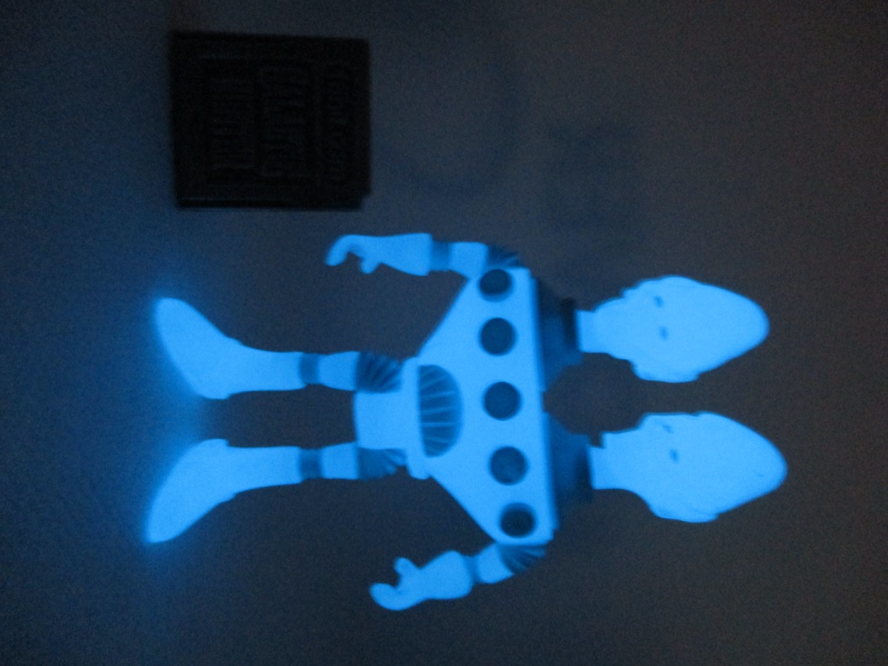 The figure's basic design is the same as the rest of the line, with a tight space suit peppered by faux accordion joints to represent the bendable parts of the original 1960s Colorforms figure designs. For this release, the figure was cast entirely in glow-in-the-dark blue plastic with a few painted bits on the joints accessories, and eyes. It's pretty simple. The blue glow plastic absorbs a lot of light - and therefore, detail - but you can still make out the wrinkles and the shapes that make him (them?) up.