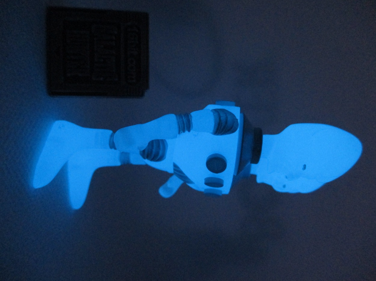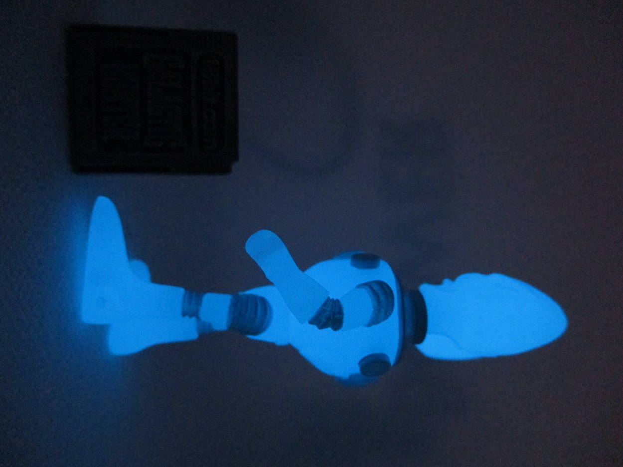 As I've mentioned previously, the Glyos-compatible figure can pop apart at every single joint. This allows you to swap parts with other figures from this and other lines, like Callgrim or Onell Design's Glyos System Series. What's particularly wonderful about all Glyos figures with glowing elements is how bright they can be, or how long they can last. The blue glow plastic, if charged for a brief period of time, can last all night long and into the morning. It won't be bright blue, but in a dark closet you can still see it dimly shining after 8-10 hours.