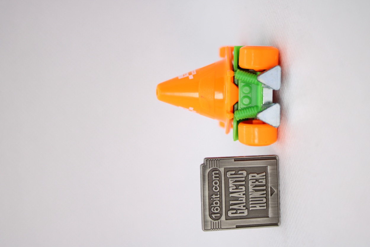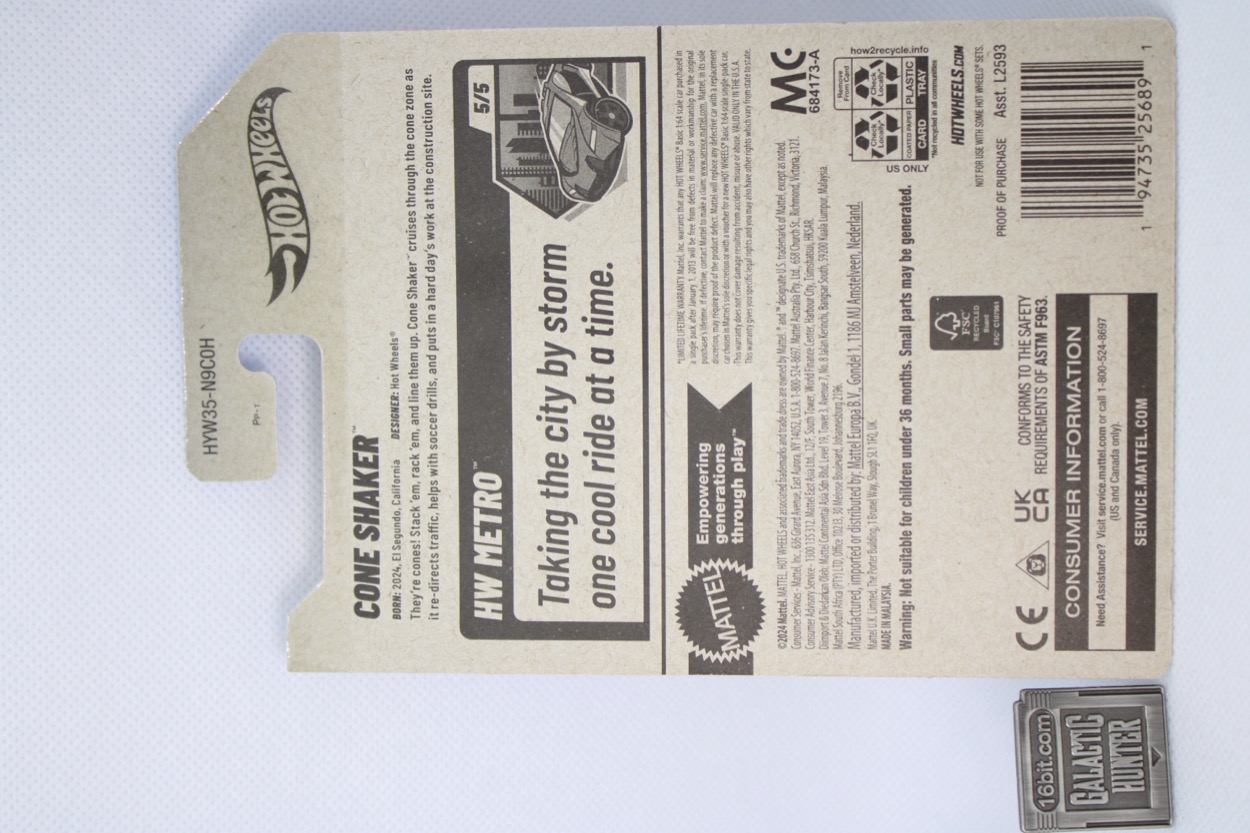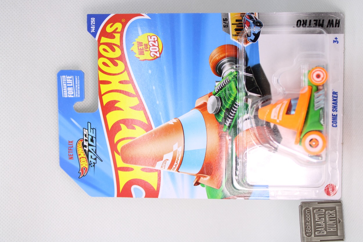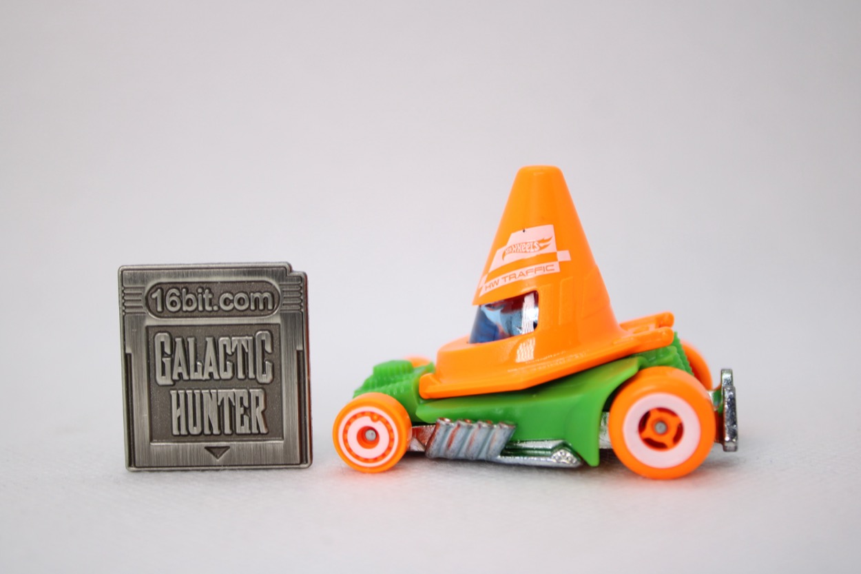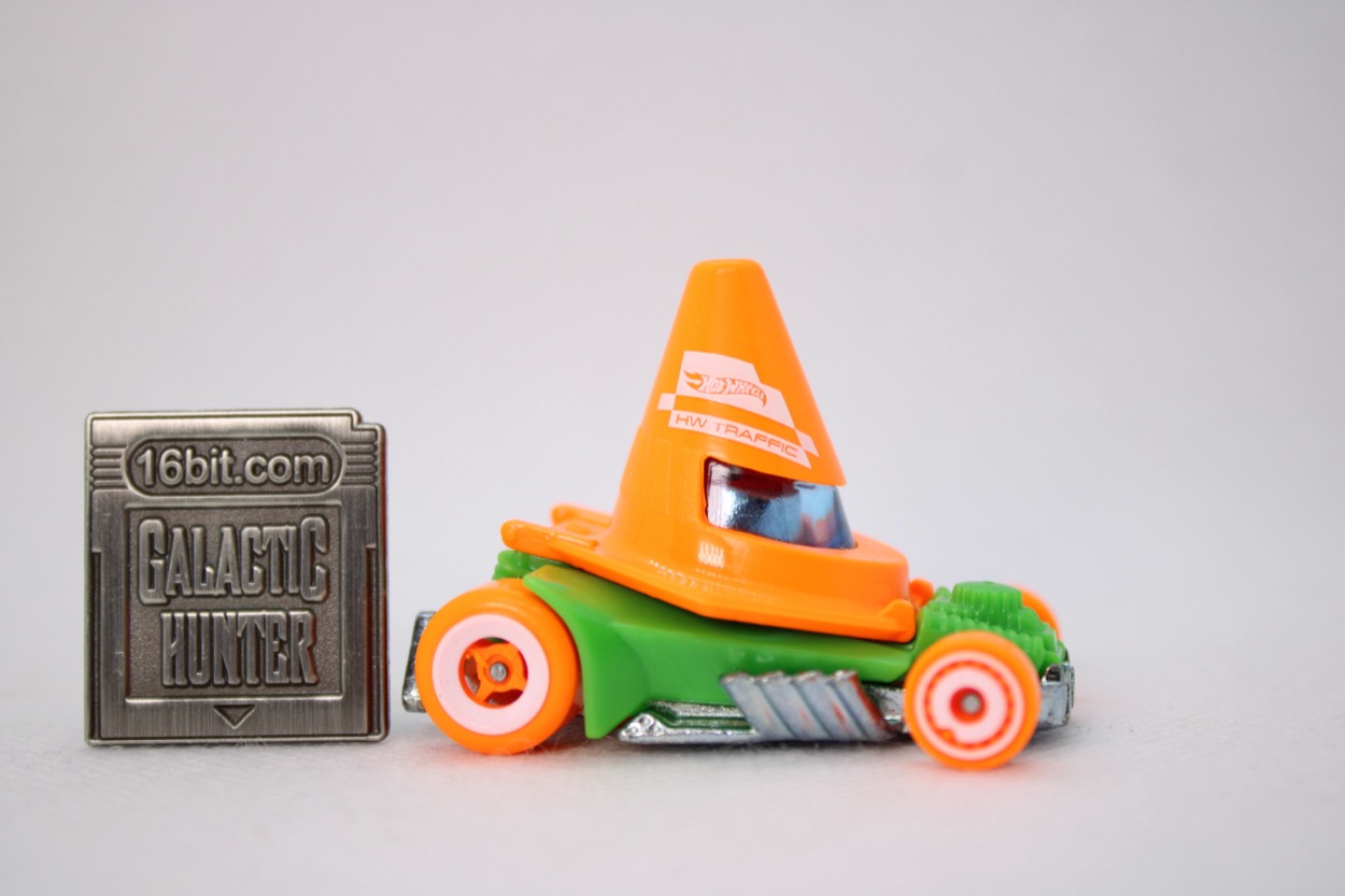Mattel Hot Wheels Cone Shaker Die-Cast Metal VehicleA riff on an old name, the Cone Shaker recalls the popular Bone Shaker skull-infused car while being its own thing. The very bright orange cone really looks amazing in person, with HW TRAFFIC on the sides. It's a plastic orange cone as a car, with a hole on the bottom so you can stack them if you have multiples. Clever.